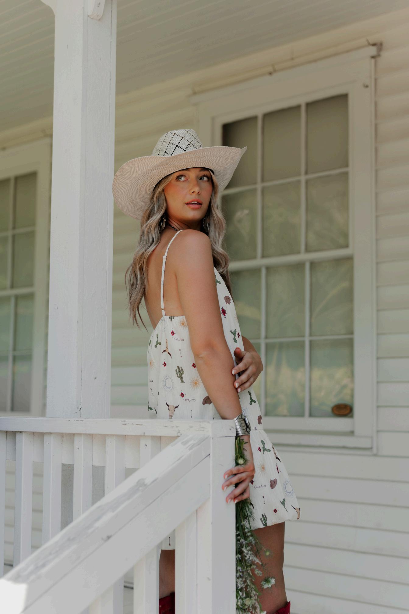 Cowgirl Chic all the way over here! Featuring a bubble hem style, adjustable straps and a dainty western print, you can’t go wrong with this lil number. Style it up with wedges or boots. Kjersti is rocking this look no doubt!