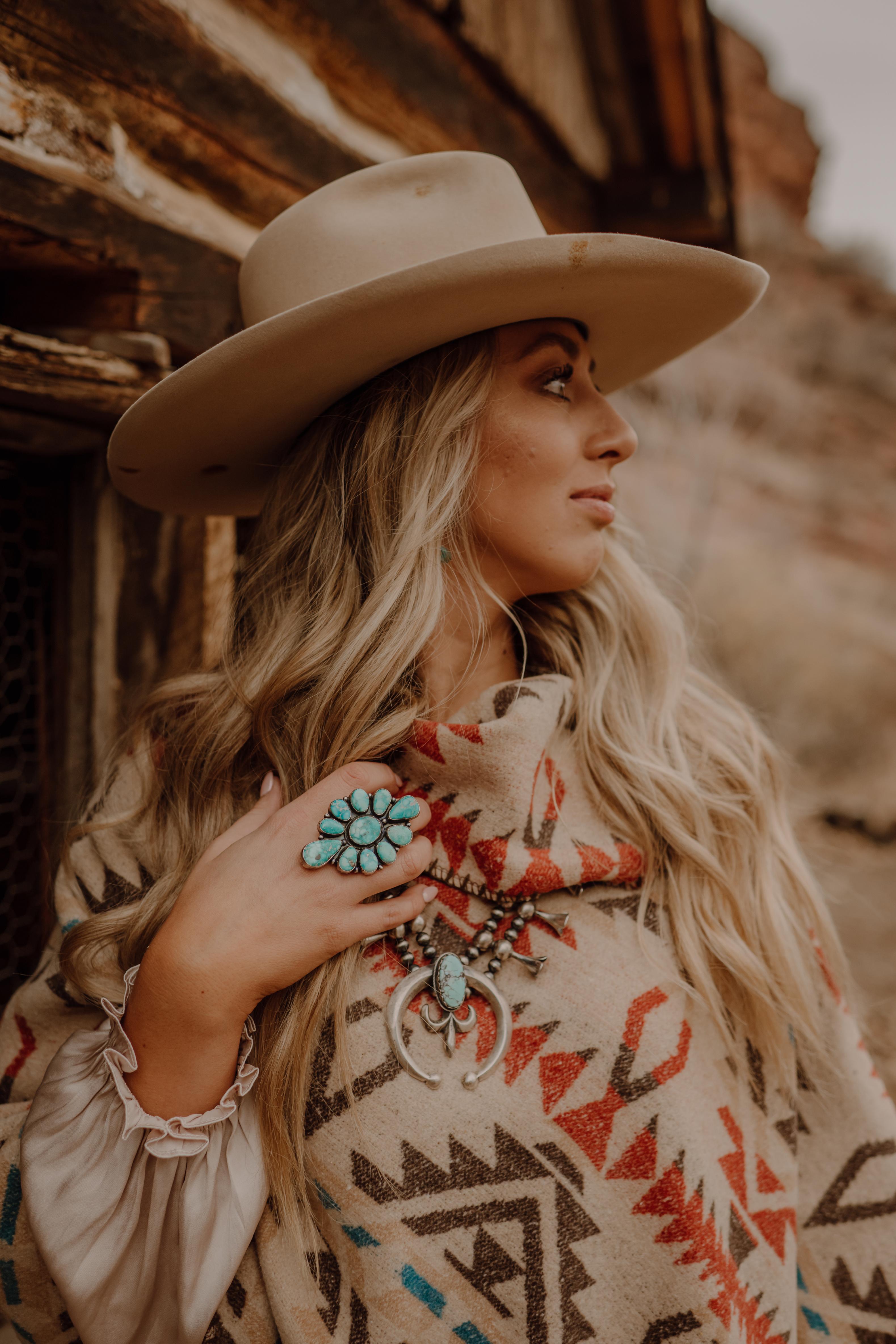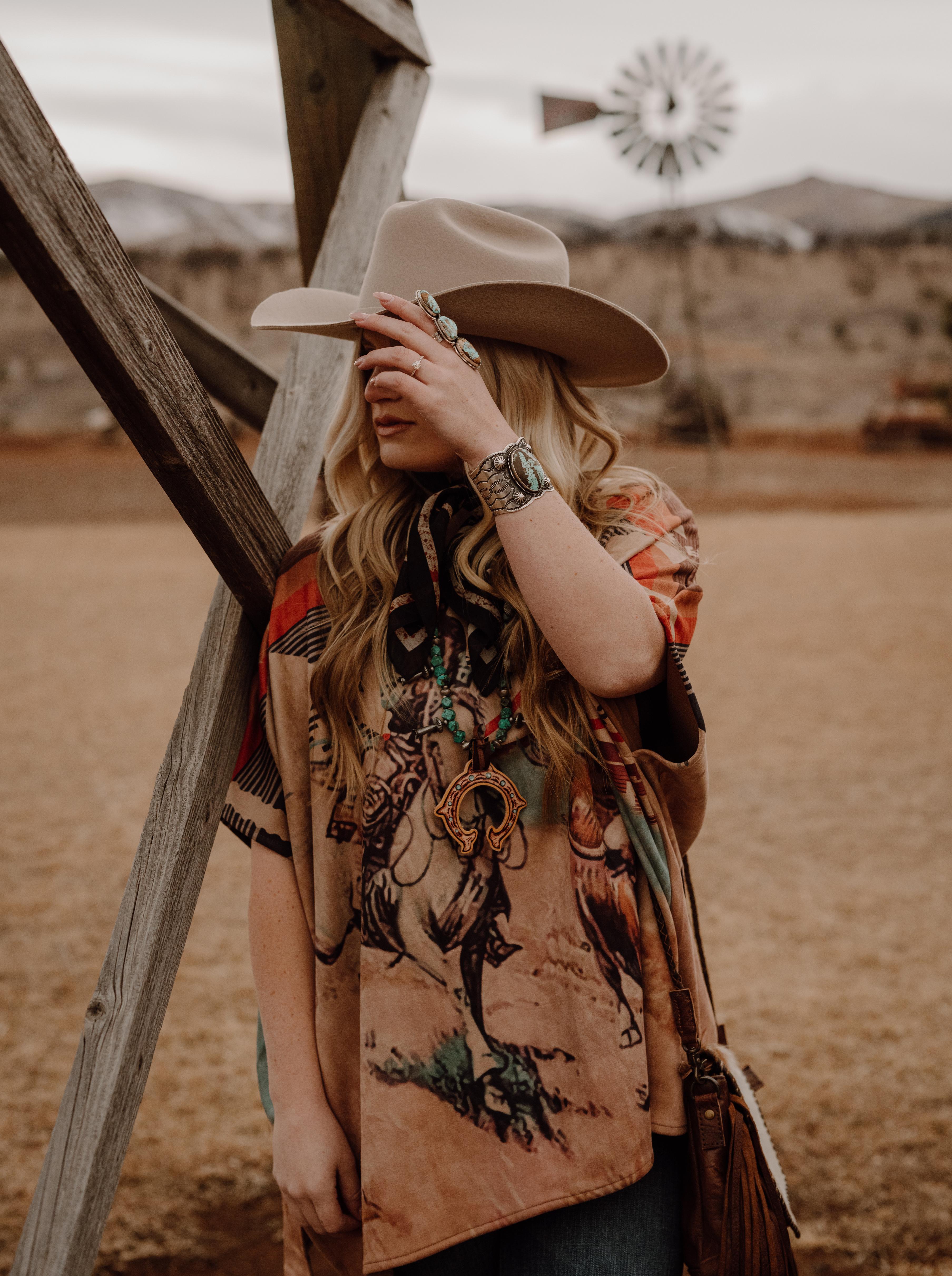 WREN HAS PAIRED THE {COLSON CAPE} WITH A TALL PAIR OF BOOTS, A COWBOY HAT, AND OF COURSE, SOME STERLING SILVER!