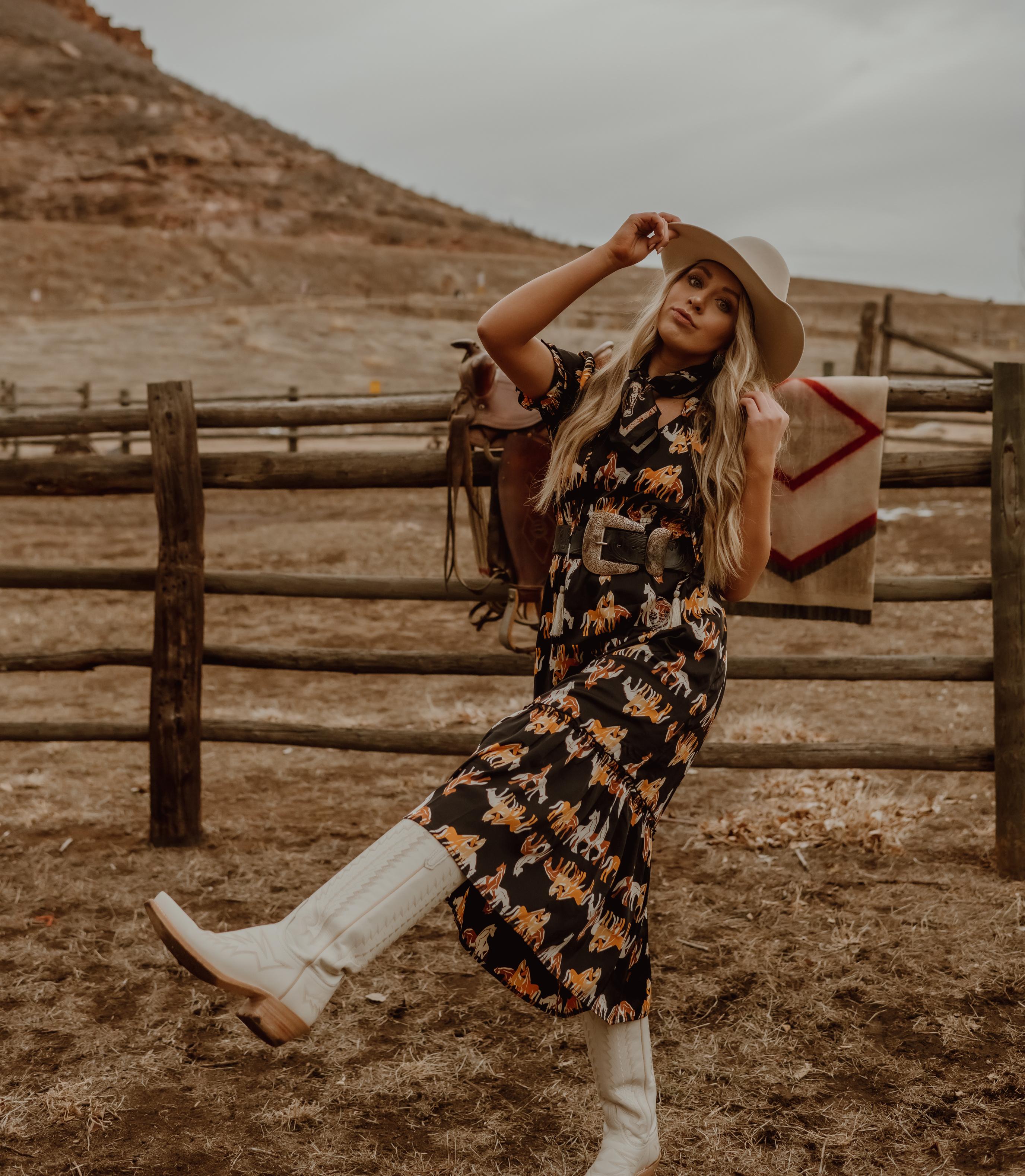 If you haven't figured it out yet, clearly {Horse Prints} are totally in I'm dreaming up all the ways you can style our dress above, man she'd sure be cute with a fun lil' fringe jacket over! Brook has paired this number with our {Branded Wild Rag}.