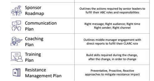 ● Also include training about change management in this plan: Sponsors and people managers need training to understand their important roles and responsibilities in managing change
