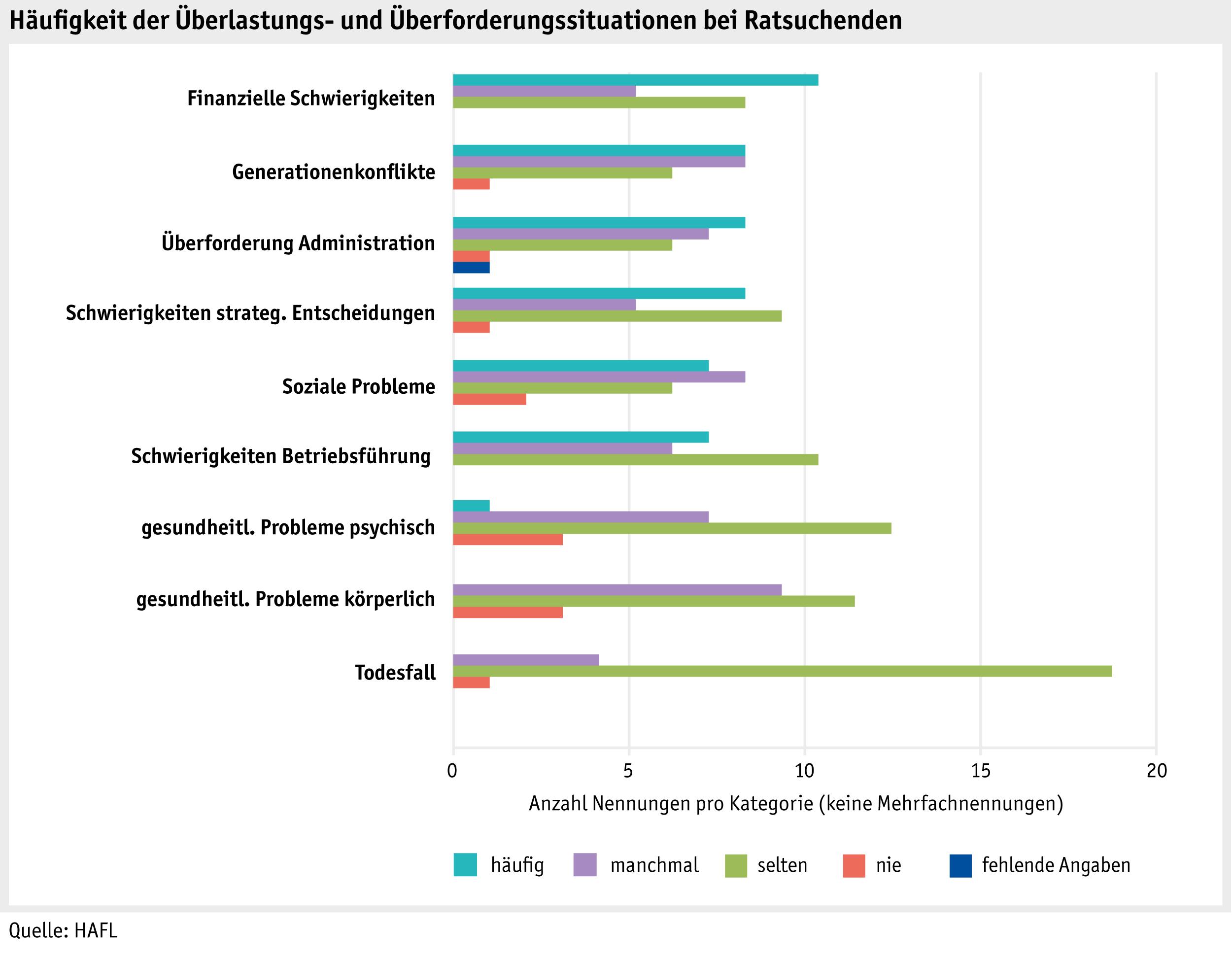 Häufigkeit, mit welcher Überlastungs- und Überforderungssituationen bei Ratsuchenden beobachtet werden (N=23)Keine Mehrfachnennungen pro Institution und KategorieQuelle: HAFL