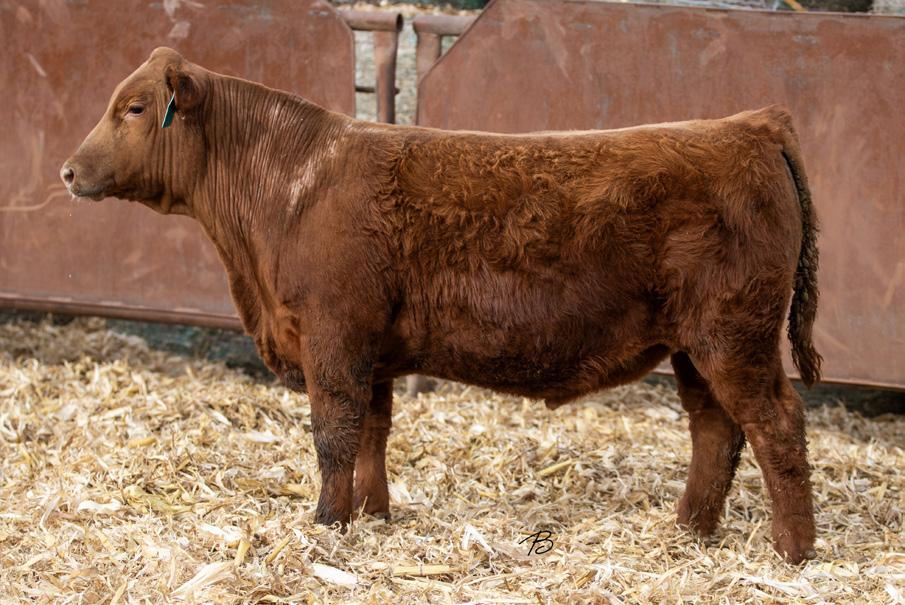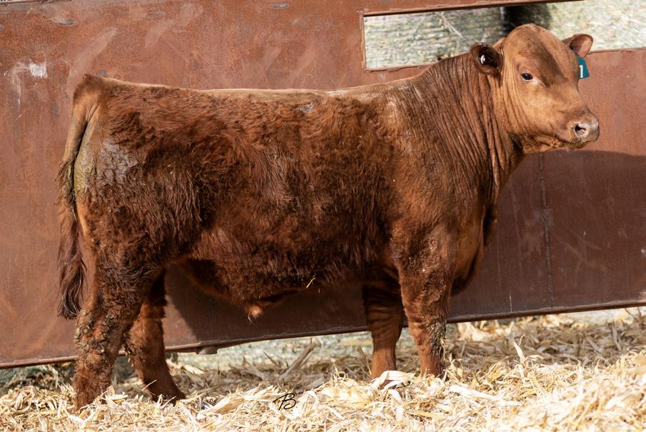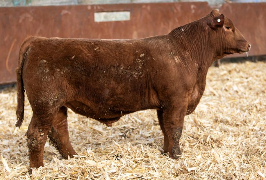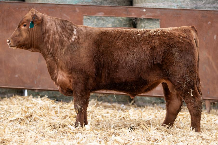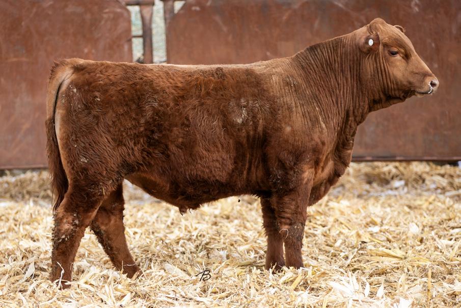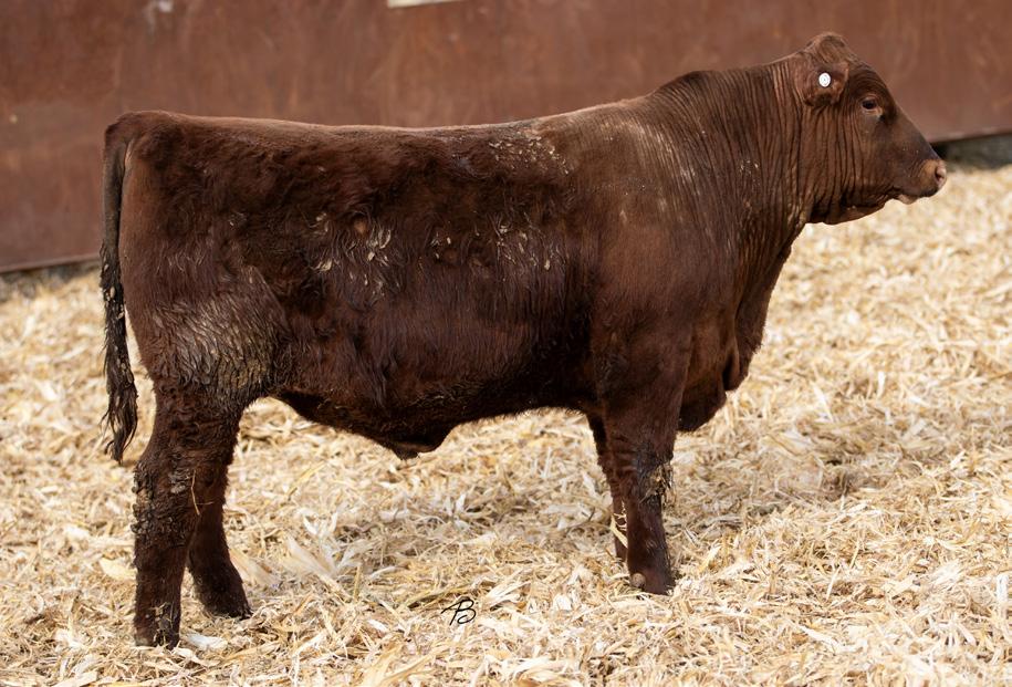 One of 2 commercial bulls on the sale, this red CRAR Domain 44F son is a stout made bull. He has a lot of thickness from his top to his lower 1/3. He strides out with a good solid foot and has some extension in his front end.