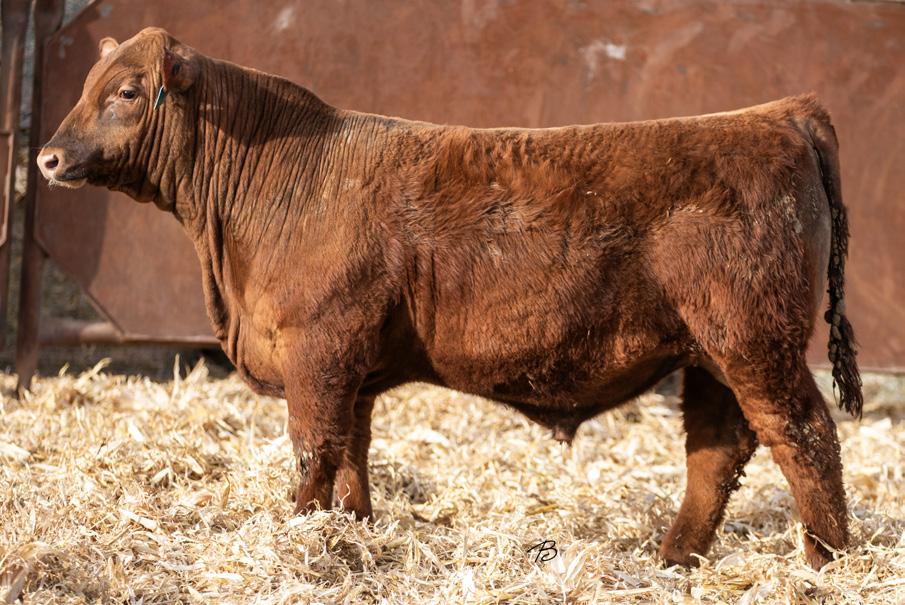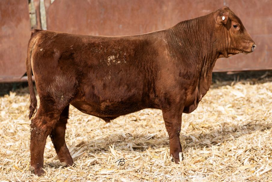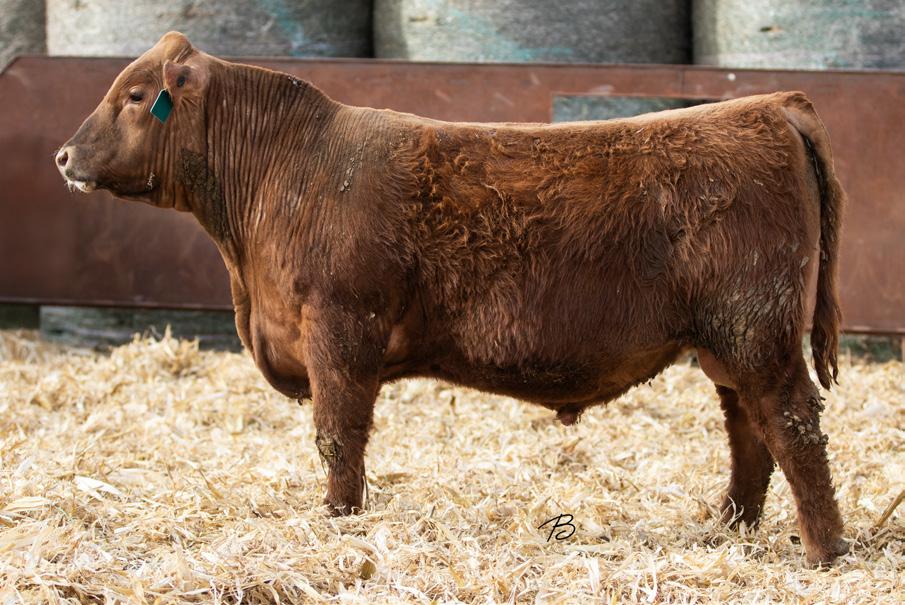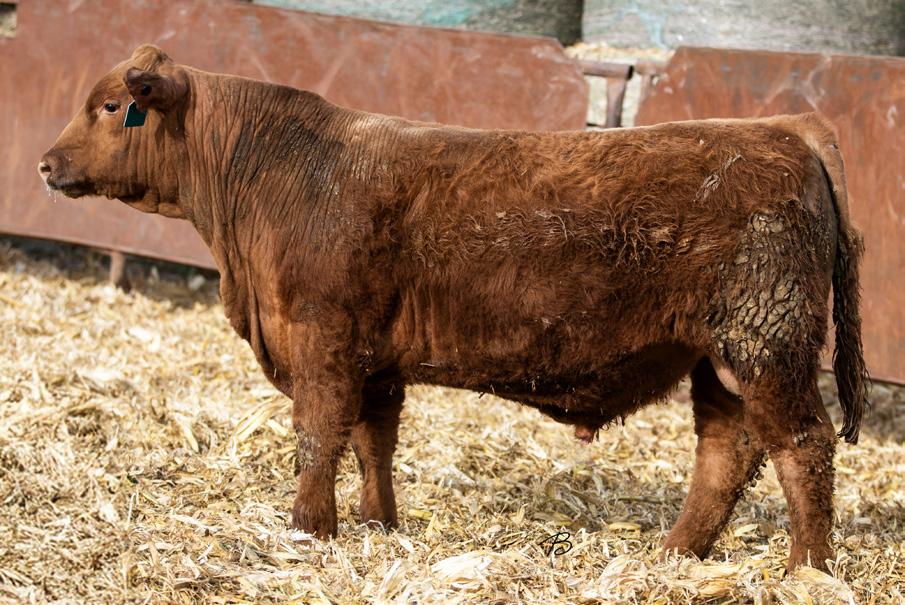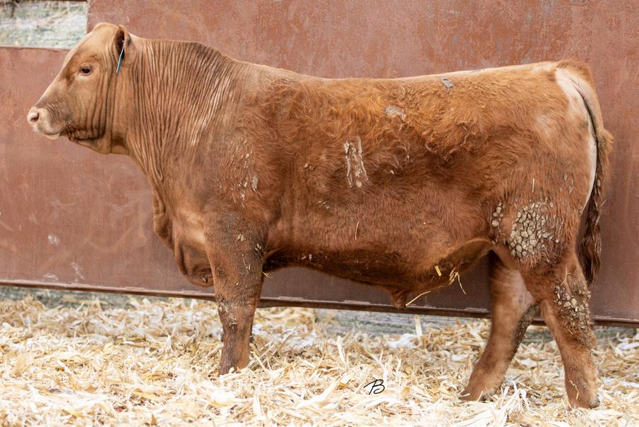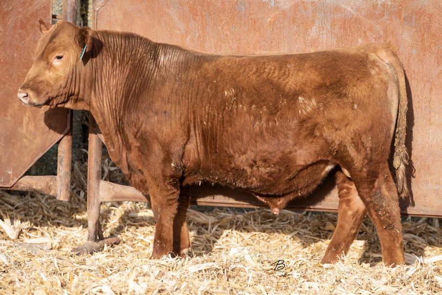 One of 2 commercial bulls on the sale, this red CRAR Domain 44F son is a stout made bull. He has a lot of thickness from his top to his lower 1/3. He strides out with a good solid foot and has some extension in his front end.