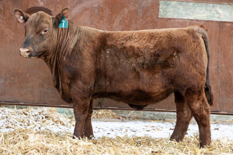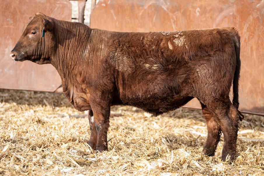 Dark cherry red bull with a lot of natural thickness over the top. This bull is deep chested and level hipped with a large scrotal size. He will be a great addition to be used on cows.