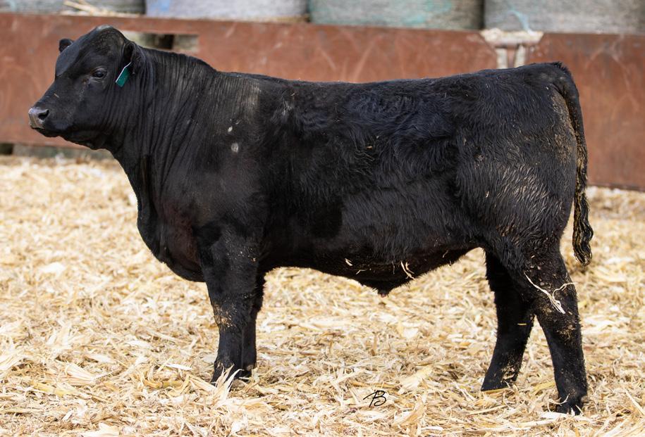 Weaning off at 608 lbs last fall, this Relentless son out of a first calf heifer is showing off. He gained well without any creep and stands on sound, large feet. He has a lot of depth and moves well for a larger framed bull. He has strong values in ProS, HB and GM as well as top 1% Marbling.