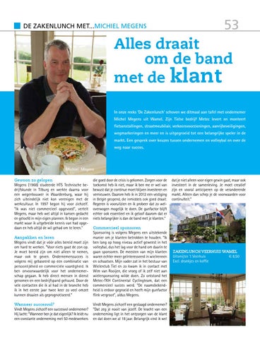 Michiel Megens Gewoon zo gelopen Megens (1968) studeerde HTS Technische bedrijfskunde in Tilburg en werkte daarna voor een wegenbouwer in Waardenburg, waar hij zich uiteindelijk niet kon verenigen met de werkcultuur. In 1997 begon hij voor zichzelf. “Ik was niet commercieel opgevoed”, vertelt Megens, maar heb wel altijd in kansen gedacht en geloofd in mijn eigen plannen. Ik begon in een markt waar ik uitgebreide kennis van had opgedaan en heb altijd de wil gehad om te leren.”