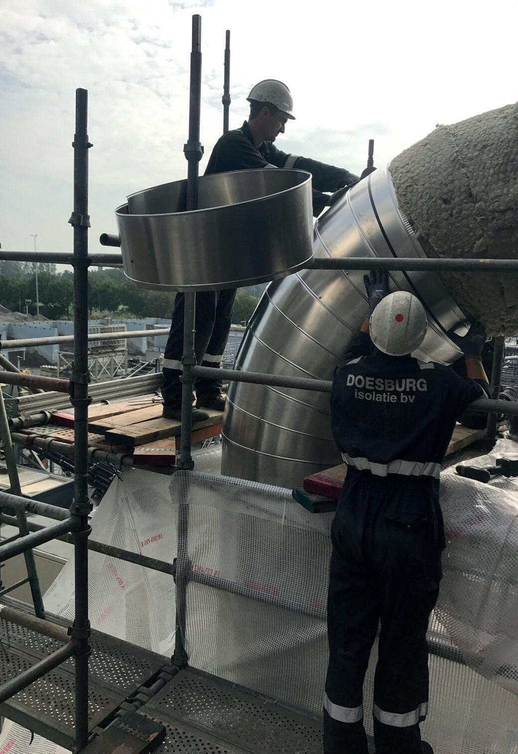voldoen aan UV-bestendigheid. Maar de gemeente Beverwijk stelde meer eisen: behalve de koude leidingen (90% van de installatie) was het handig om ook de warmteleidingen met één isolatiesysteem uit te voeren. Bovendien moest het isolatiemateriaal duurzaam zijn en tegen een stootje kunnen. Op advies van Isolatie Combinatie Beverwijk kwam de gemeente uit bij de TECLIT koude-isolatie van ROCKWOOL. Deze isolatieproducten voldoen aan alle bovengenoemde eisen. TECLIT is uitermate geschikt voor temperaturen tussen 0 °C en 250 °C en bestand tegen UV-straling. Dankzij de hoge vormstabiliteit en drukvastheid zijn de pijpschalen en lamellendekens