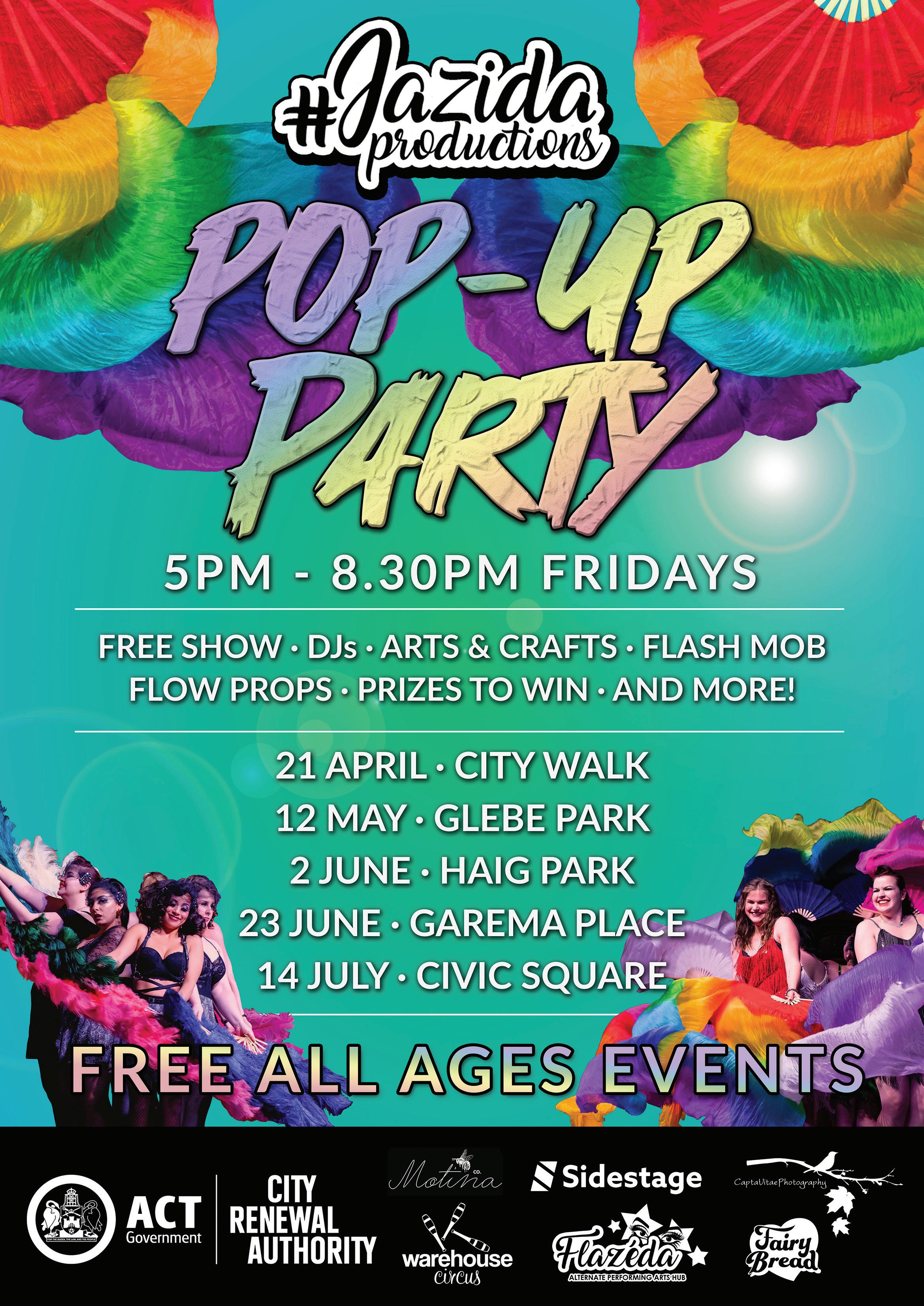 The Jazida Productions Pop-Up Parties will be a recurring event every three weeks on Fridays between 12 April and 14 July running from 5pm – 8:30pm, offering live performances from award winning artists. There will be interactive arts and crafts, play with flow and circus props, fire eating, fire dancing, sideshow performances, circus, drag, cabaret, and fan dancing. Each Pop-Up Party includes a 1.5 hour cabaret show, with a rotating cast of performers for each area. There will also be a DJ Dance Party one hour before and after each show! See Jazida Productions Pop-Up Parties Facebook page for more info