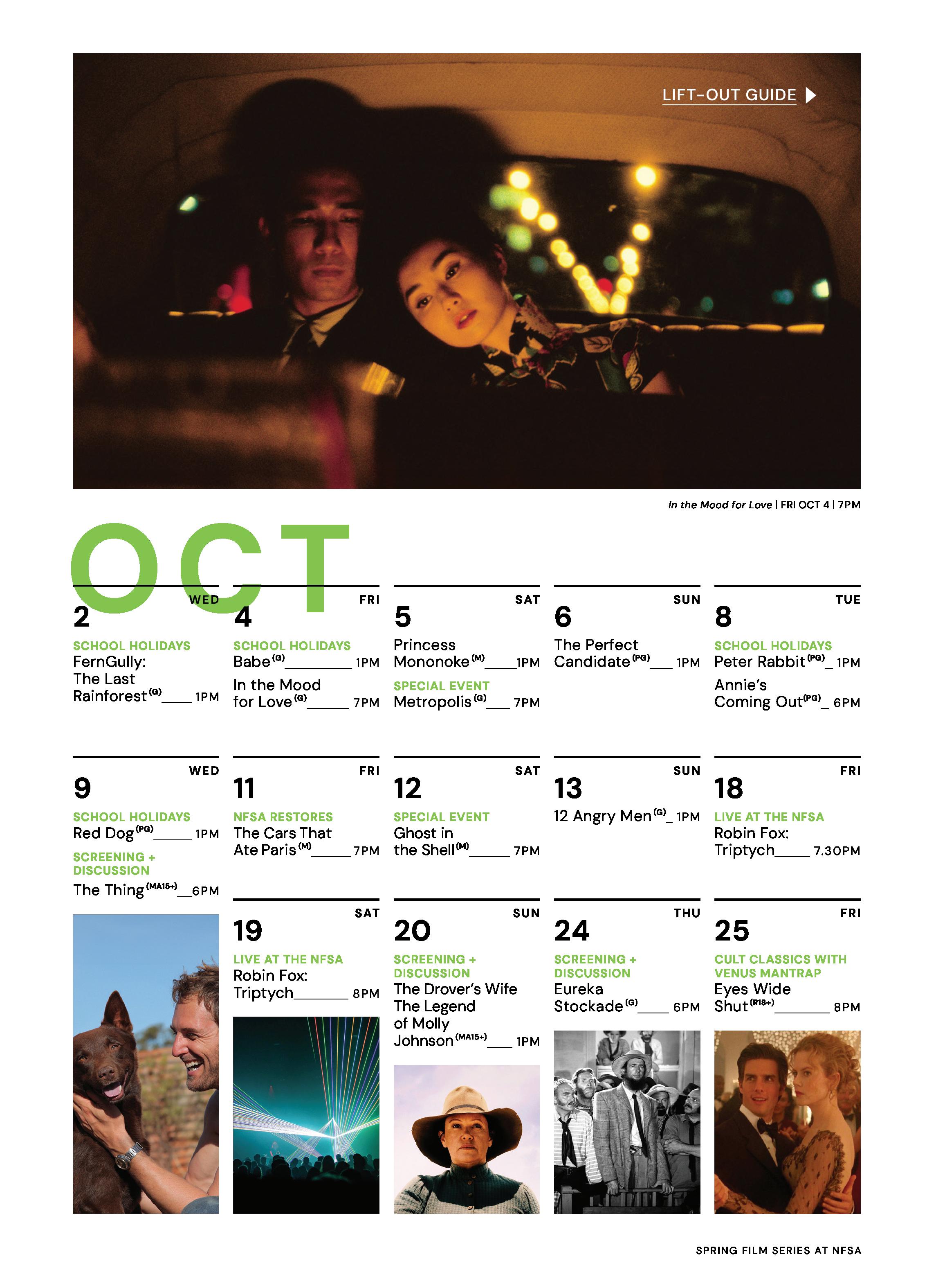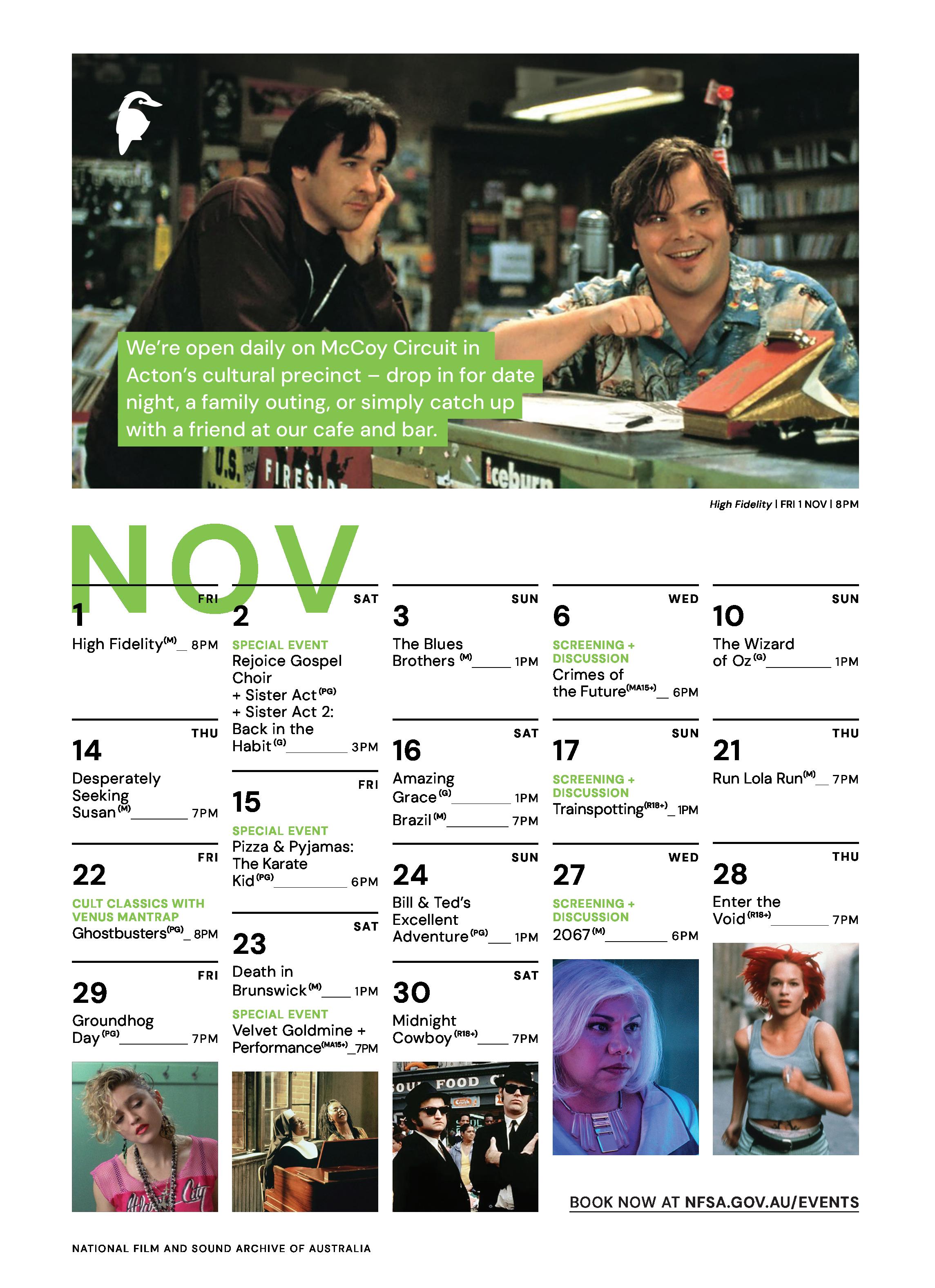 Cult Classics with Venus Mantrap | Eyes Wide Shut Slip on your mask and join Venus Mantrap for the best Halloween screening in town, starring Nicole Kidman and Tom Cruise. This surreal and suspenseful ‘90s classic explores desire, intimacy, and the shadows of Manhattan's upper echelons. 8pm, $16/14 via NFSA ARC CINEMA, NFSA ACTON