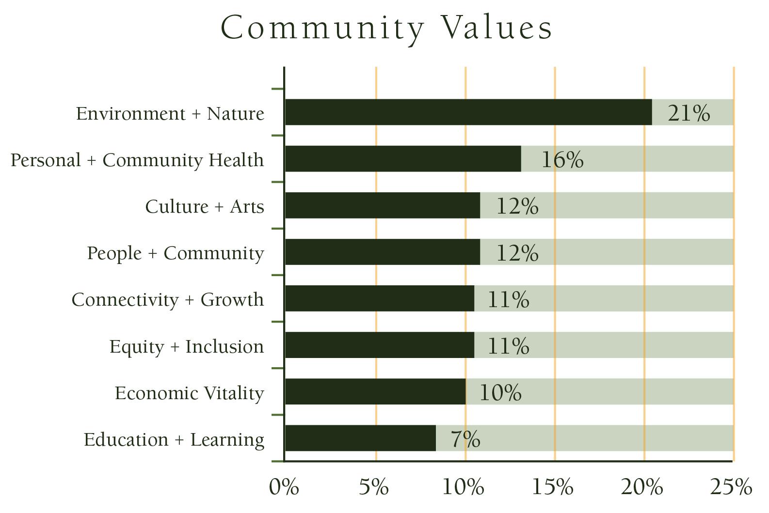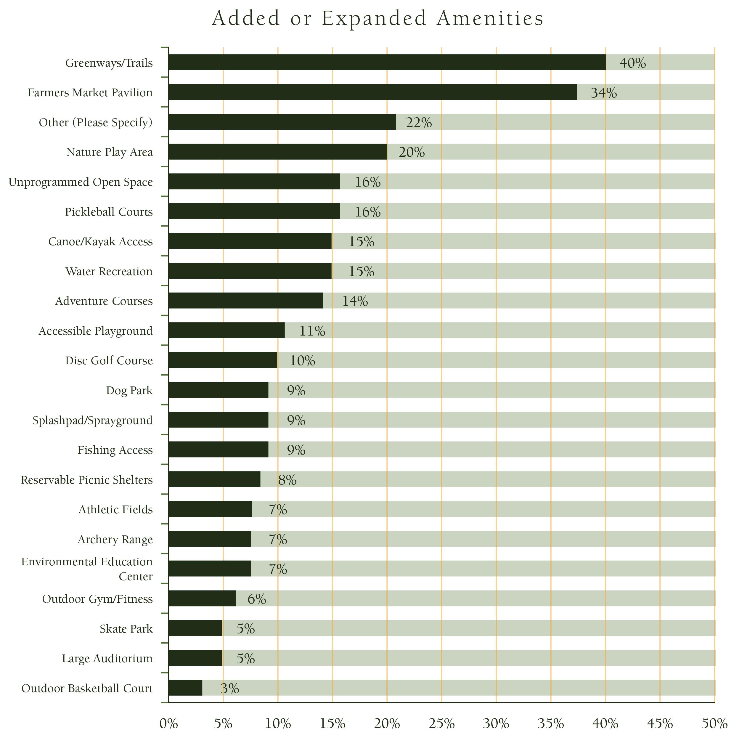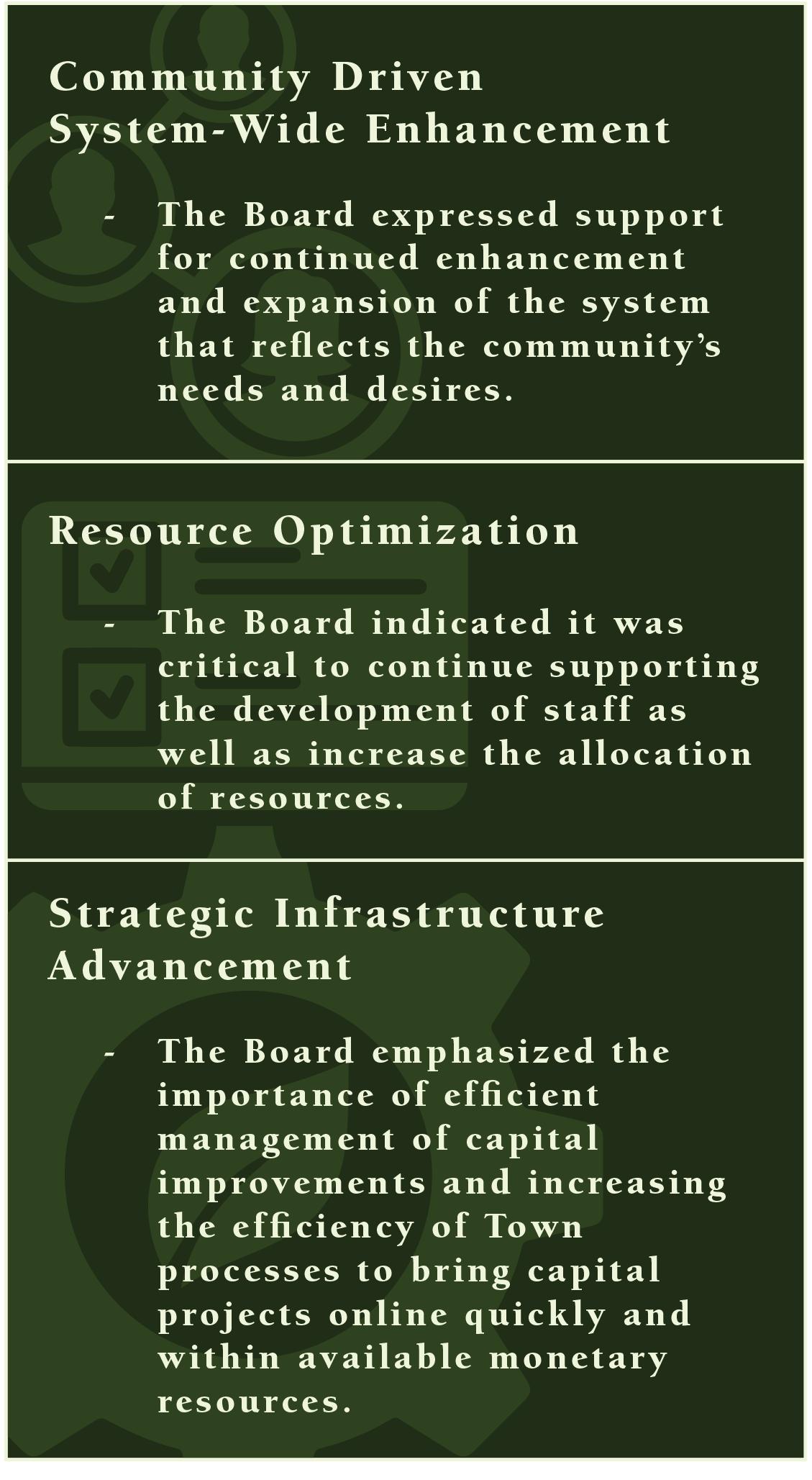 that the system successfully connects the community to one another and with the Town’s public services, meaning there are opportunities to improve this by enhancing amenities, safety, and maintenance of parks. Staff also indicated a desire to continue providing elevated park and recreational experiences at parks across the system through provision of expanded amenities and creation of unique experiences. Finally, staff conveyed the importance of empowering the PRCR Department staff through professional development and increased allocation of resources to the department.