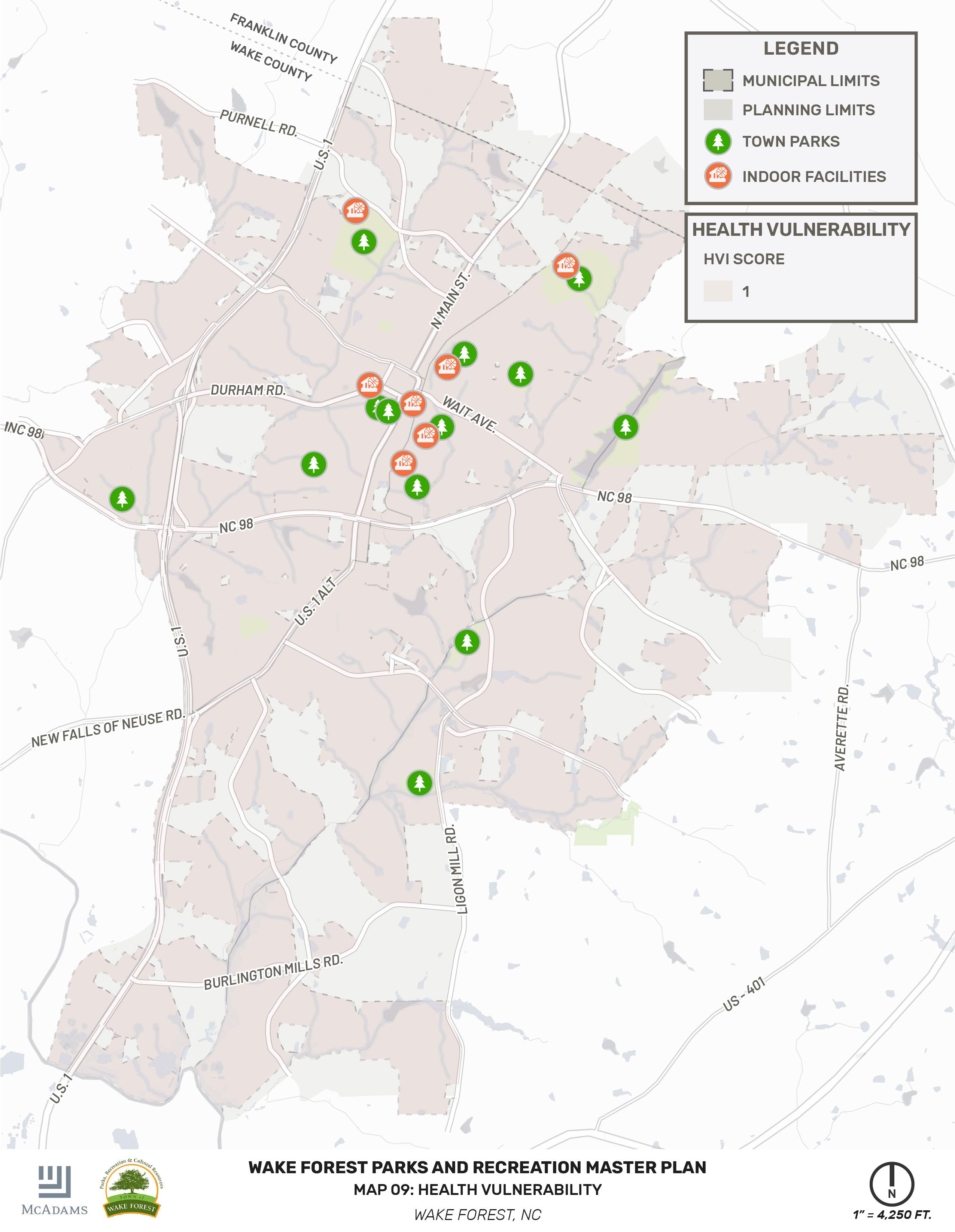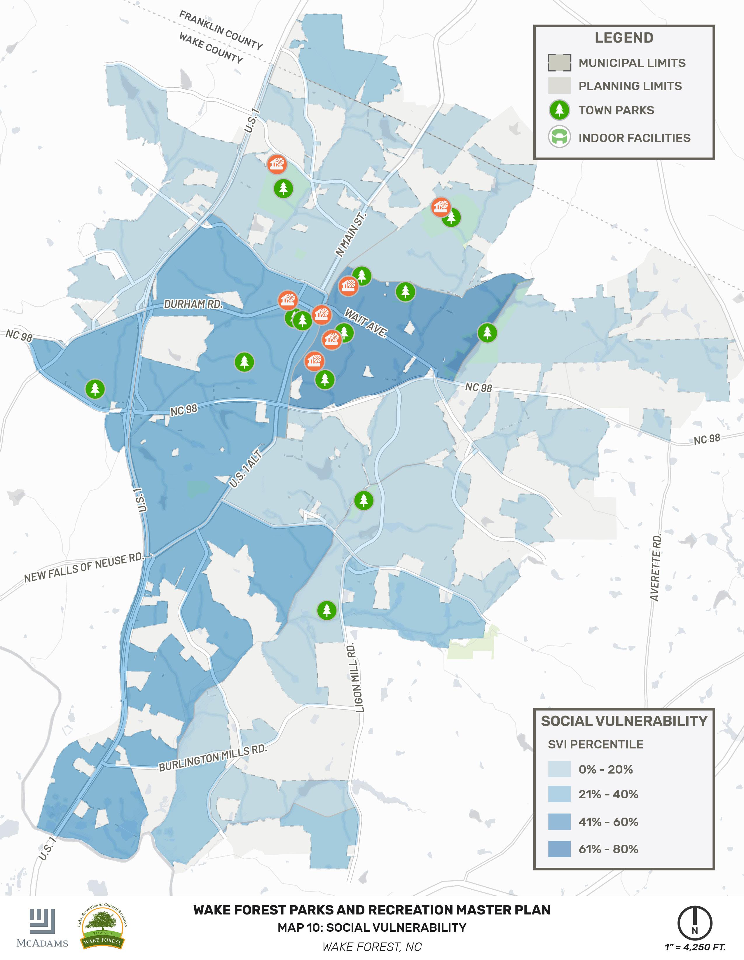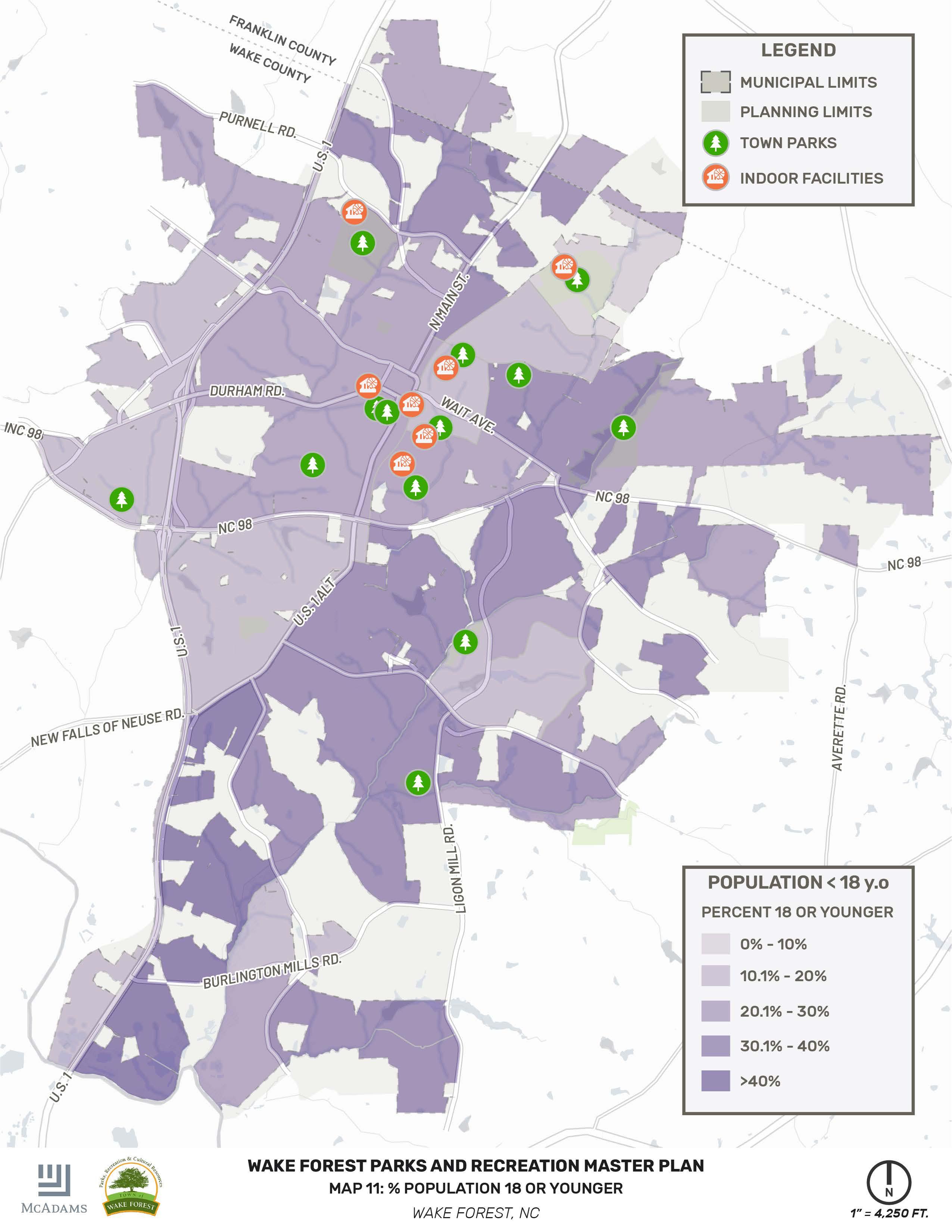 Wake Forest’s population has increased by 725% between 1990-2020 (Wake Forest Community Plan, 2023) and shows continued growth at 150% for the next two decades. Demographic composition will continue to get diverse, along with a higher percentage of the population with higher median income. These shifts are bringing in new recreation needs, an increased commitment to the protection of natural resources, and a focus on equitable access and inclusion.