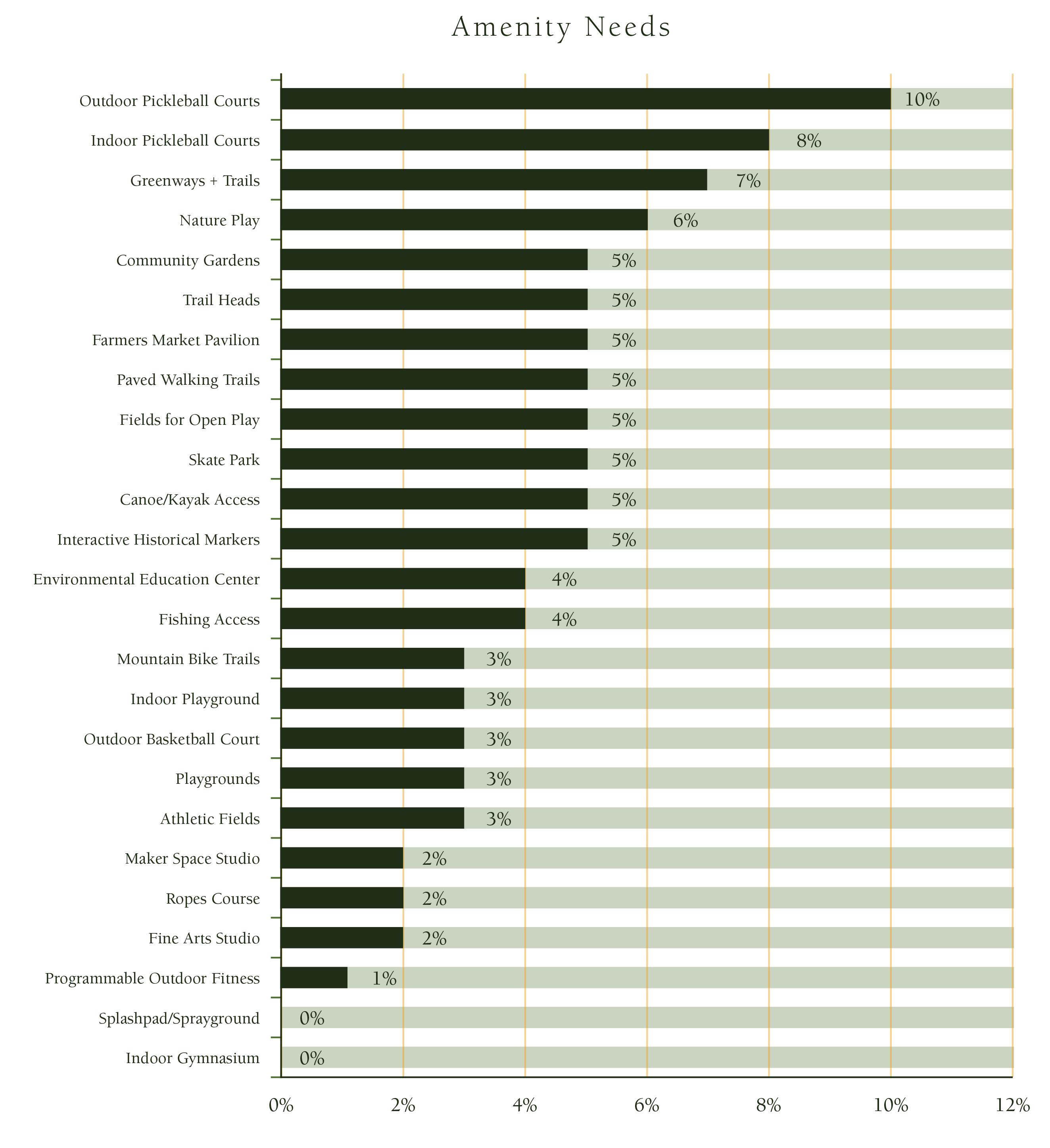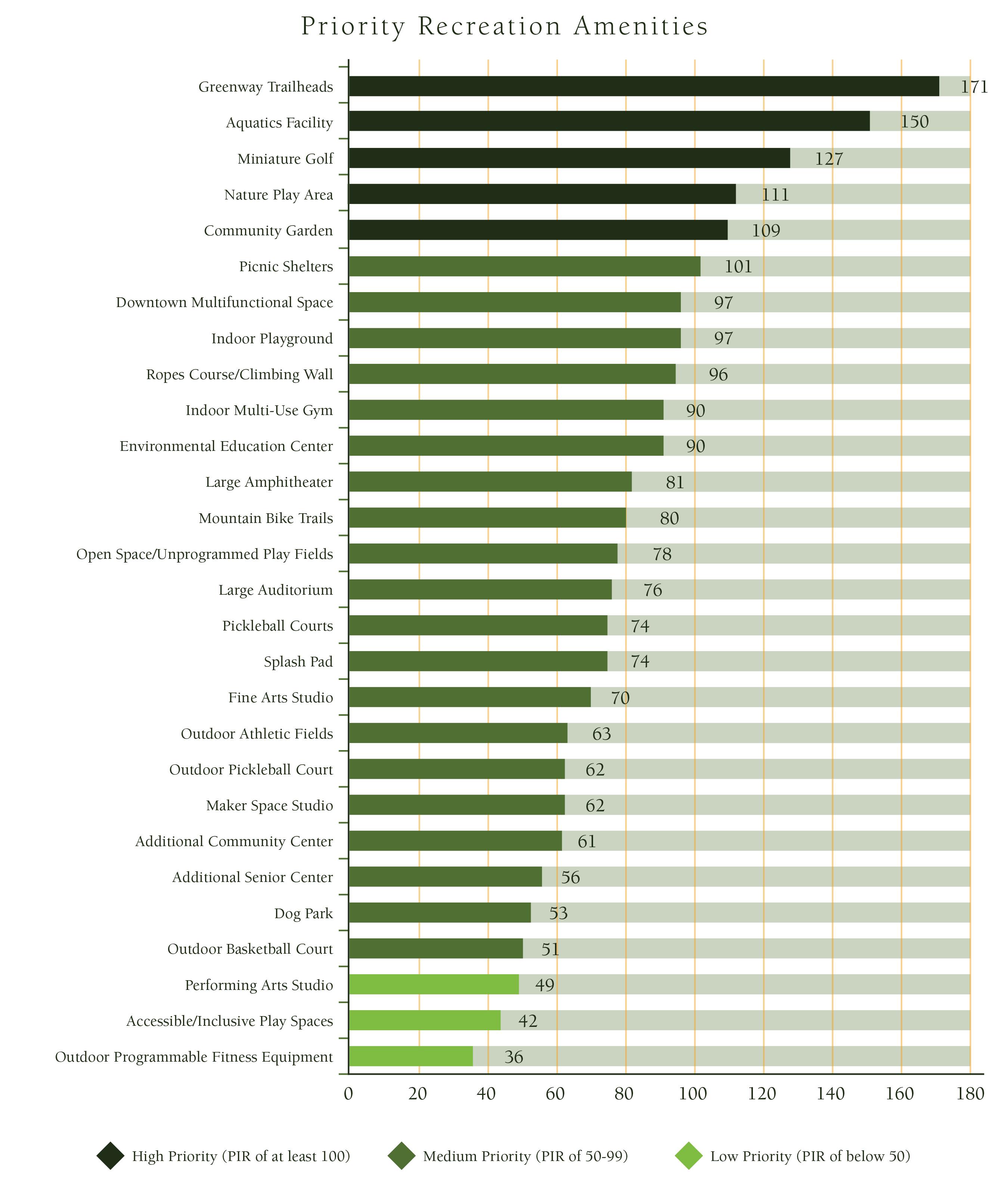 Community engagement was conducted through multiple methods including a Scientific Survey, public opinion surveys, focus groups, and open house meetings. Feedback from community engagement revealed high levels of engagement and use of the PRCR Department programs. The public also indicated high satisfaction with the PRCR Department’s ongoing evaluation and relevancy of programs. Conversations with the public revealed that the top priority for the community as it relates to parks and recreation is creating community connections, promoting health and wellness, and immersion in nature. The highest ranked amenity in the scientific survey was the continued addition of greenways and greenway trailheads. Focus group sessions, which were held to elicit strategic feedback from specific groups within the community, revealed a desire for additional age-focused programming that allows all age groups to experience expanded recreational offerings and educational and social program offerings.