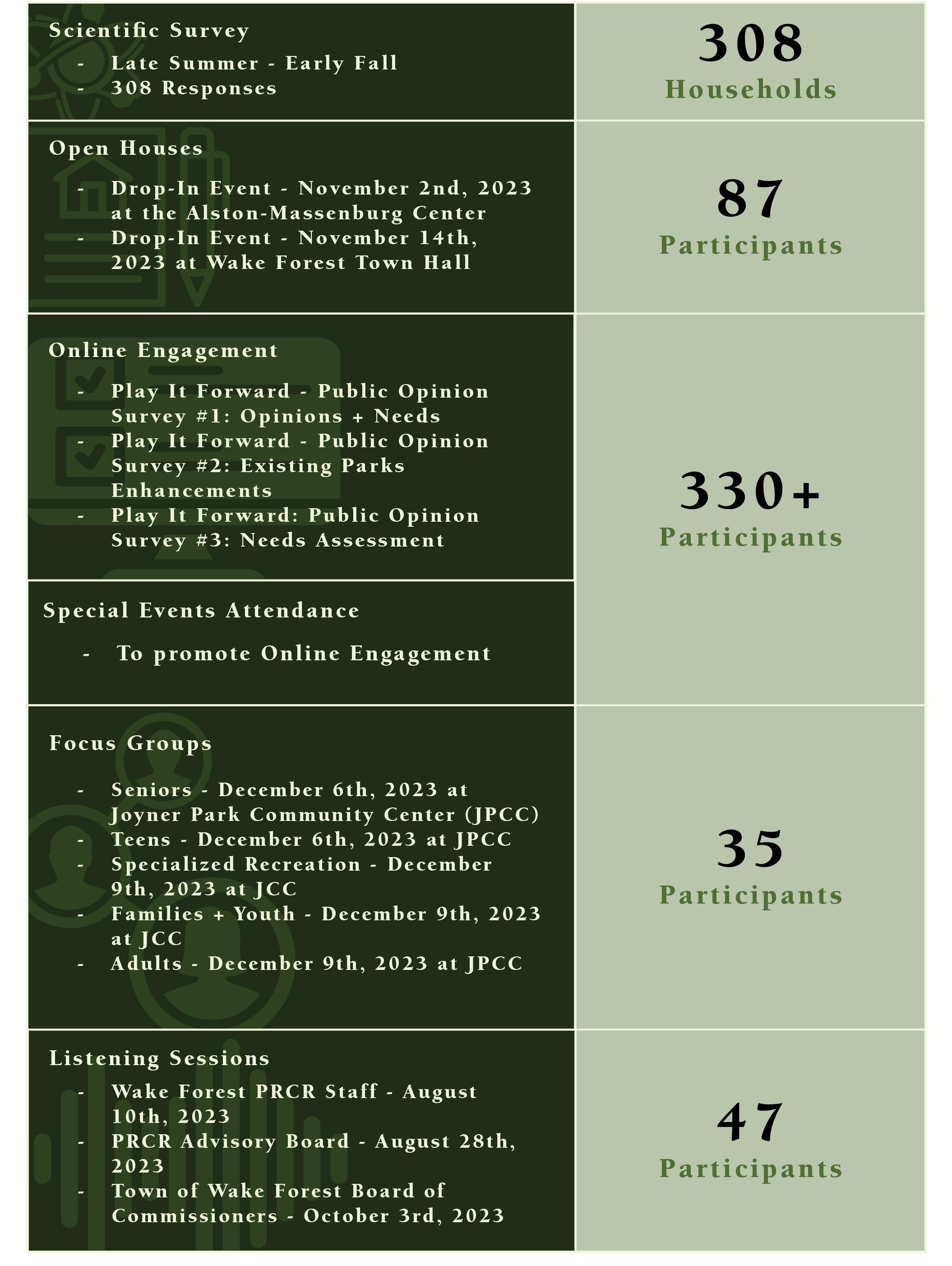 The Town of Wake Forest is known in the region for its top-quality parks and facilities such as Joyner Park, aquatics center, and the Renaissance Centre. With it’s humble beginnings as a Parks, Recreation and Cultural Resources (PRCR) Department in 1979, the Town made extraordinary progress documented in the 2015 plan and the highest accolades as a Commission for Accreditation of Park and Recreation Agencies (CAPRA) Re-Accredited Department in 2023. The Town has now made a new commitment to update its PRCR Comprehensive Plan every five years instead of the typical ten years, to proactively plan for the new growth. The 2024-2029 Planning Update, also known as ‘Play It Forward’ Plan 2024 Update will establish a new vision and set priorities for the Town to implement recommendations rooted in community values and aspirations.