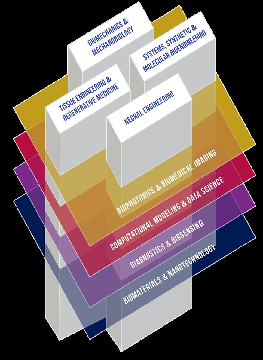 Our distinguished faculty is comprised of world renowned scientists and engineers who work across every scale of biology and in a wide spectrum of bioengineering subspecialties. Their research is driven by advancing fundamental understanding of biology and physiology in health and disease and then translating these principles to new technologies that impact the human condition and the practice of medicine. They also participate in 8 interdisciplinary research centers that are directed by BME faculty, and 43 research laboratories.