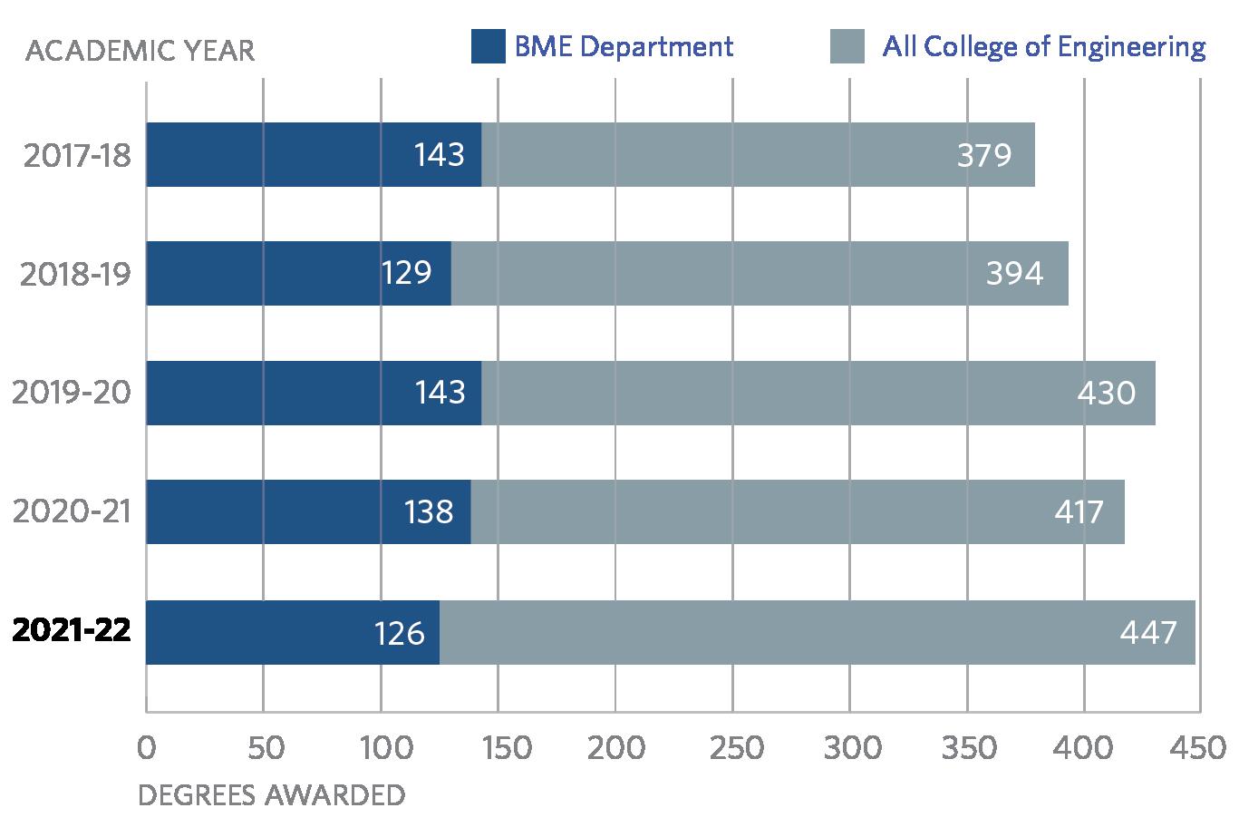 The BME Undergraduate Program awarded 126 Bachelor of Science degrees and enrolled 588 students in AY 21-22.