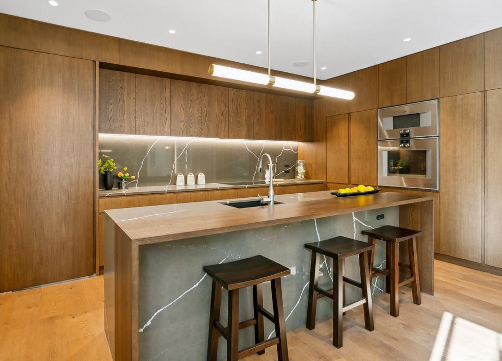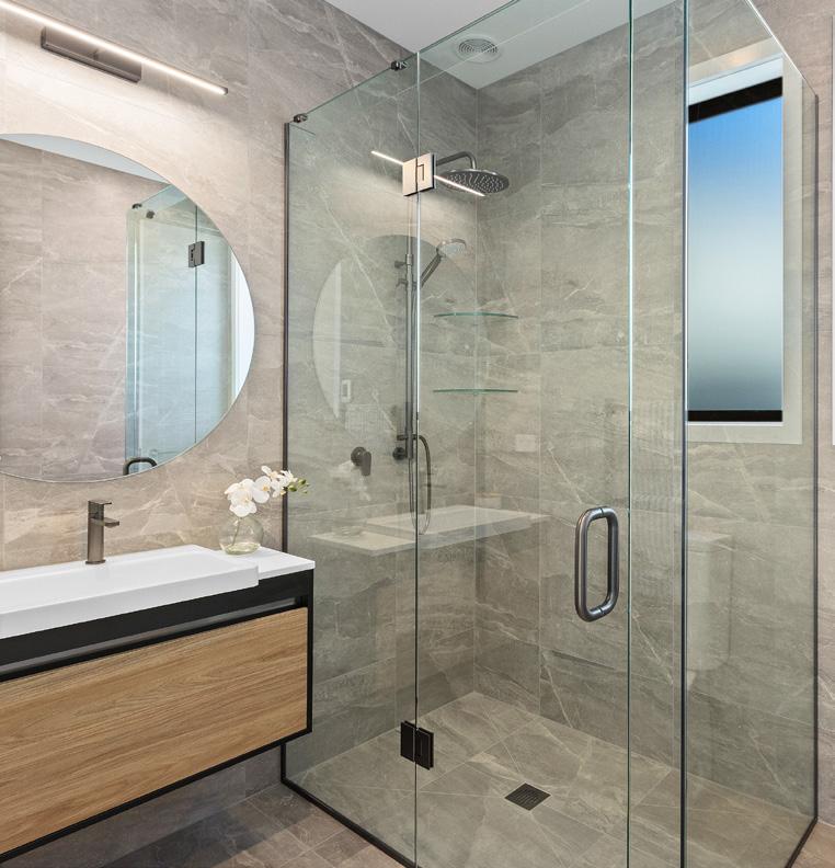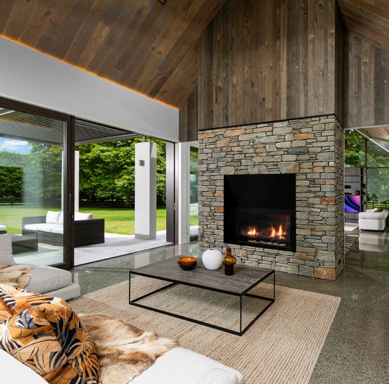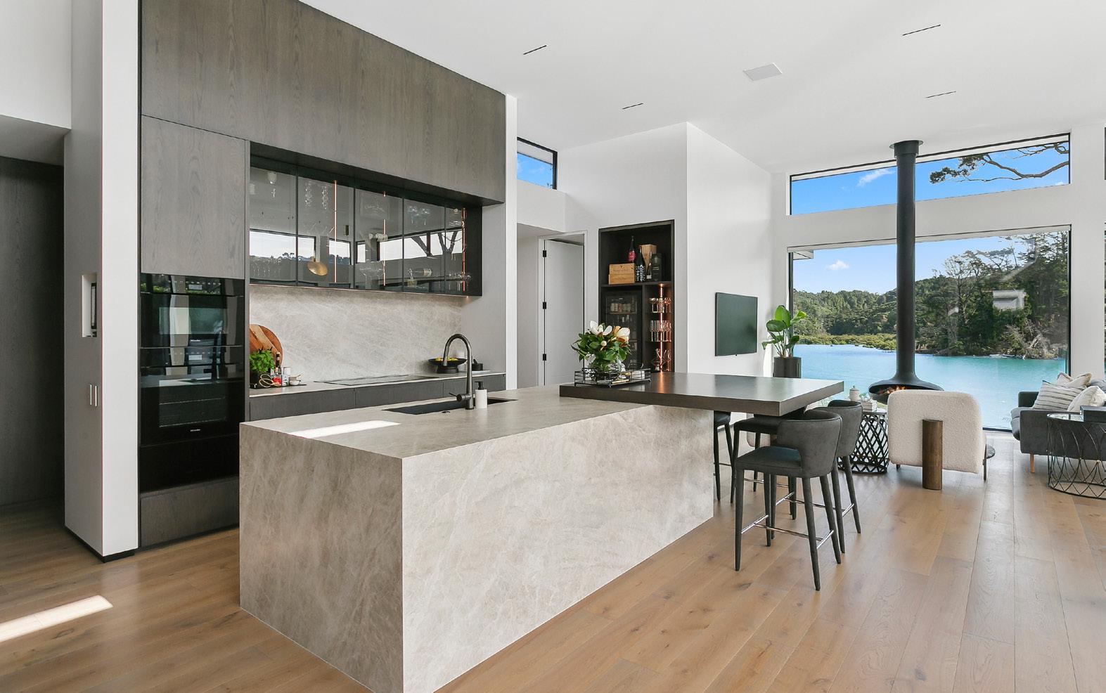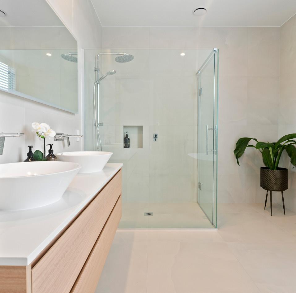 notice planked oak cabinetry and solid travertine benchtops and floors. Around the corner are built-in shelves and cabinets made from more of the oak. Lightly bronzed joinery and roof louvres above the deck only add to the sense of harmony; a wood-burning fire is both practical and beautiful. That’s not all that’s had the meticulous Create + Construct treatment in this four-bedroom home. Bathrooms have been lavished with luxury features – quartzite stone tops, planked oak vanities and reeded glass screens. Craftsmanship is evident elsewhere, too, in the villa fretwork, cladding, joinery and super-sized double garage – all of which settles easily into the established bush. For more of this house go to houseoftheyear.co.nz