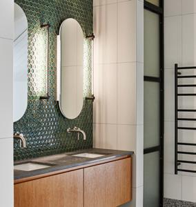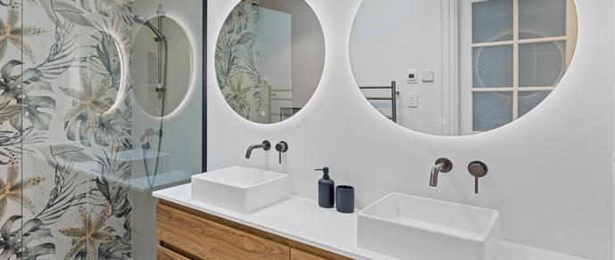 Think big when it comes to mirrors in the bathroom: they work to add light and a greater sense of space. They also offer an opportunity to add personality, so look for something different such as this bold, curving Arc mirror available in blackened, aged and brushed brass, $2190, from powersurge.co.nz