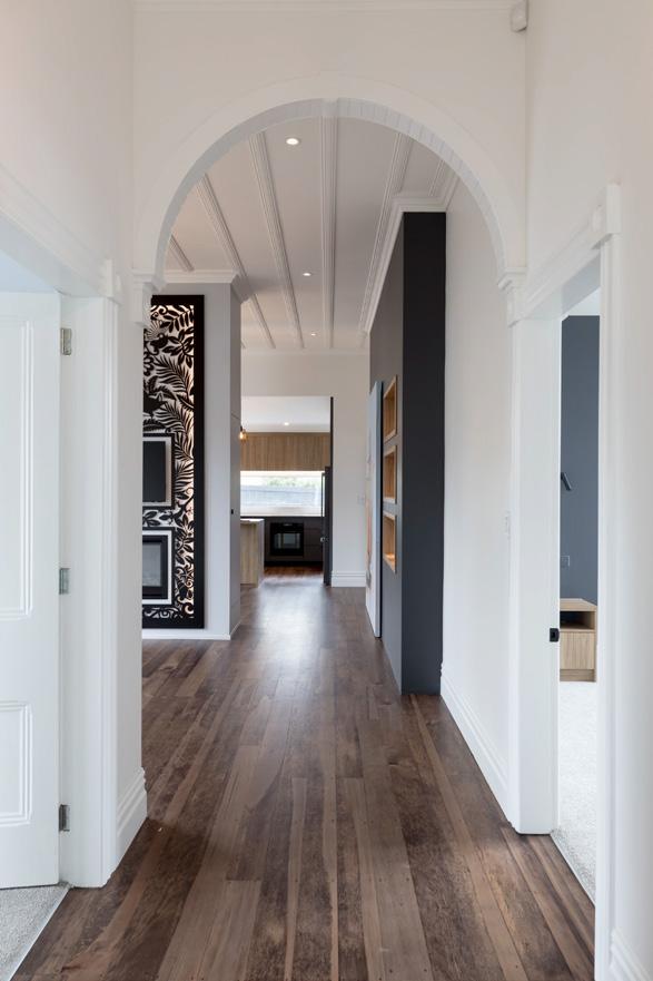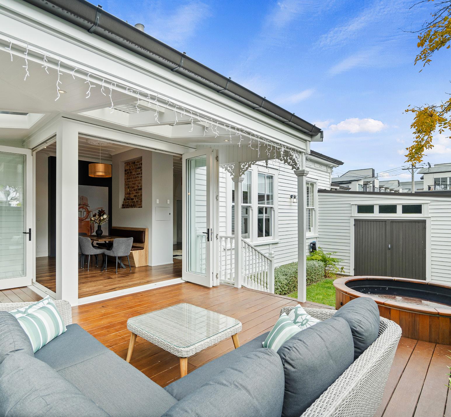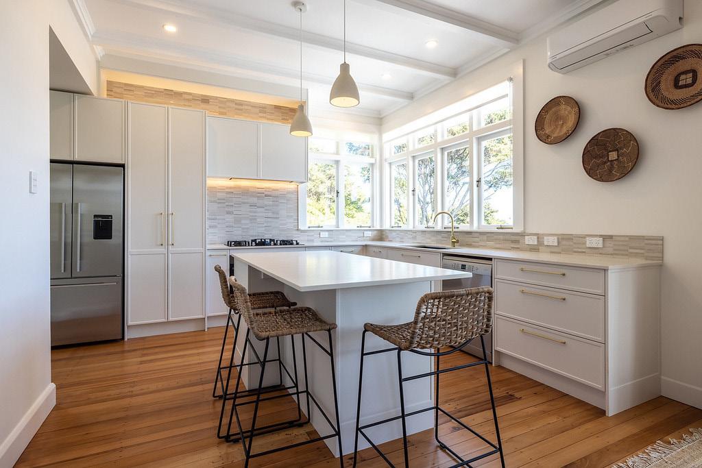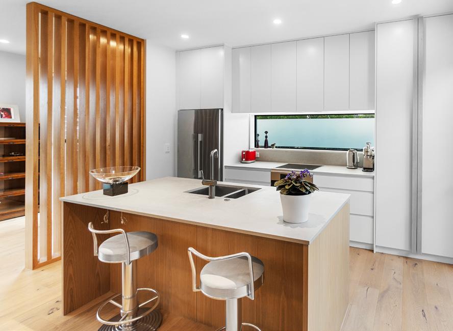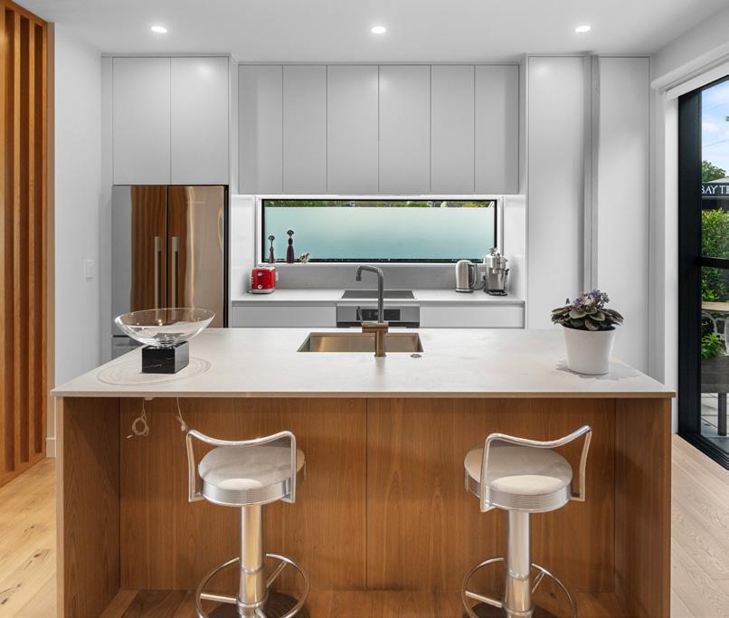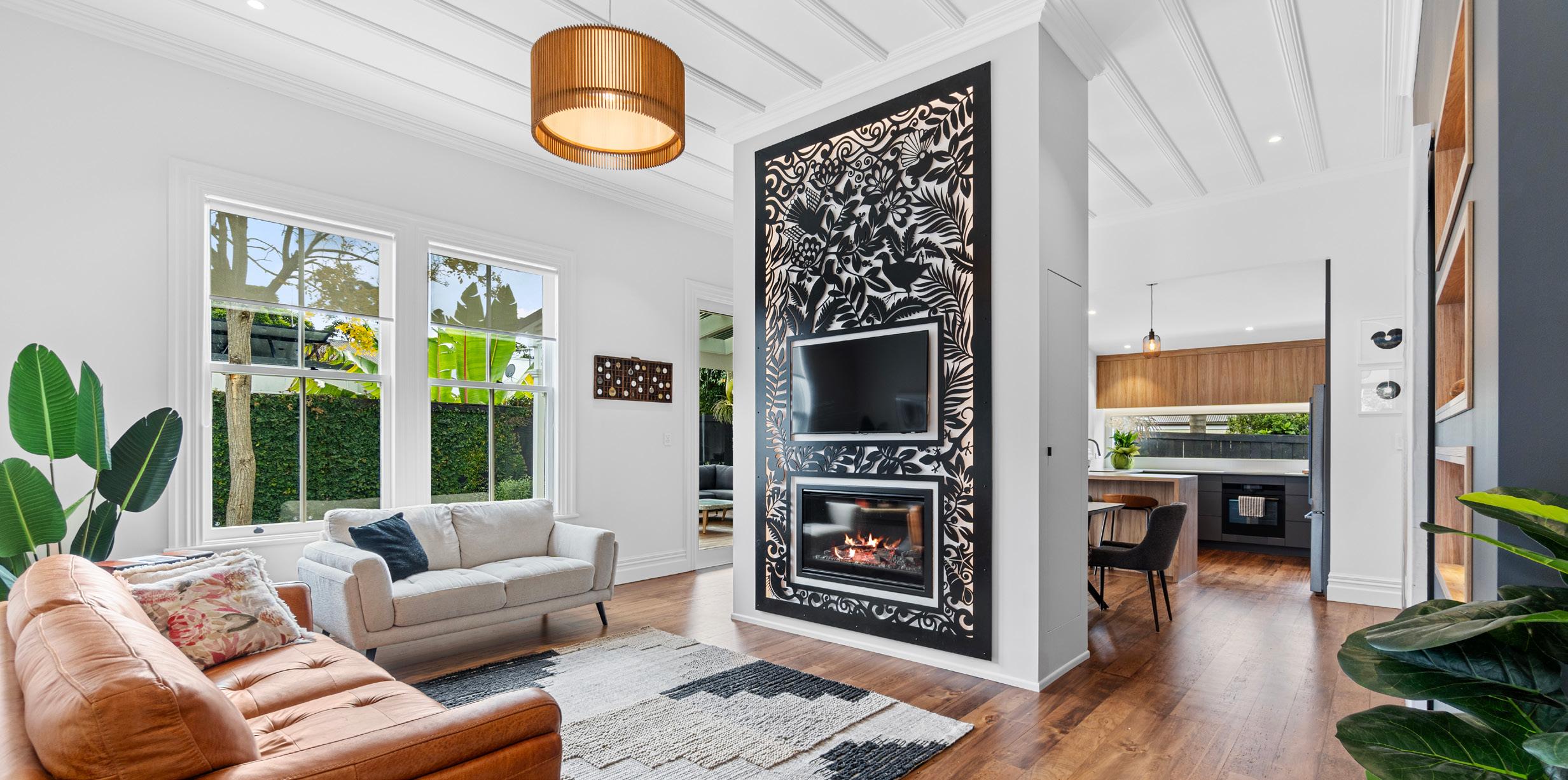 This architecturally designed home in Freemans Bay is one of two side-by-side villas that Lewis Build began working on simultaneously. Each has three bedrooms and two bathrooms, with the entire top level designated as a main suite with sweeping views of the city and Sky Tower. It was important to the builders that the special character of the villa was adhered to where possible, including retaining the original fretwork and creating replica chimneys. The renovation took
