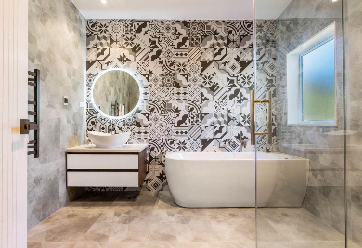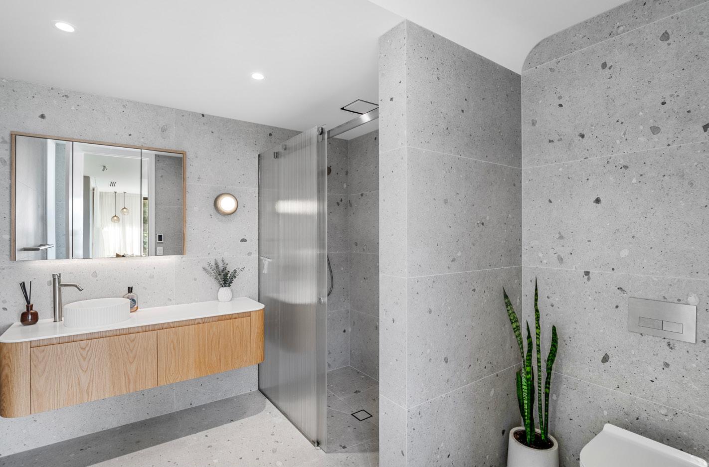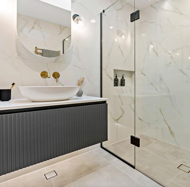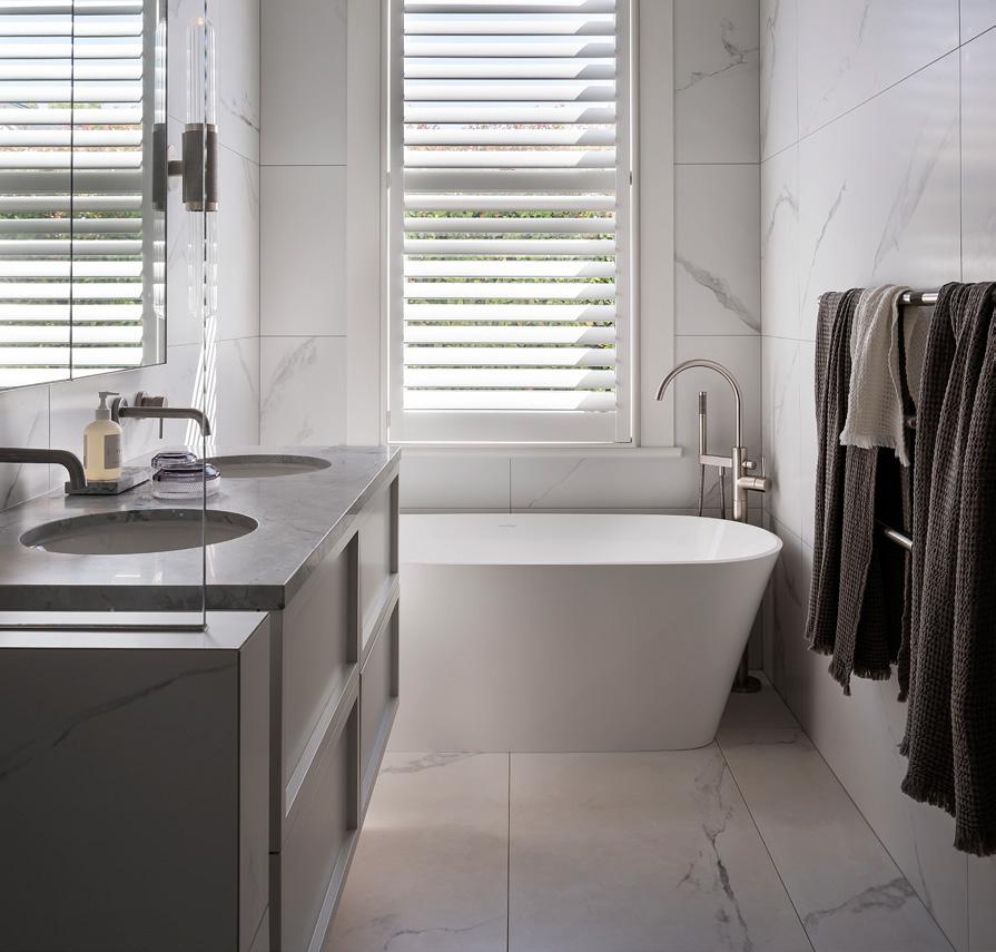 Quality materials make the mood sanctuary-like in this Northcote Point bathroom where a painterly palette stretches across the floors and up the walls around the bath. Mottled quartzite stone features here but also on the all-in-one-piece vanity top, to make cleaning a breeze. A vanity in planked-oak, hardware in aged-brass and a reeded-glass shower screen complete the modern-elegant look. For more on this home, turn to page 172.