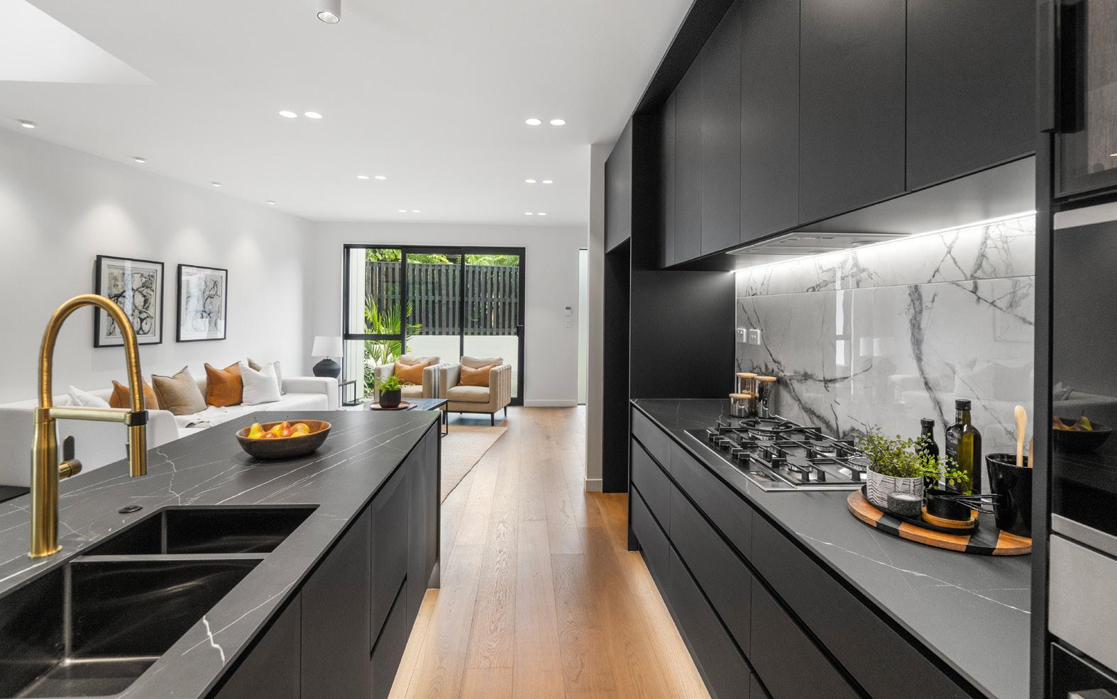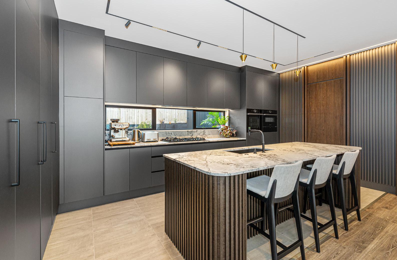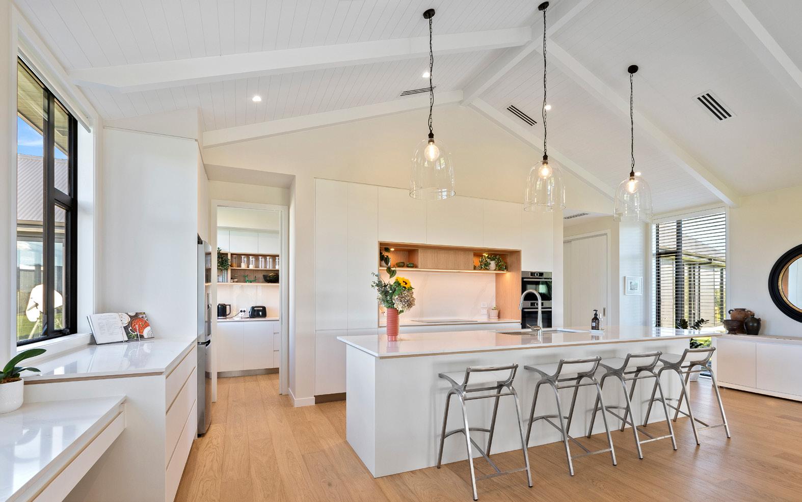 A collision of the past and the present, the white-on-white kitchen in this Grey Lynn replica villa segues calmly into the overall colour palette. This is a design that respects history but is made for modern living. The striated-marble island bench and splashback are simultaneously classical and contemporary while dark barstools provide contrast in timeless style. Cabinetry that stretches towards the high stud and a scullery provide ample storage. It’s as perfect for family life as it is for entertaining. For more on this home, turn to page 38.