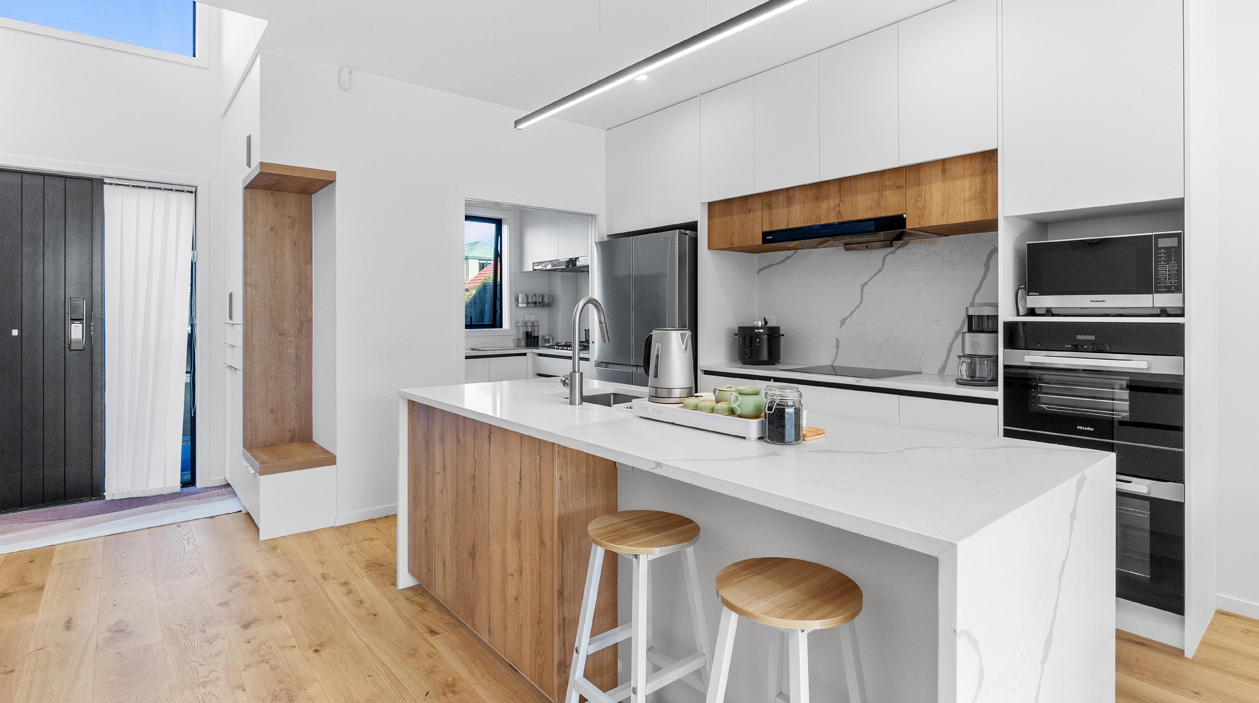 Whiteware can often interrupt a truly cohesive look in a kitchen – but not anymore. Check out the Samsung Bespoke French Door refrigerator. It cleverly comes with interchangeable door panels, which means you can select from a range of Resene colours, such as this fridge in Resene Eighth Ash. Available from Samsung retailers. 8