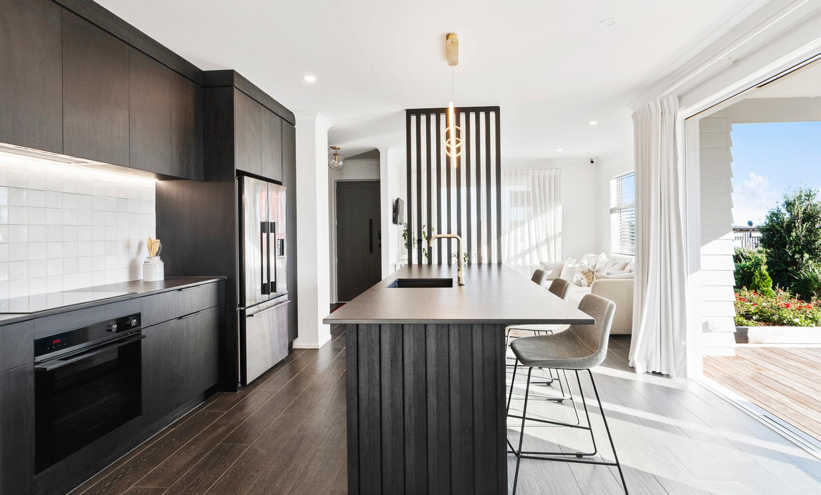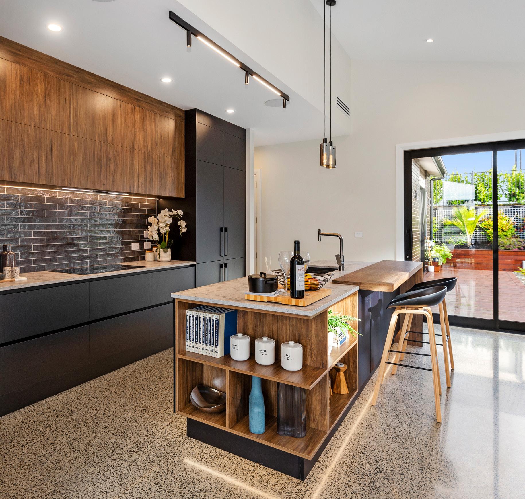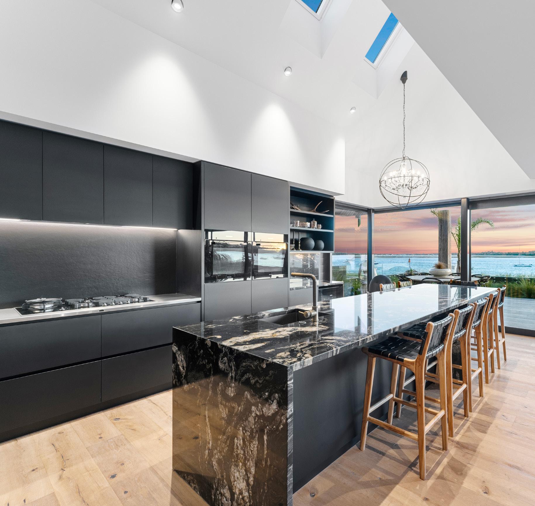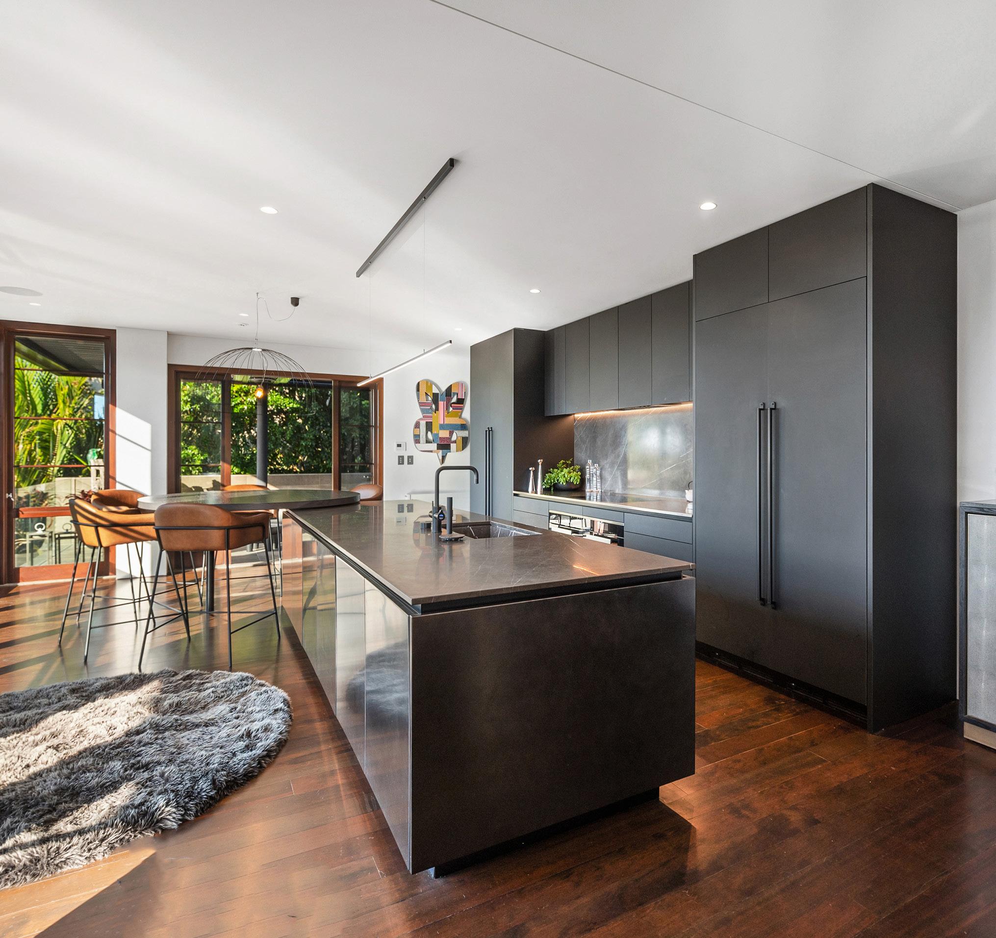 The contrasting tones of this kitchen by Kathrine McDonald create drama. The cabinetry timber has been stained to match the flooring, making the quartzite island a standout feature.