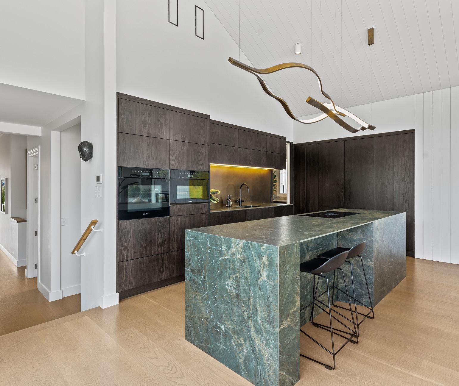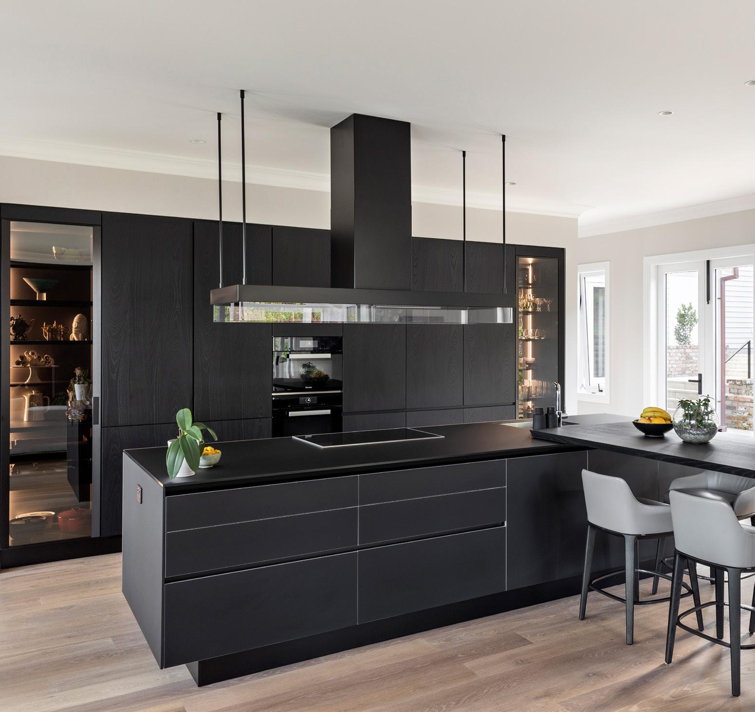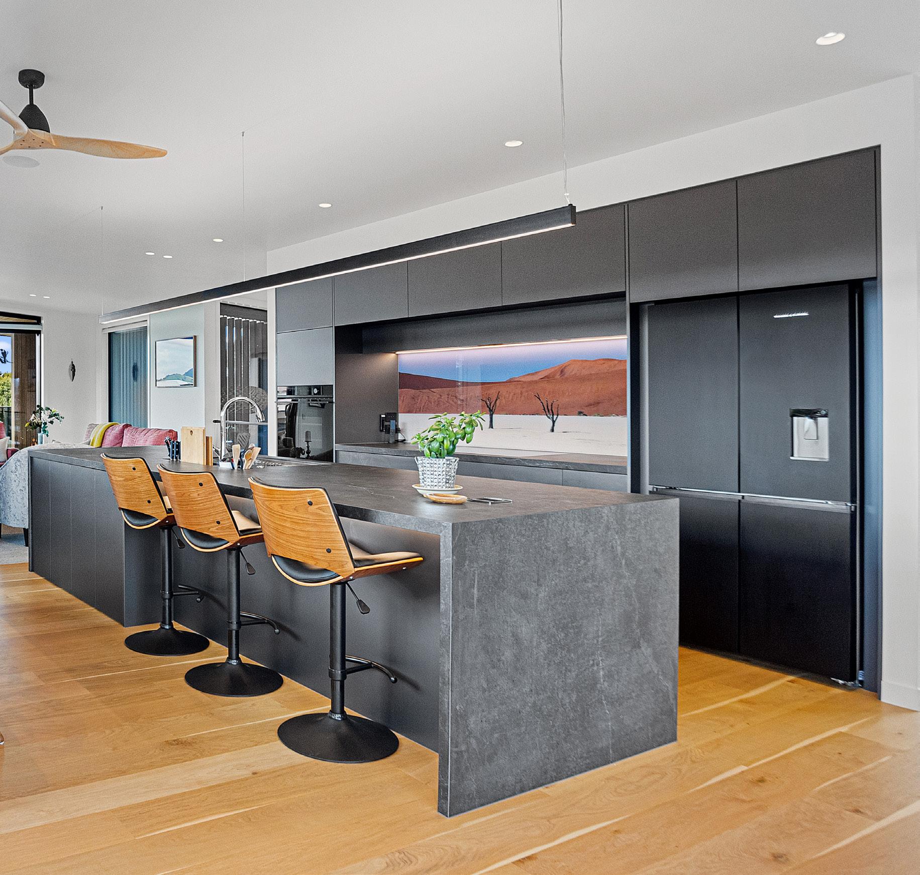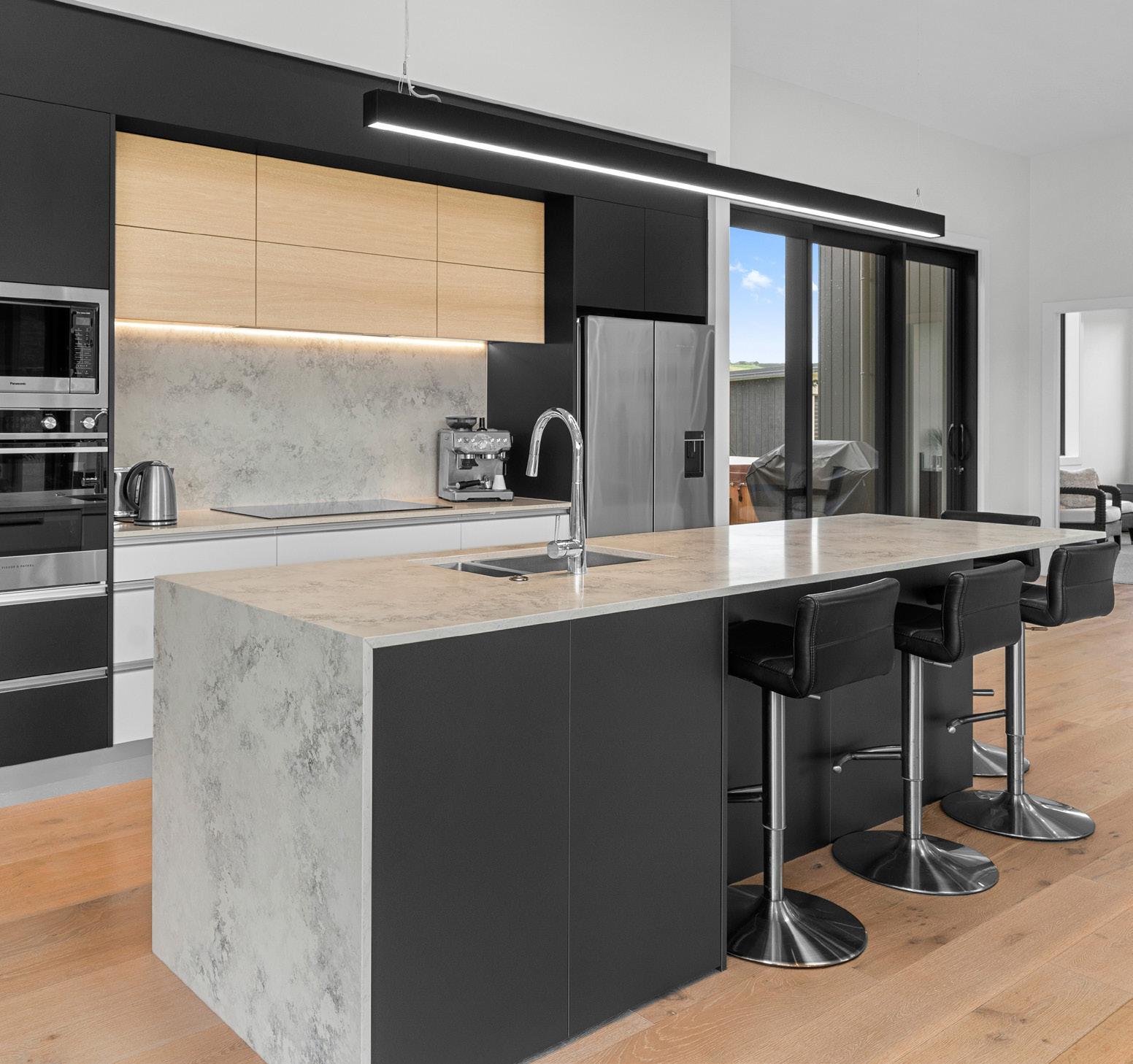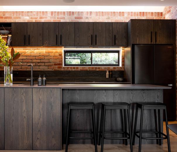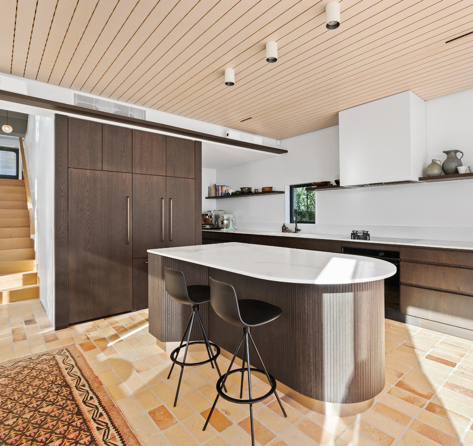 The contrasting tones of this kitchen by Kathrine McDonald create drama. The cabinetry timber has been stained to match the flooring, making the quartzite island a standout feature.