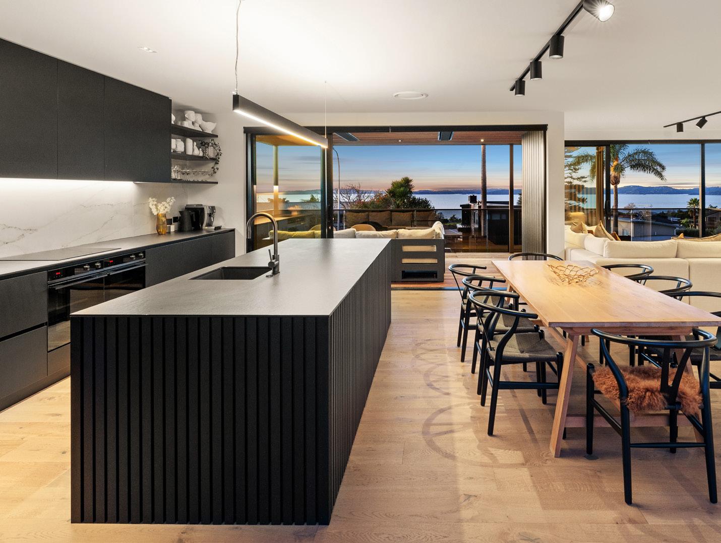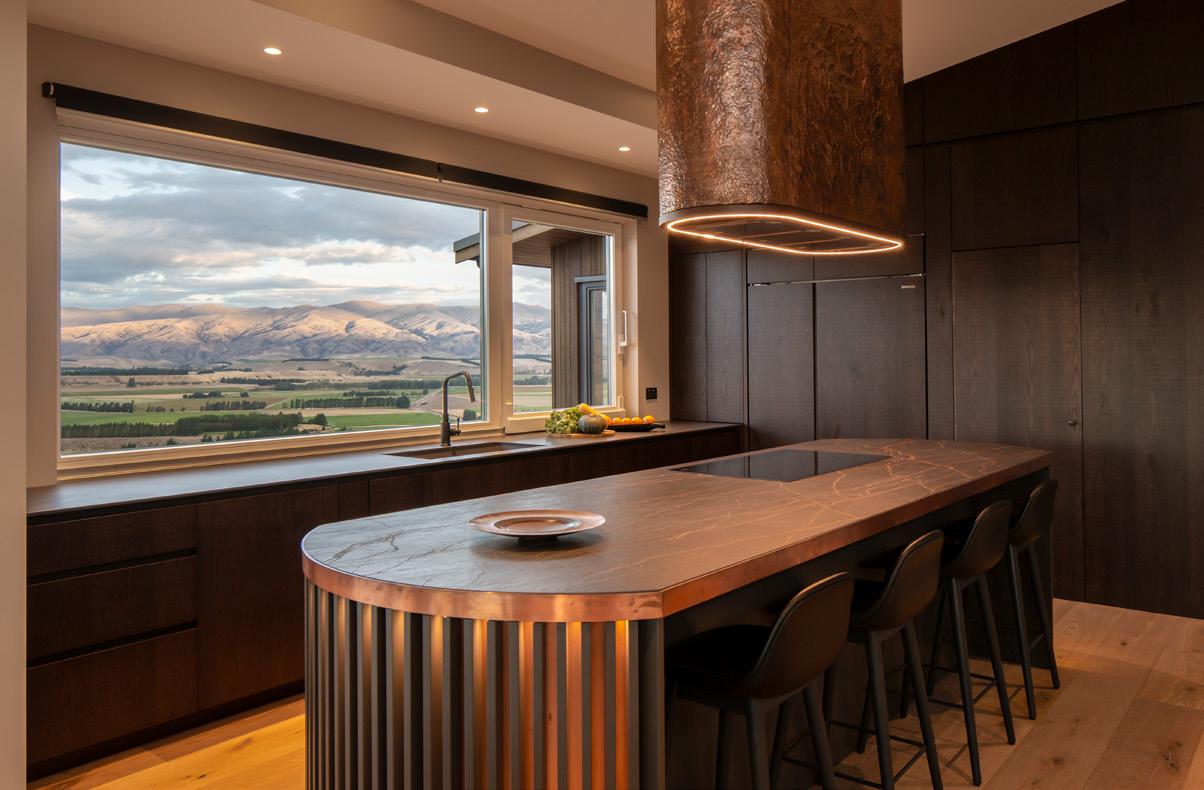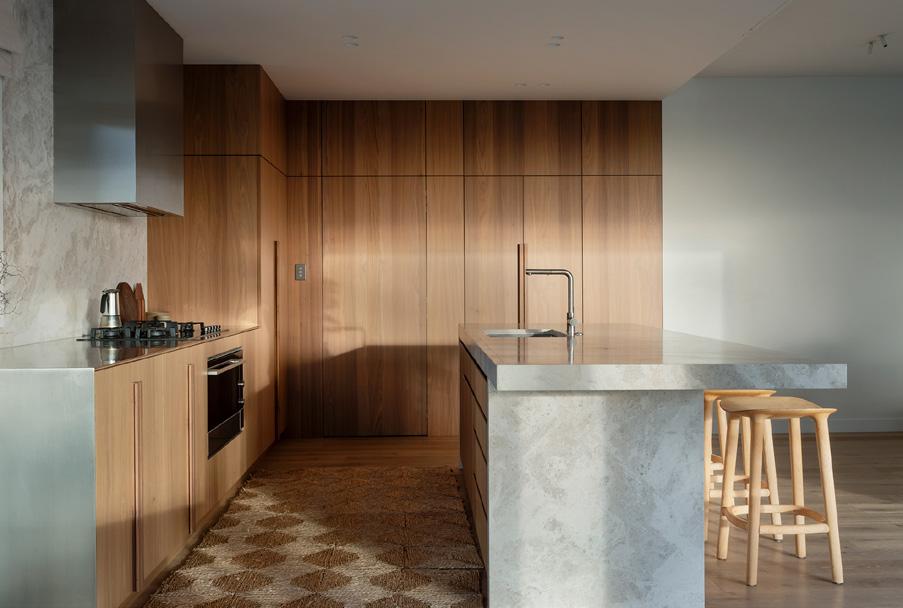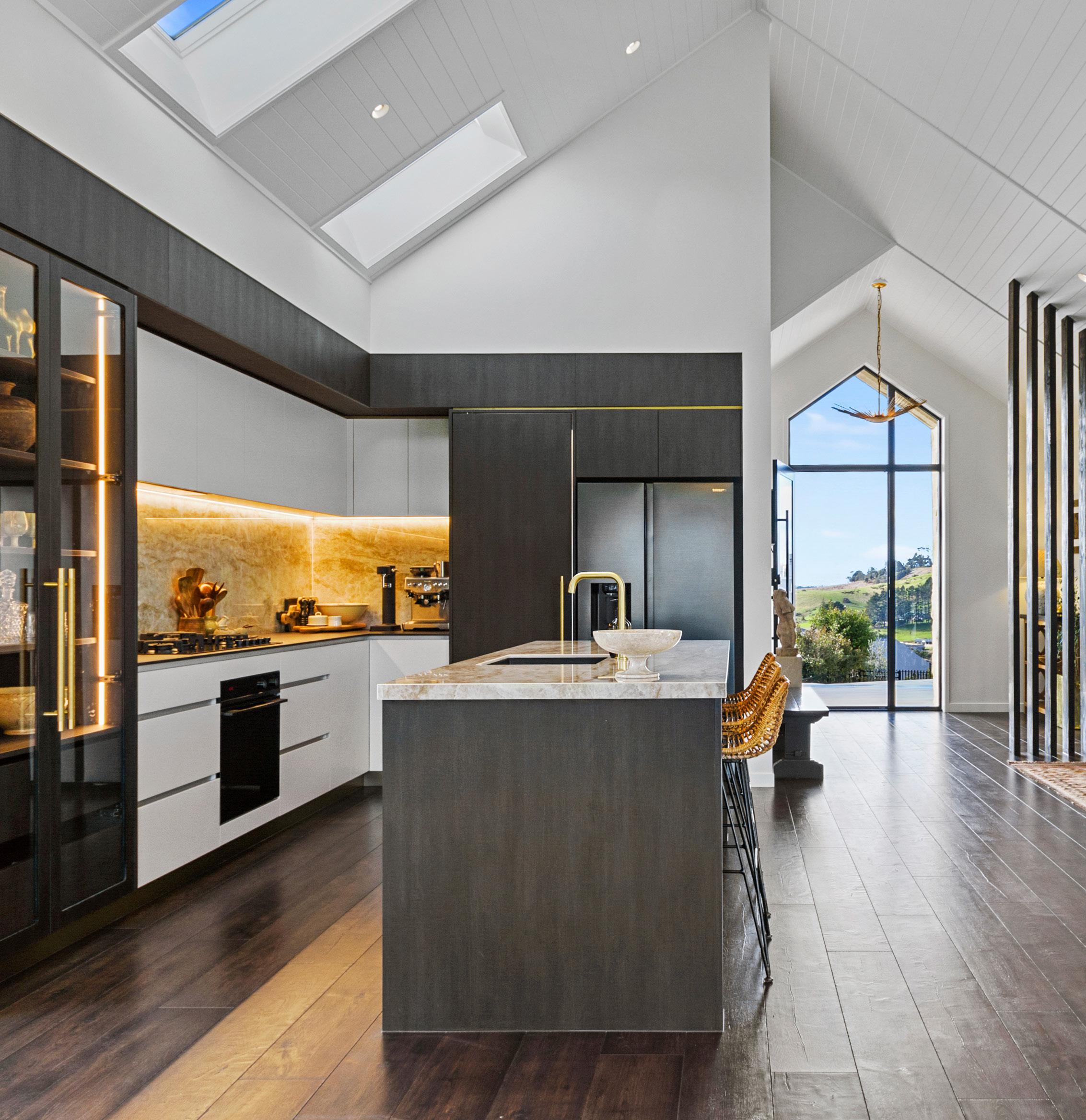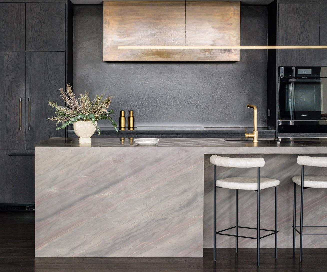 The contrasting tones of this kitchen by Kathrine McDonald create drama. The cabinetry timber has been stained to match the flooring, making the quartzite island a standout feature.