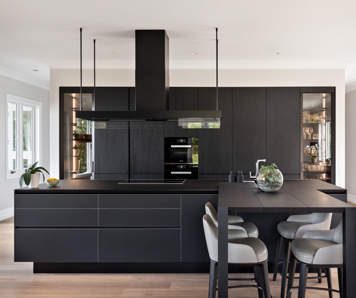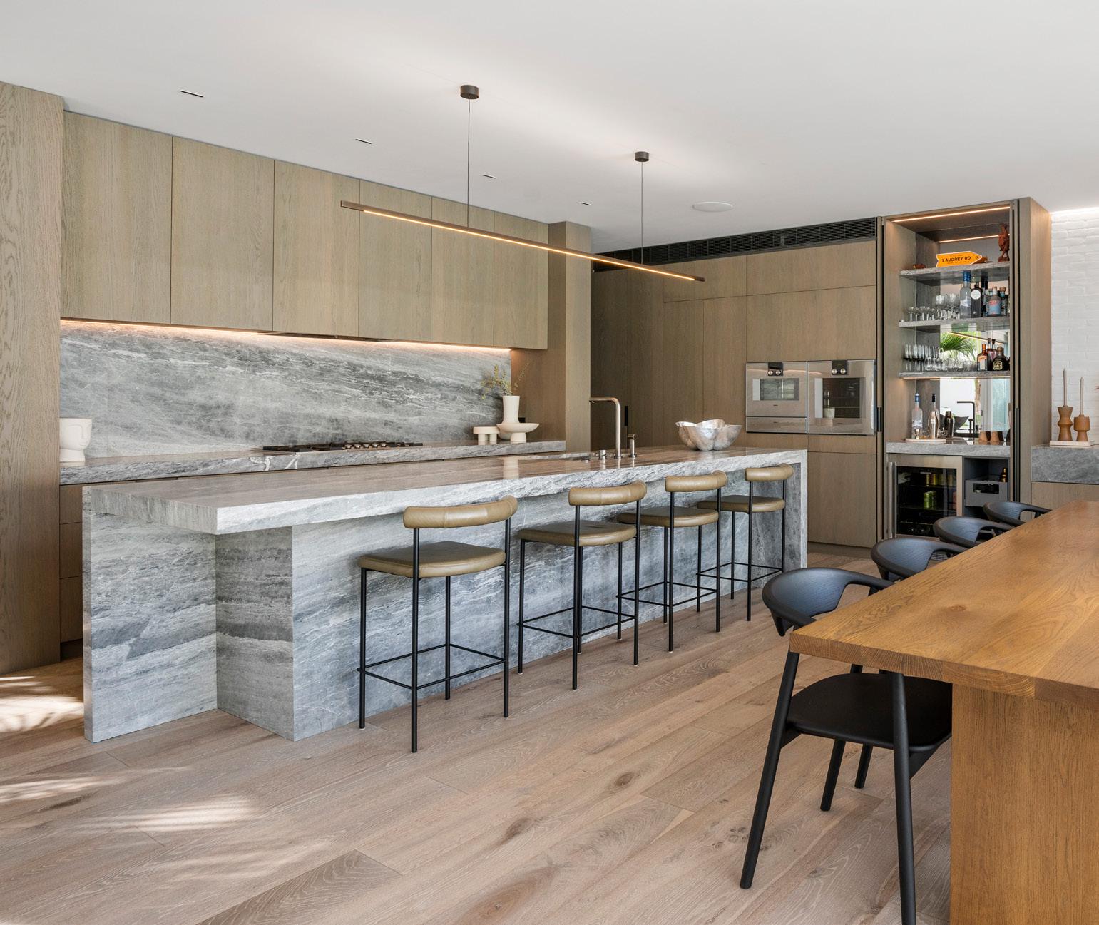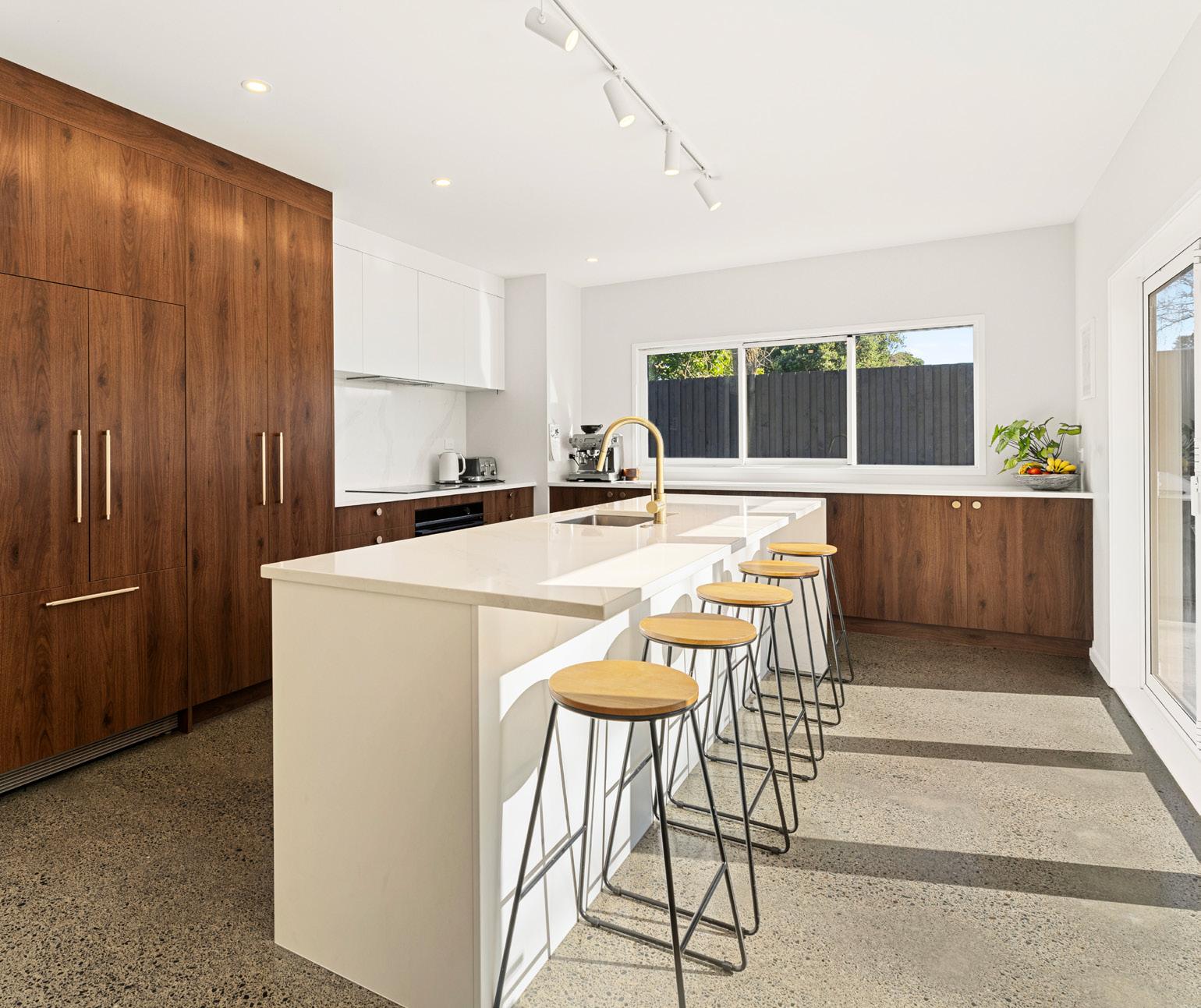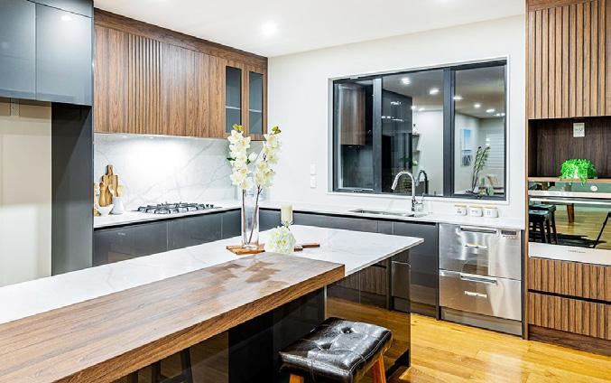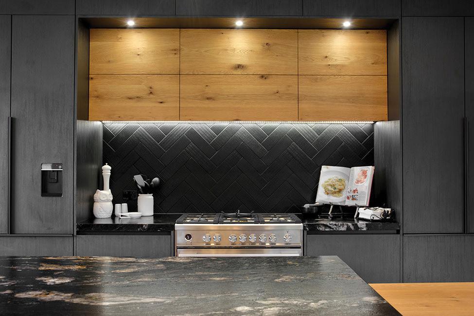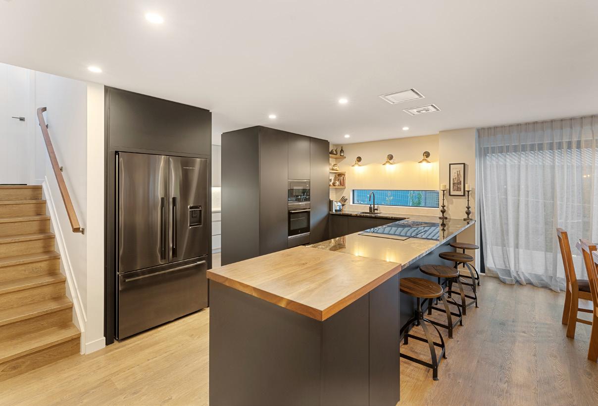 The contrasting tones of this kitchen by Kathrine McDonald create drama. The cabinetry timber has been stained to match the flooring, making the quartzite island a standout feature.