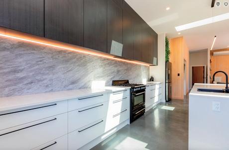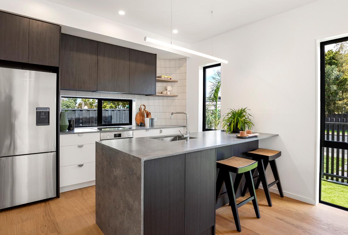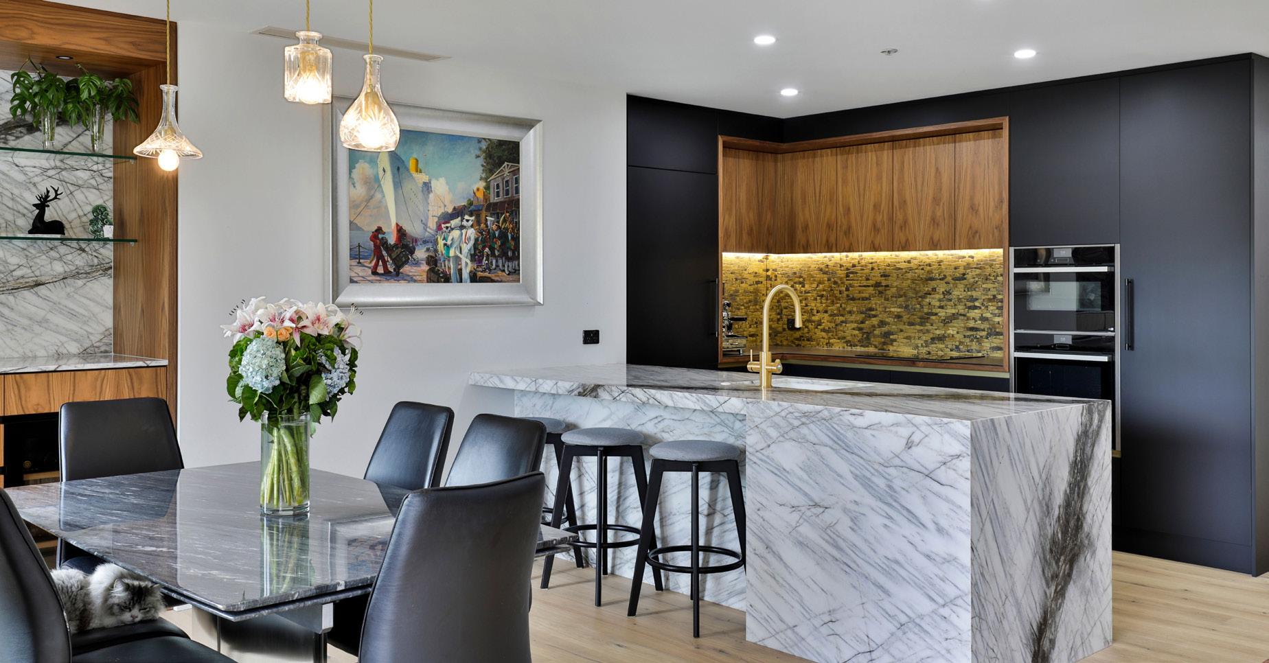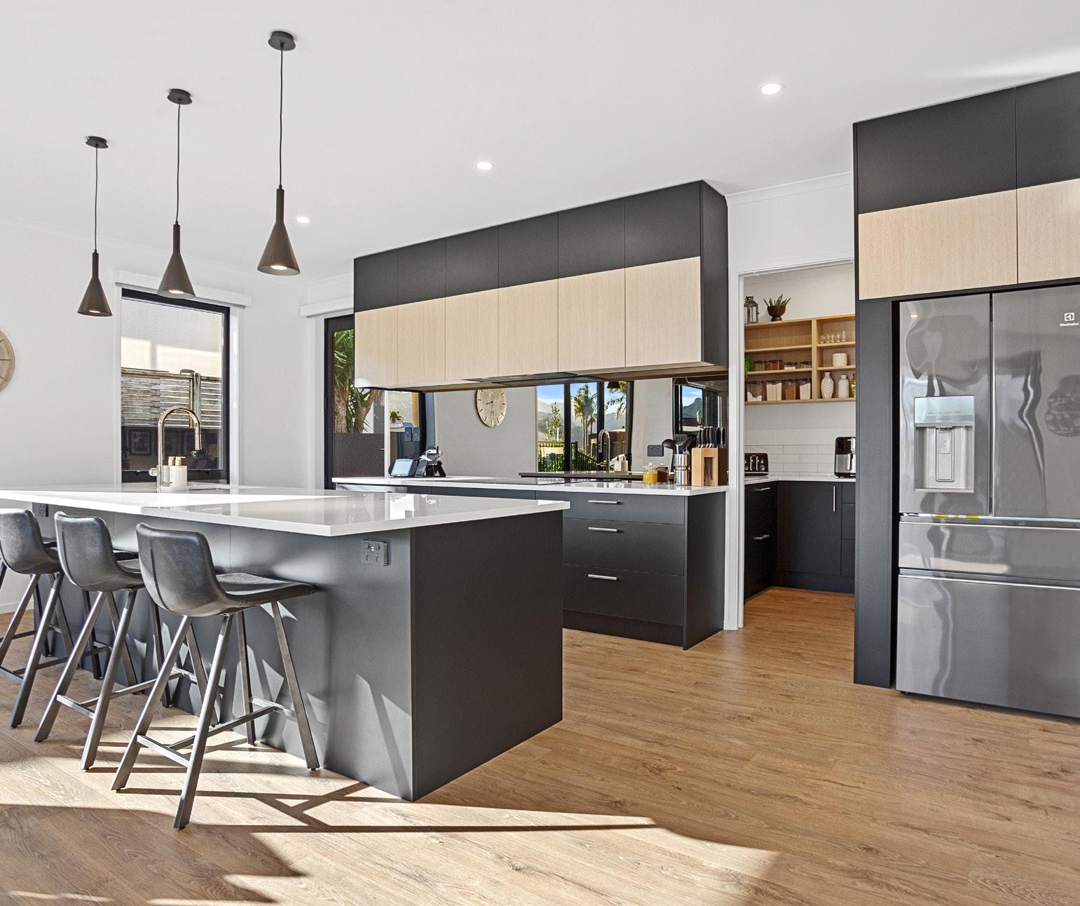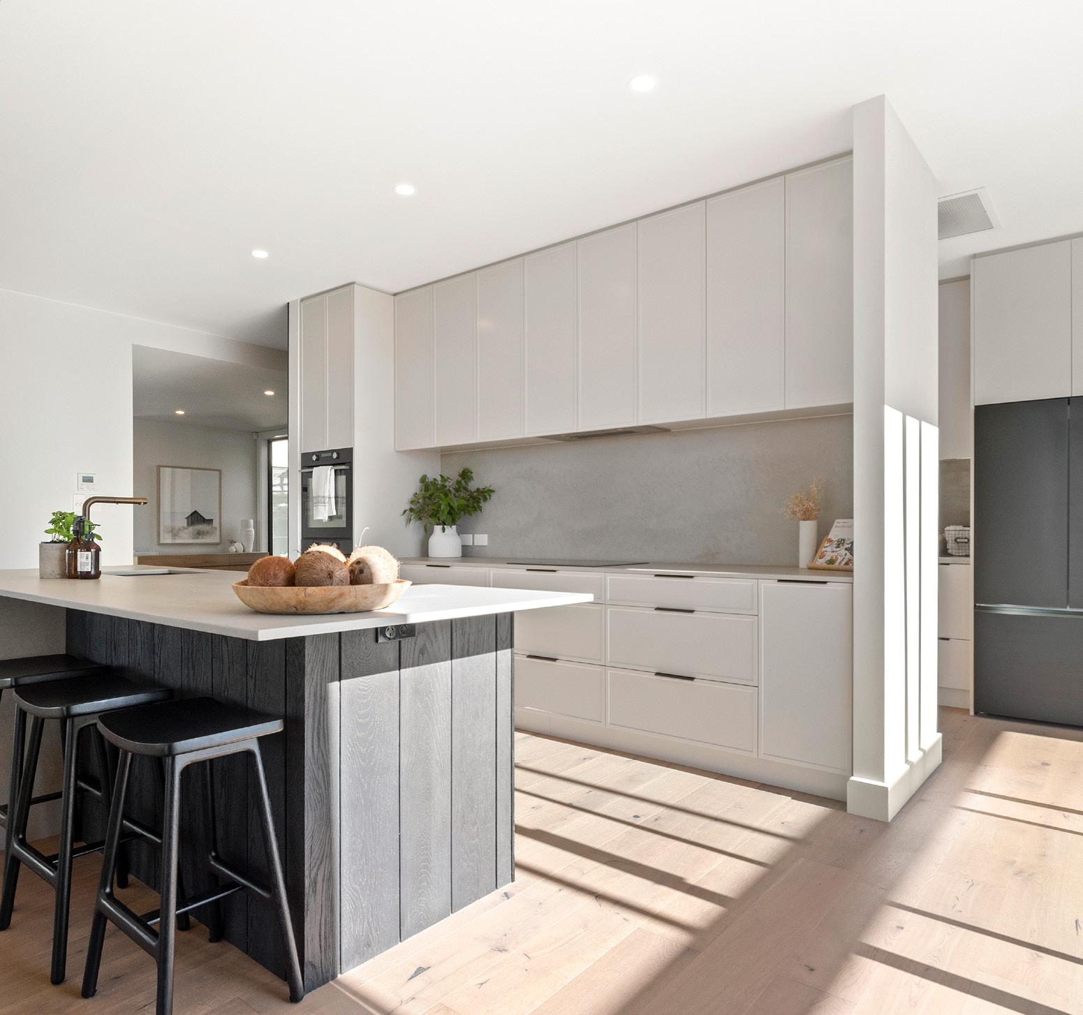 The contrasting tones of this kitchen by Kathrine McDonald create drama. The cabinetry timber has been stained to match the flooring, making the quartzite island a standout feature.