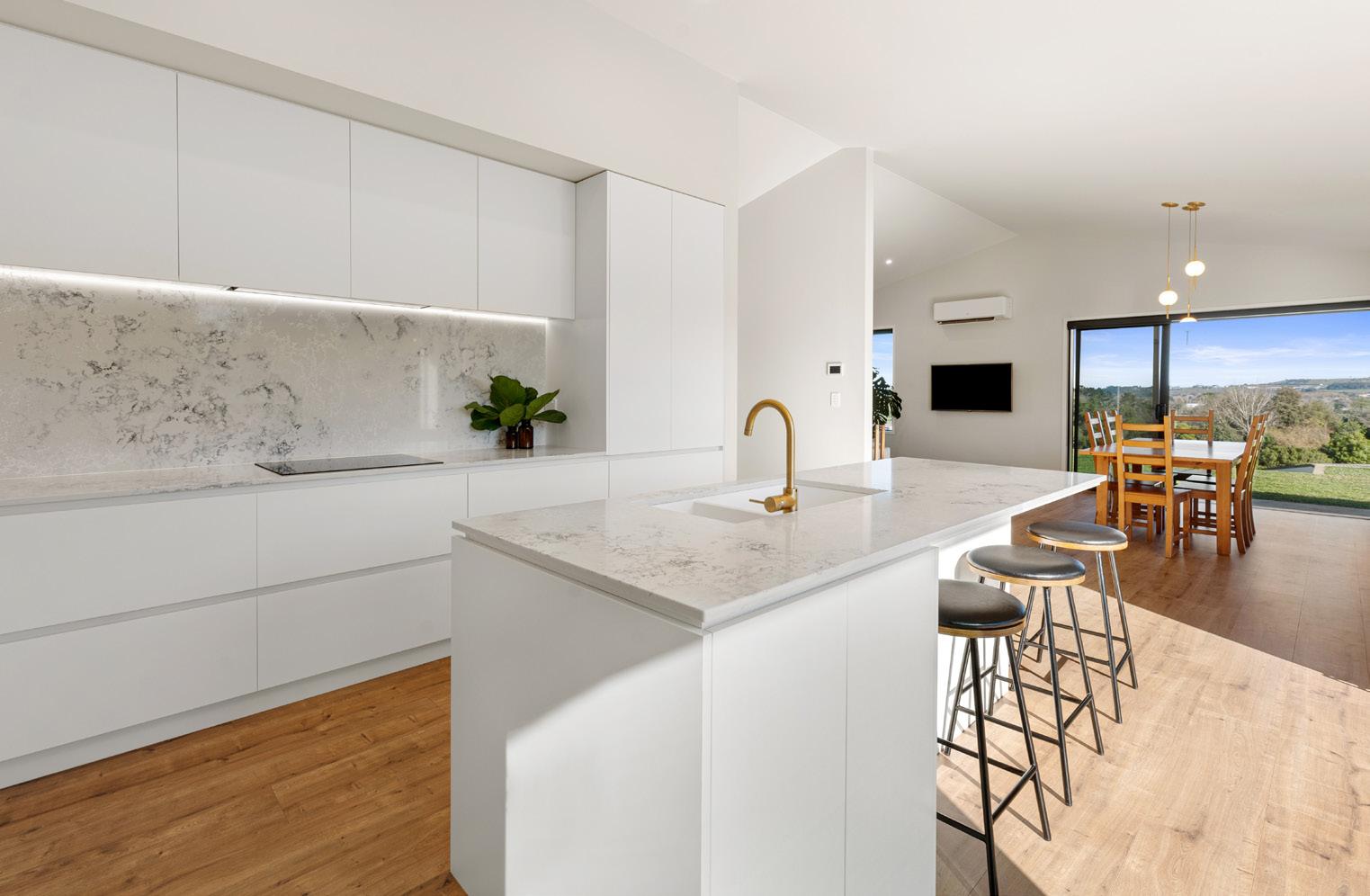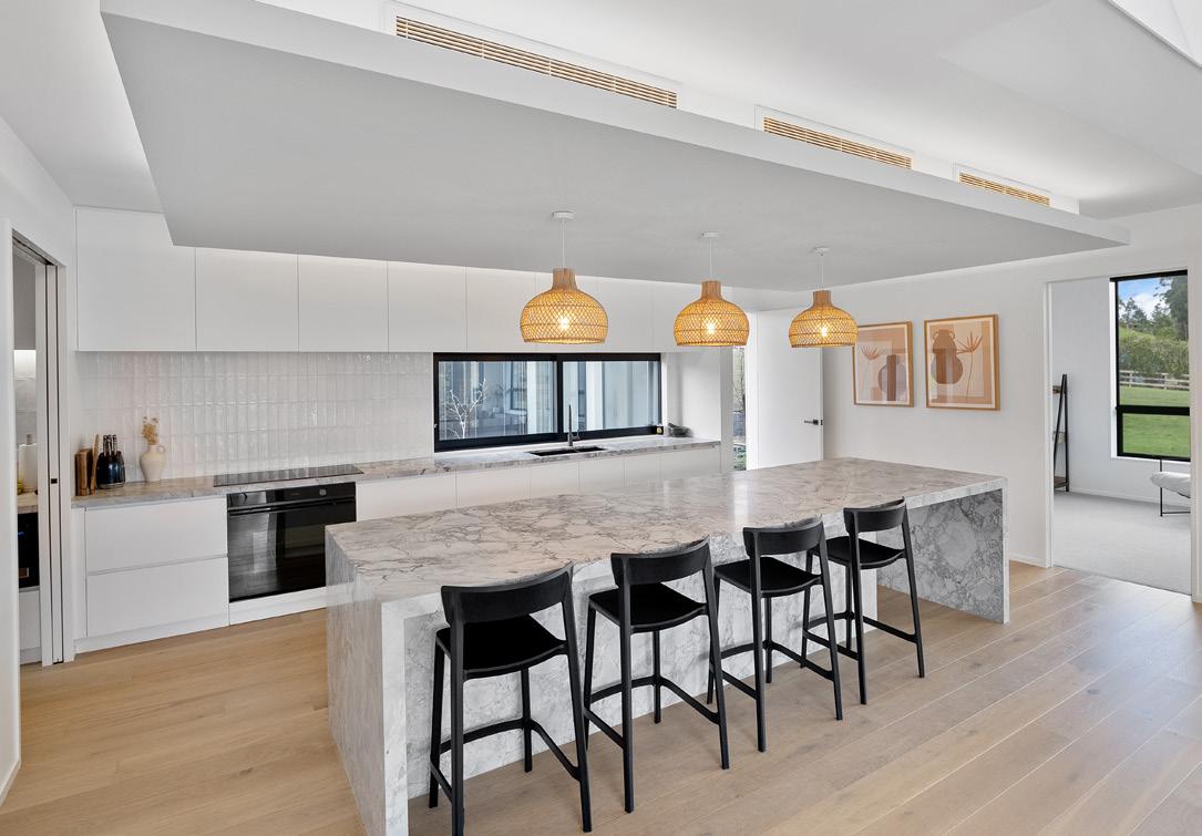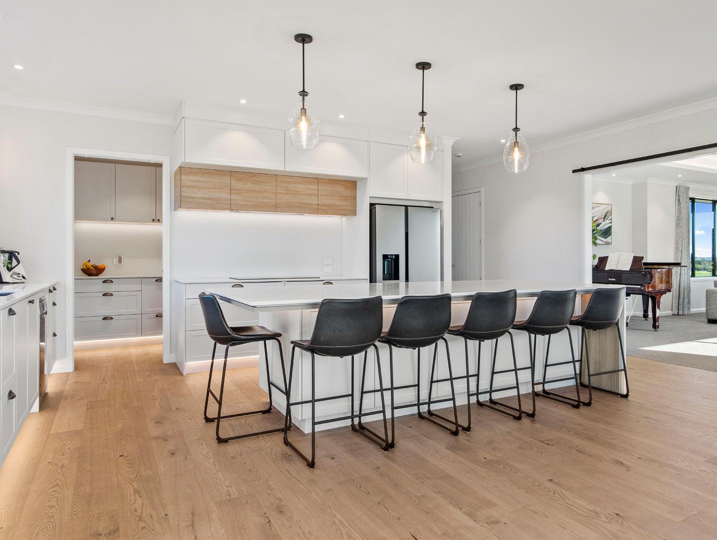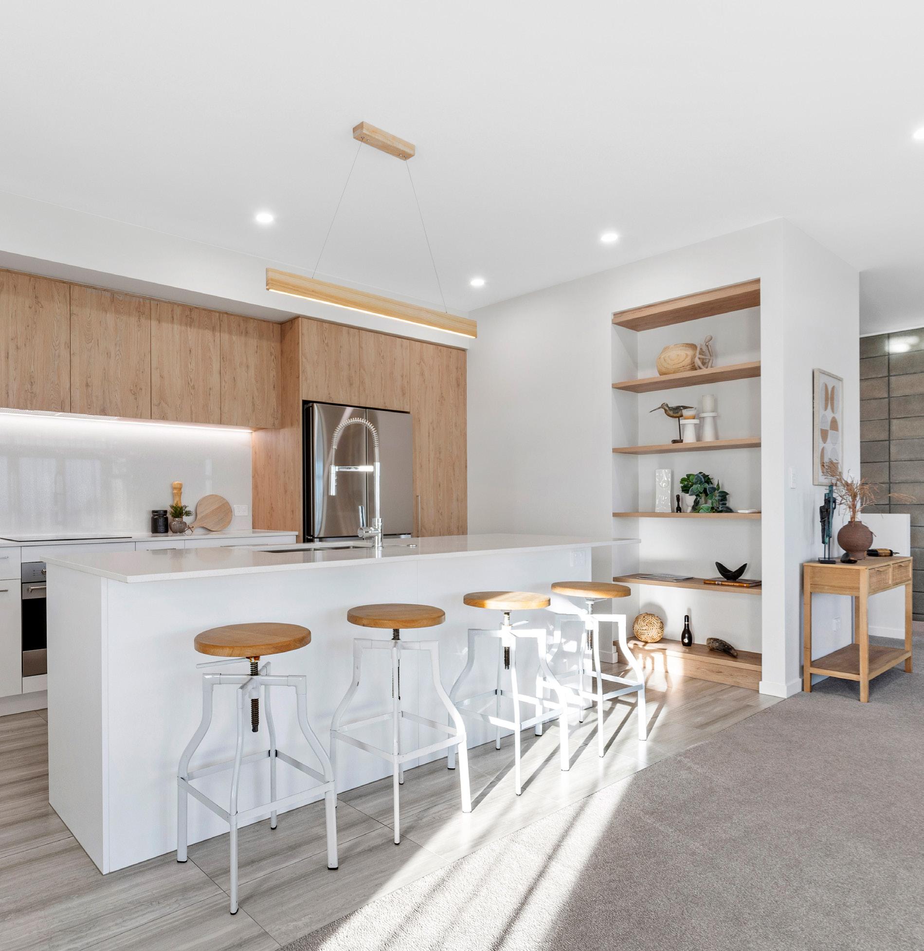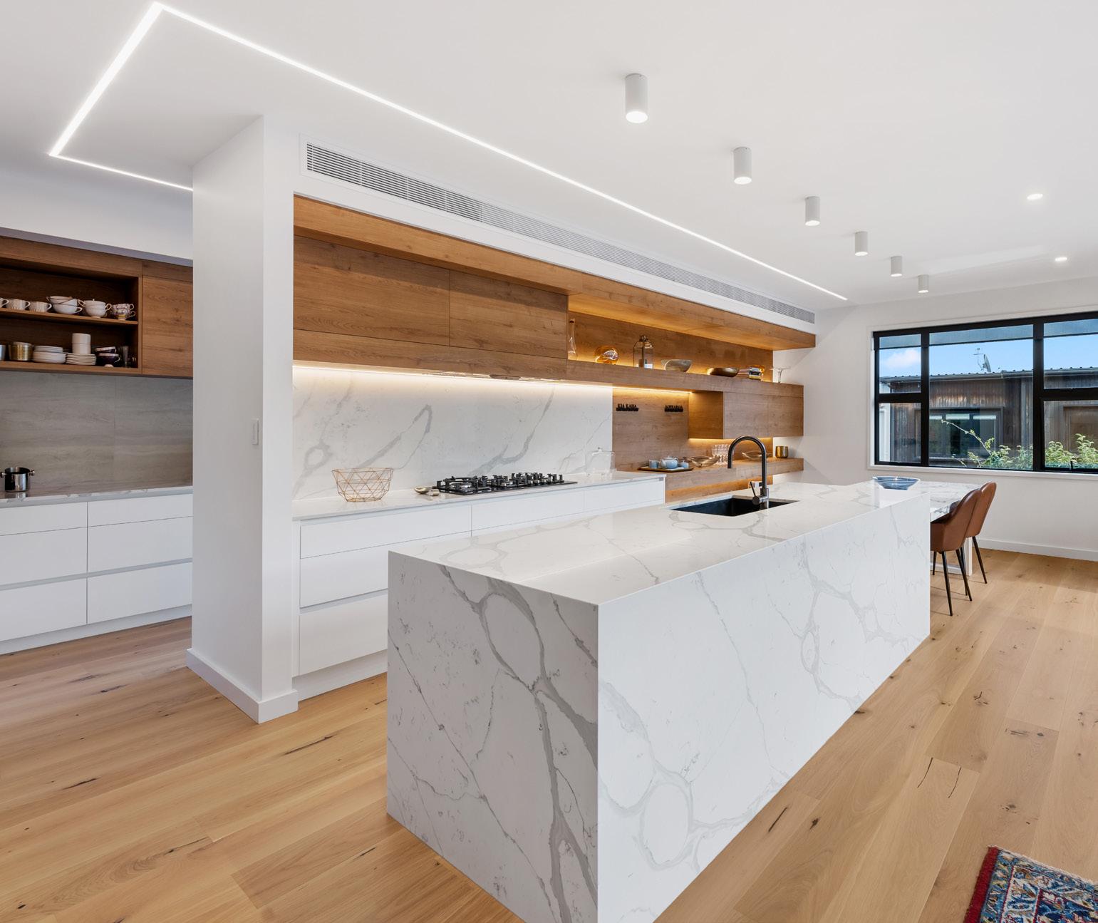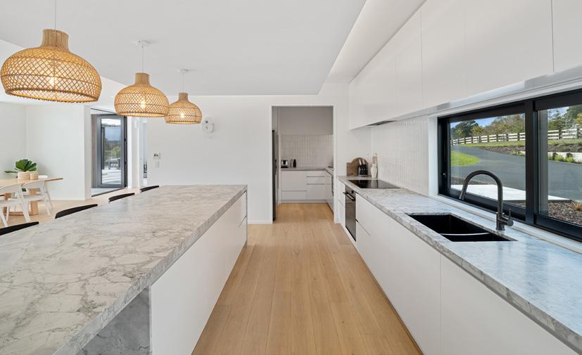 Coastal cool meets sizzling style in this marble-look kitchen with an open scullery. This space, in an elegant Ōrākei home built by Miro Homes, is a template for bringing together tone, texture and intuitive design in one place. Pristine white cabinetry is given depth with open shelving and flooring in timber. Interest is heightened with the marbled surfaces on the island and behind the stovetop, illuminated by downlights. Built into the island is a stepped-down extension, which serves as a breakfast bar and dining table. For more of this house go to page 58