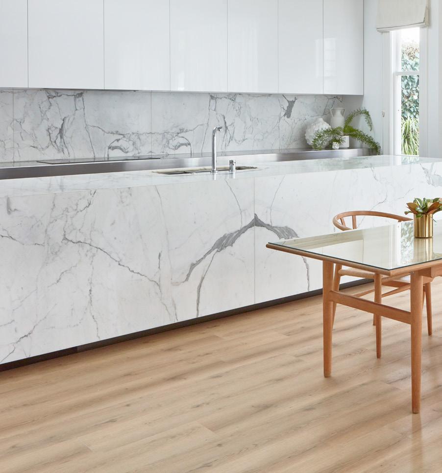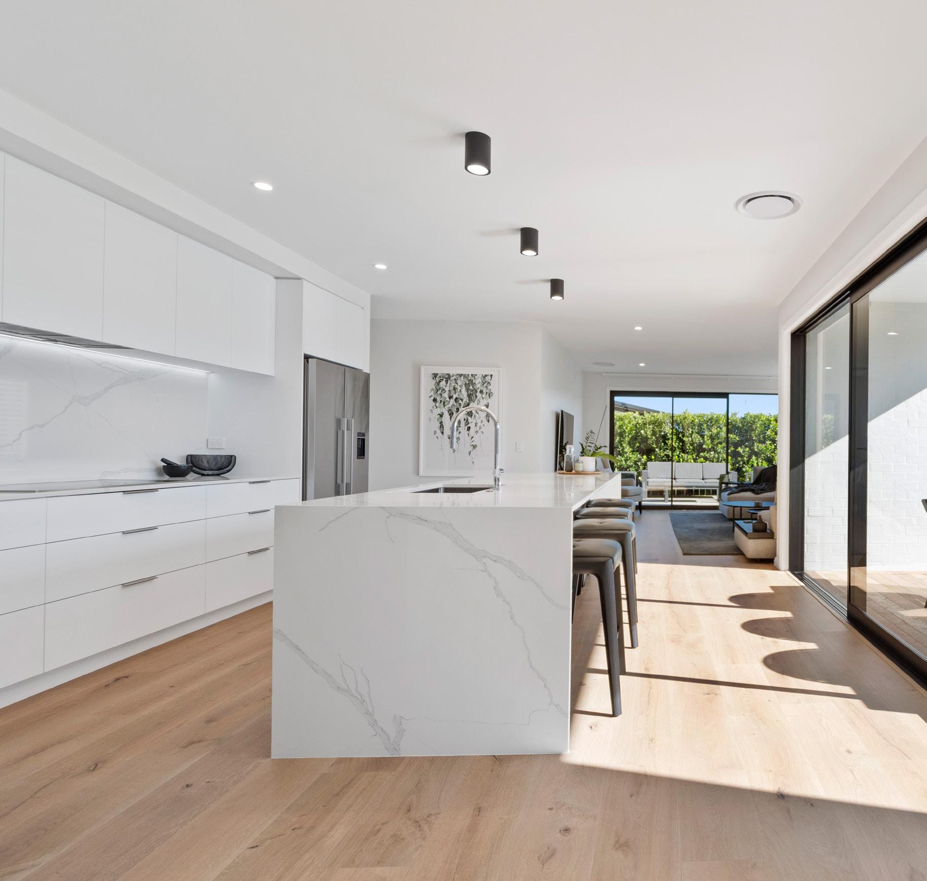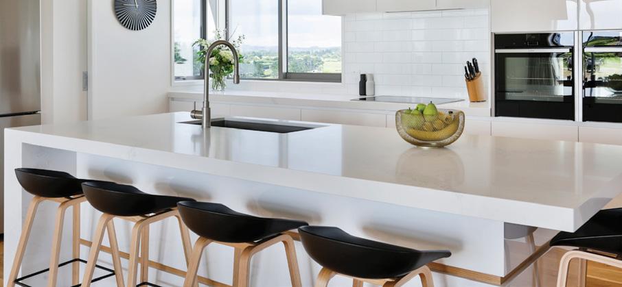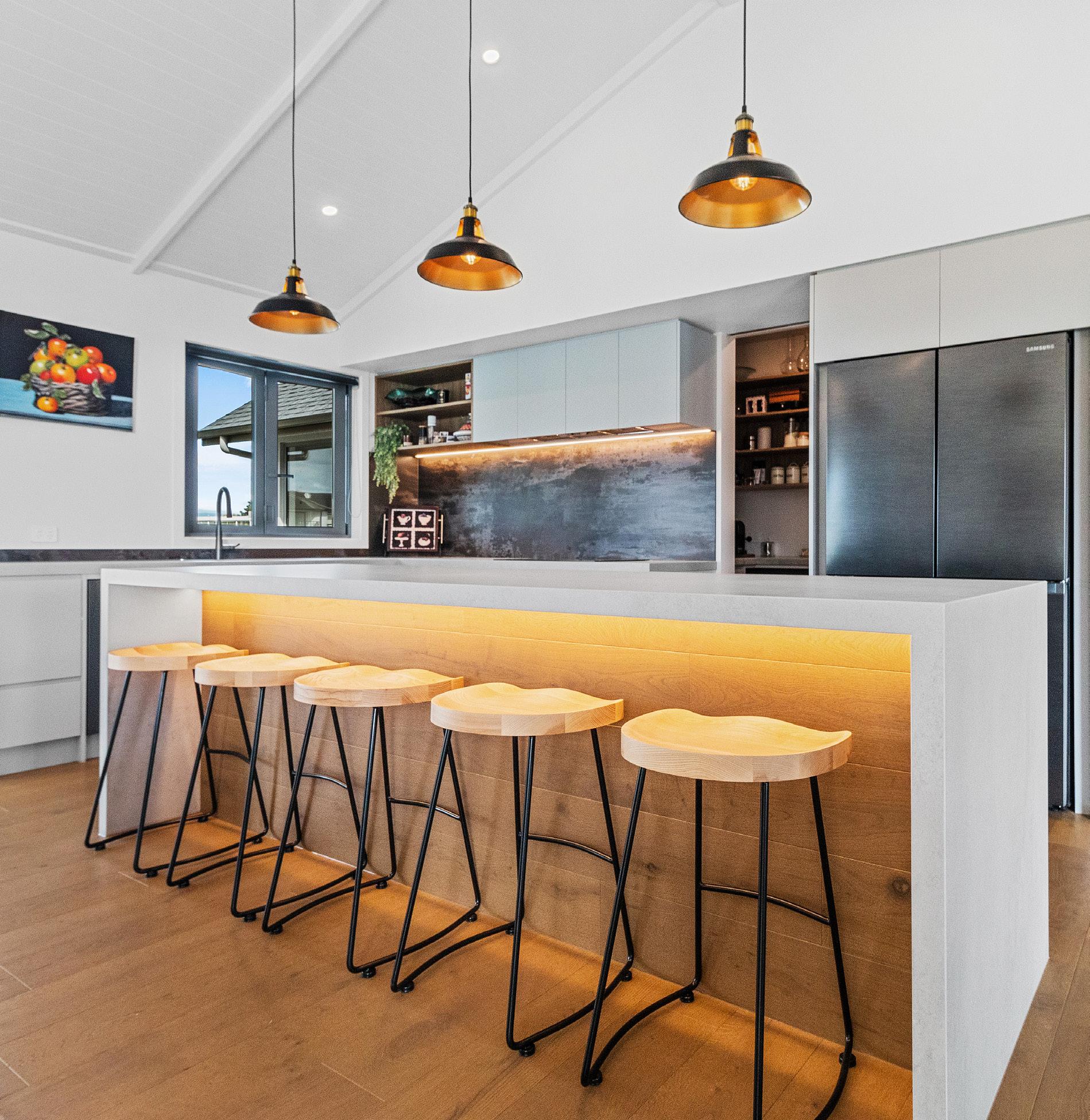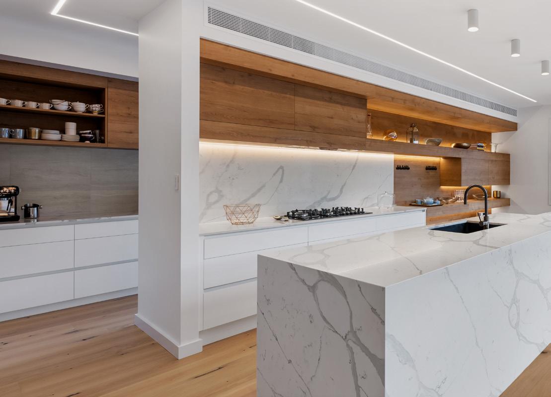 Coastal cool meets sizzling style in this marble-look kitchen with an open scullery. This space, in an elegant Ōrākei home built by Miro Homes, is a template for bringing together tone, texture and intuitive design in one place. Pristine white cabinetry is given depth with open shelving and flooring in timber. Interest is heightened with the marbled surfaces on the island and behind the stovetop, illuminated by downlights. Built into the island is a stepped-down extension, which serves as a breakfast bar and dining table. For more of this house go to page 58