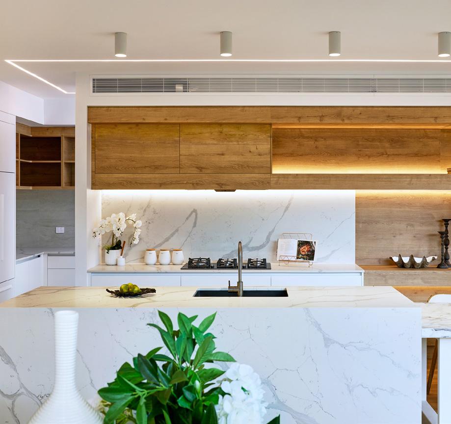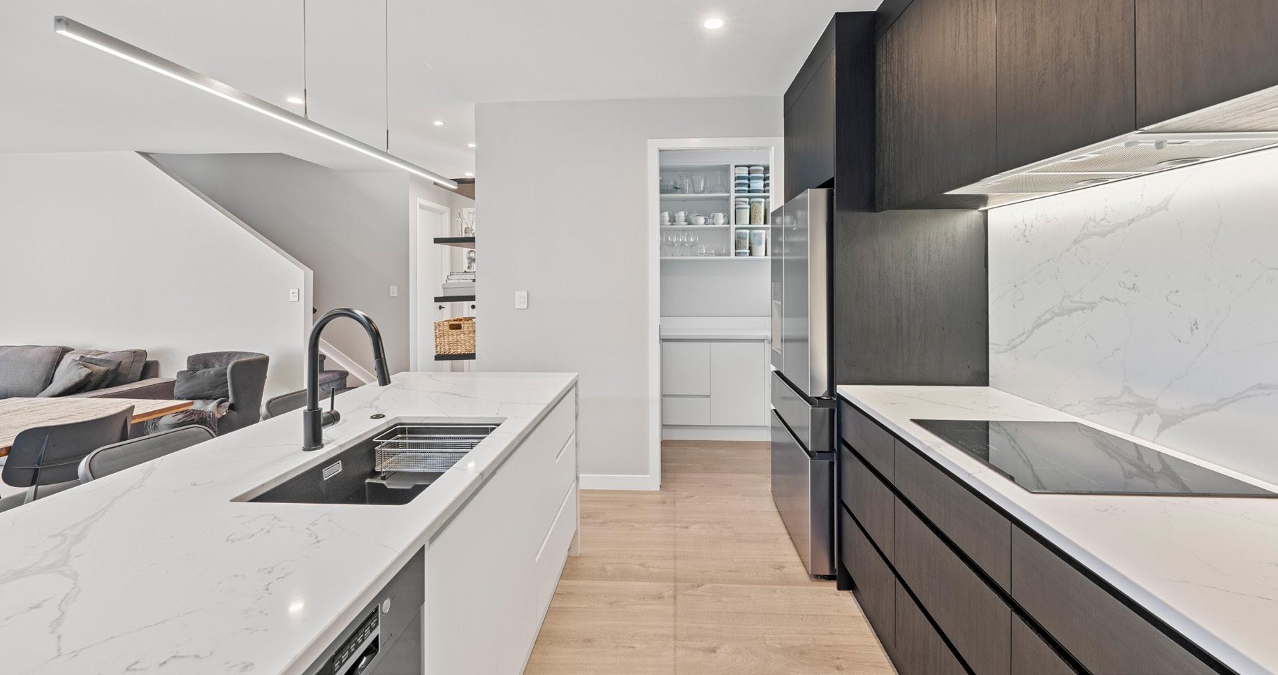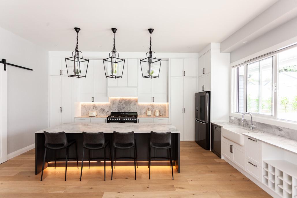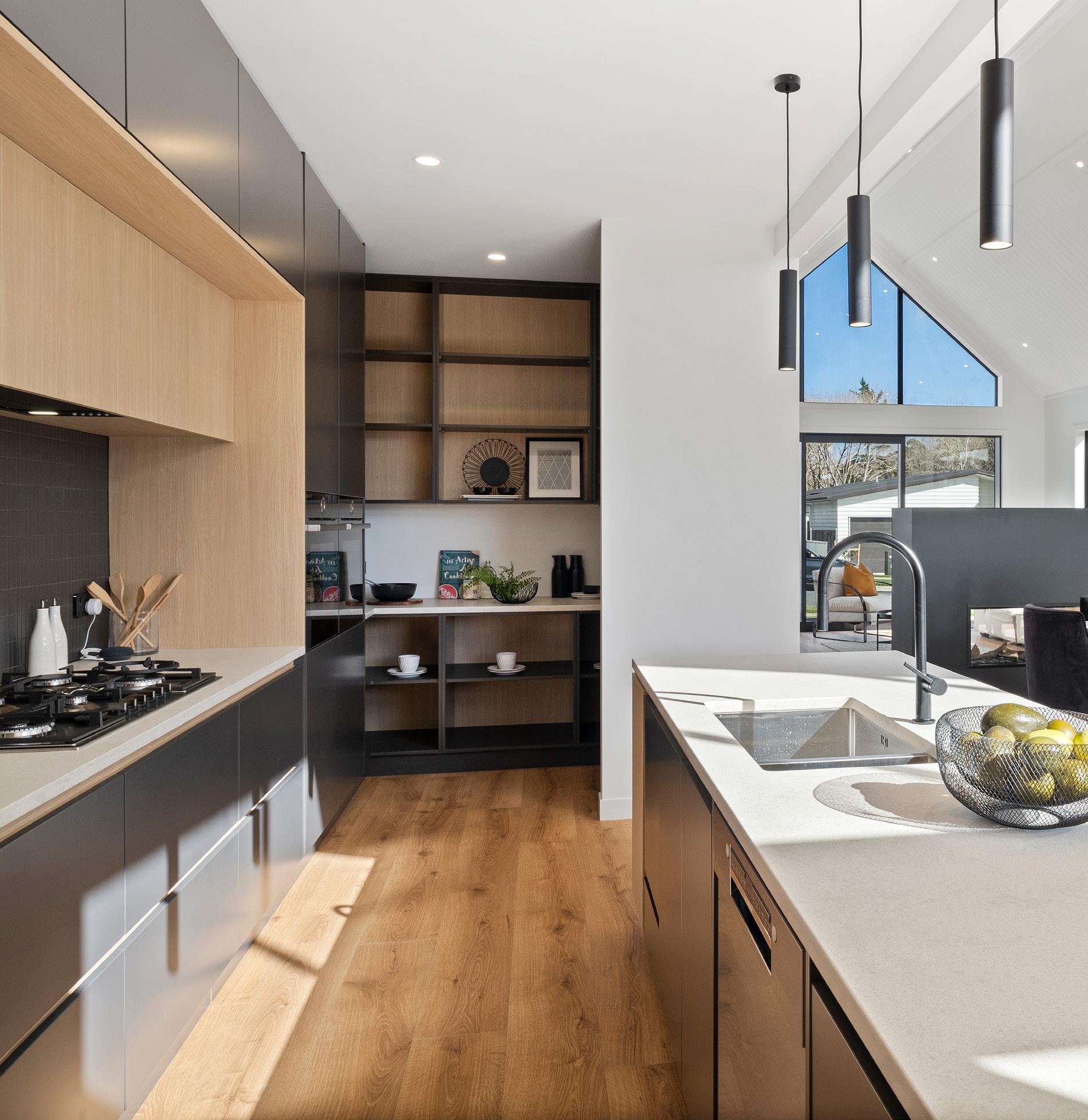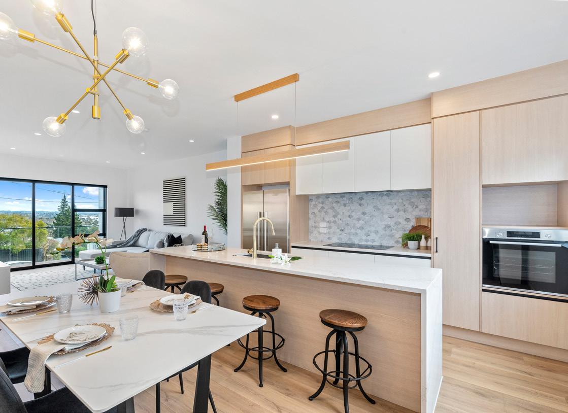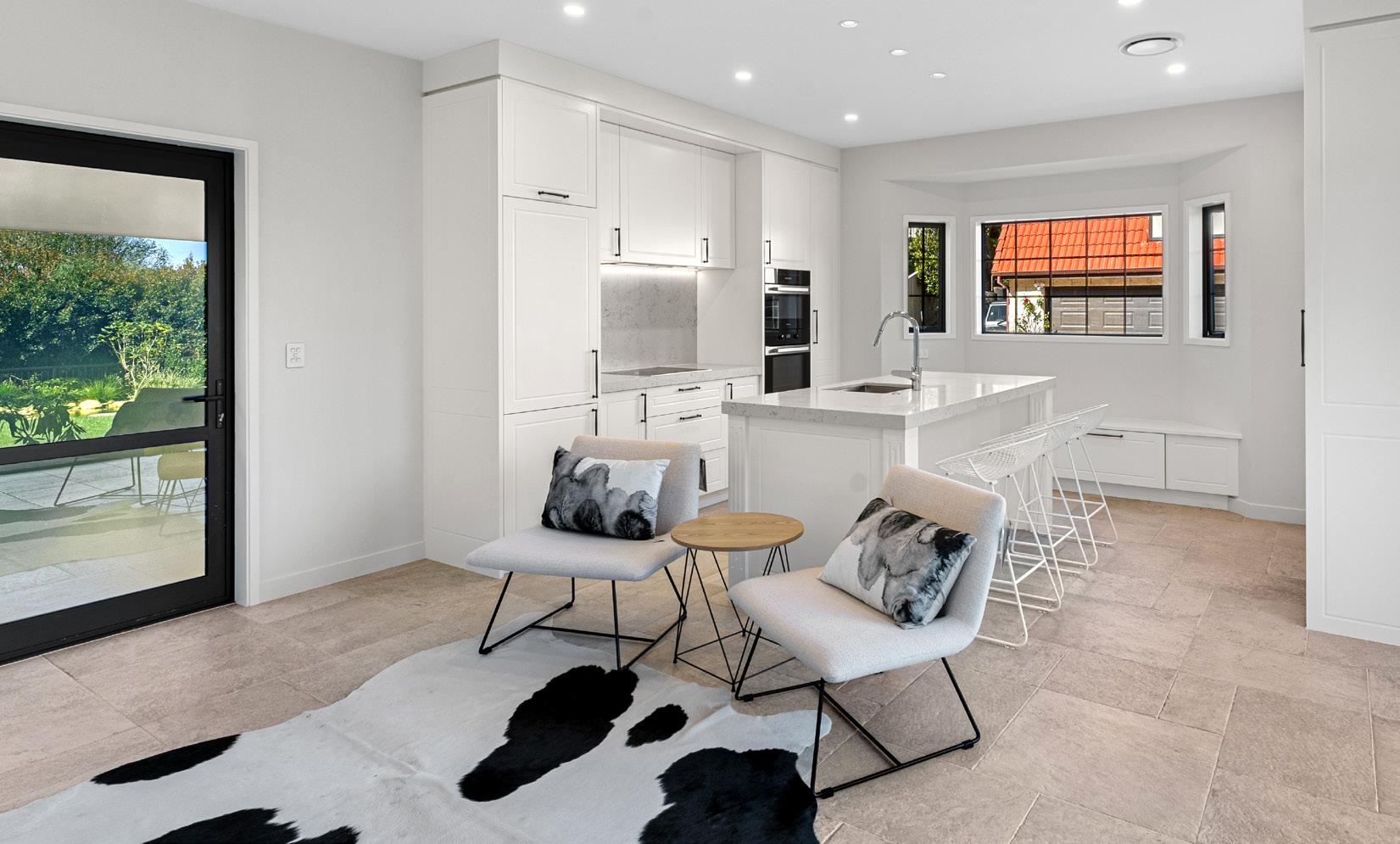 Coastal cool meets sizzling style in this marble-look kitchen with an open scullery. This space, in an elegant Ōrākei home built by Miro Homes, is a template for bringing together tone, texture and intuitive design in one place. Pristine white cabinetry is given depth with open shelving and flooring in timber. Interest is heightened with the marbled surfaces on the island and behind the stovetop, illuminated by downlights. Built into the island is a stepped-down extension, which serves as a breakfast bar and dining table. For more of this house go to page 58