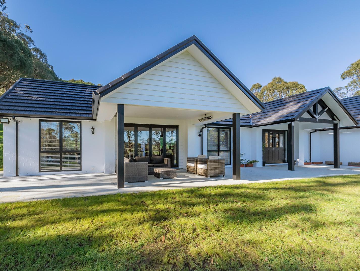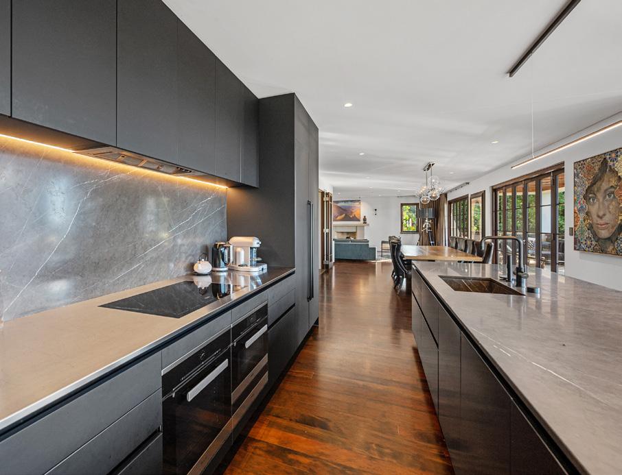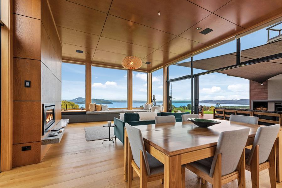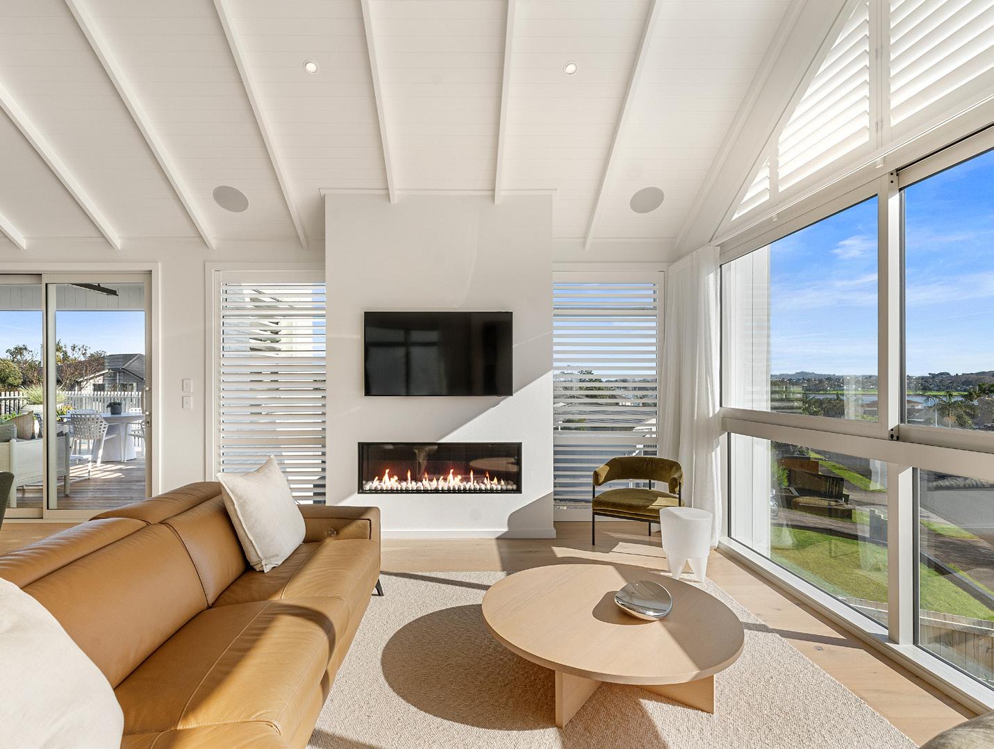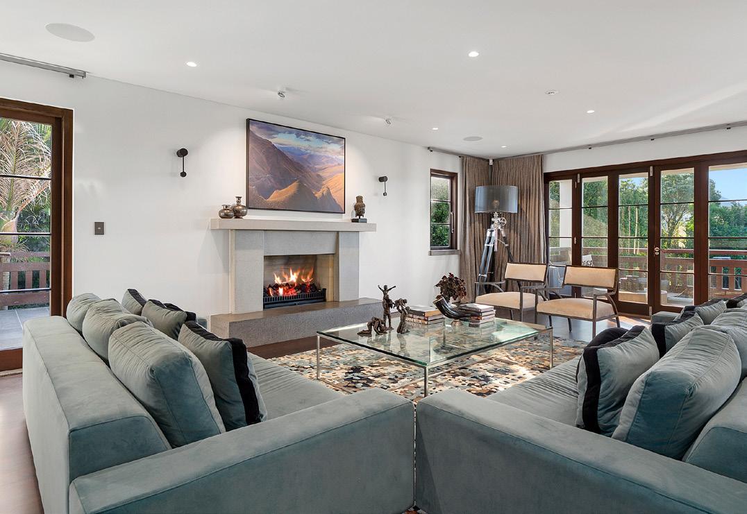 Multiple living zones, each equipped with a cosy fireplace, provide the space for intimate gatherings and supersized shindigs. The enormous kitchen-dining area leads out through huge sliding glass doors onto a deck, with louvres allowing year-round use. Automatic interior