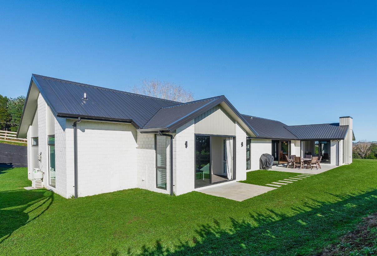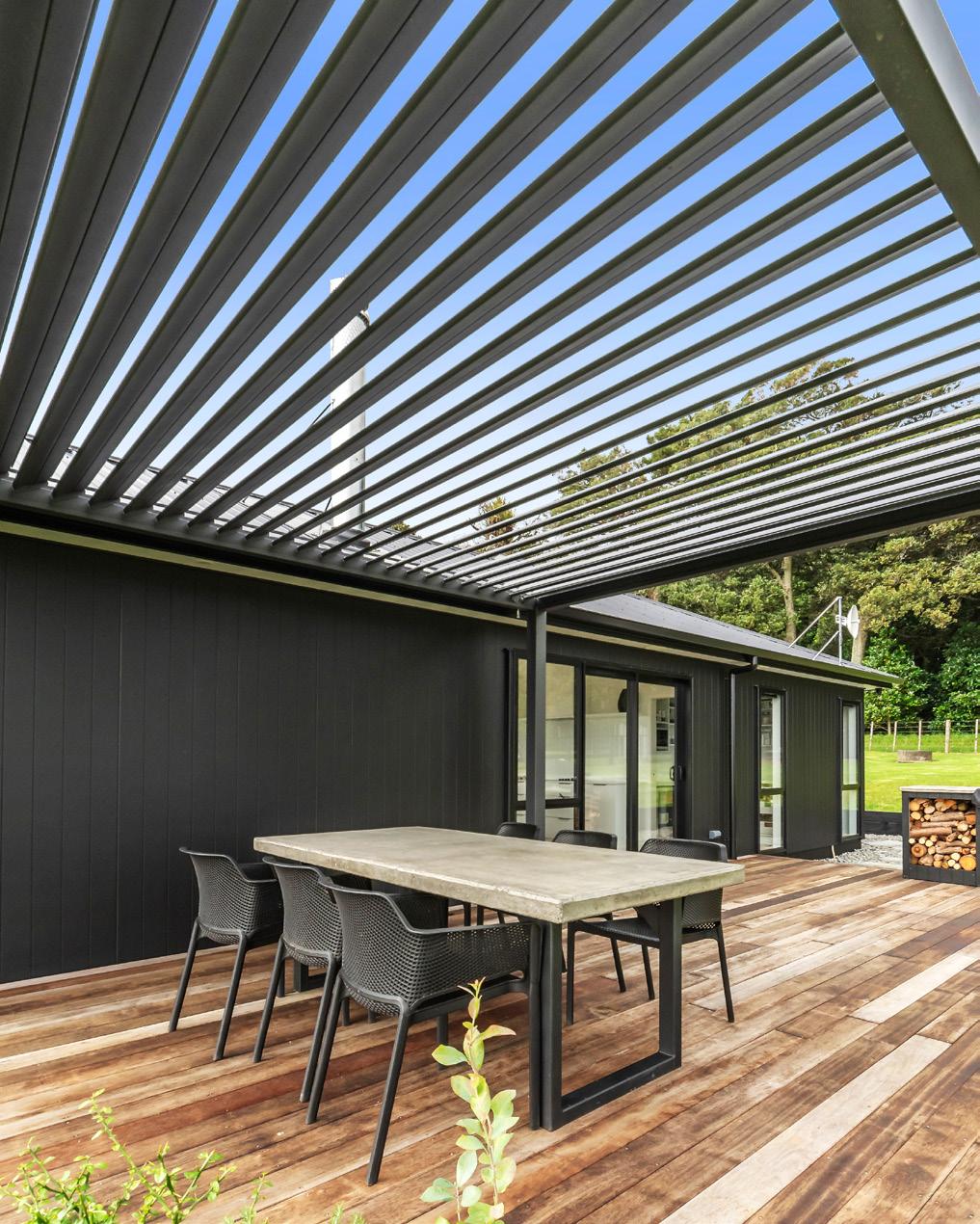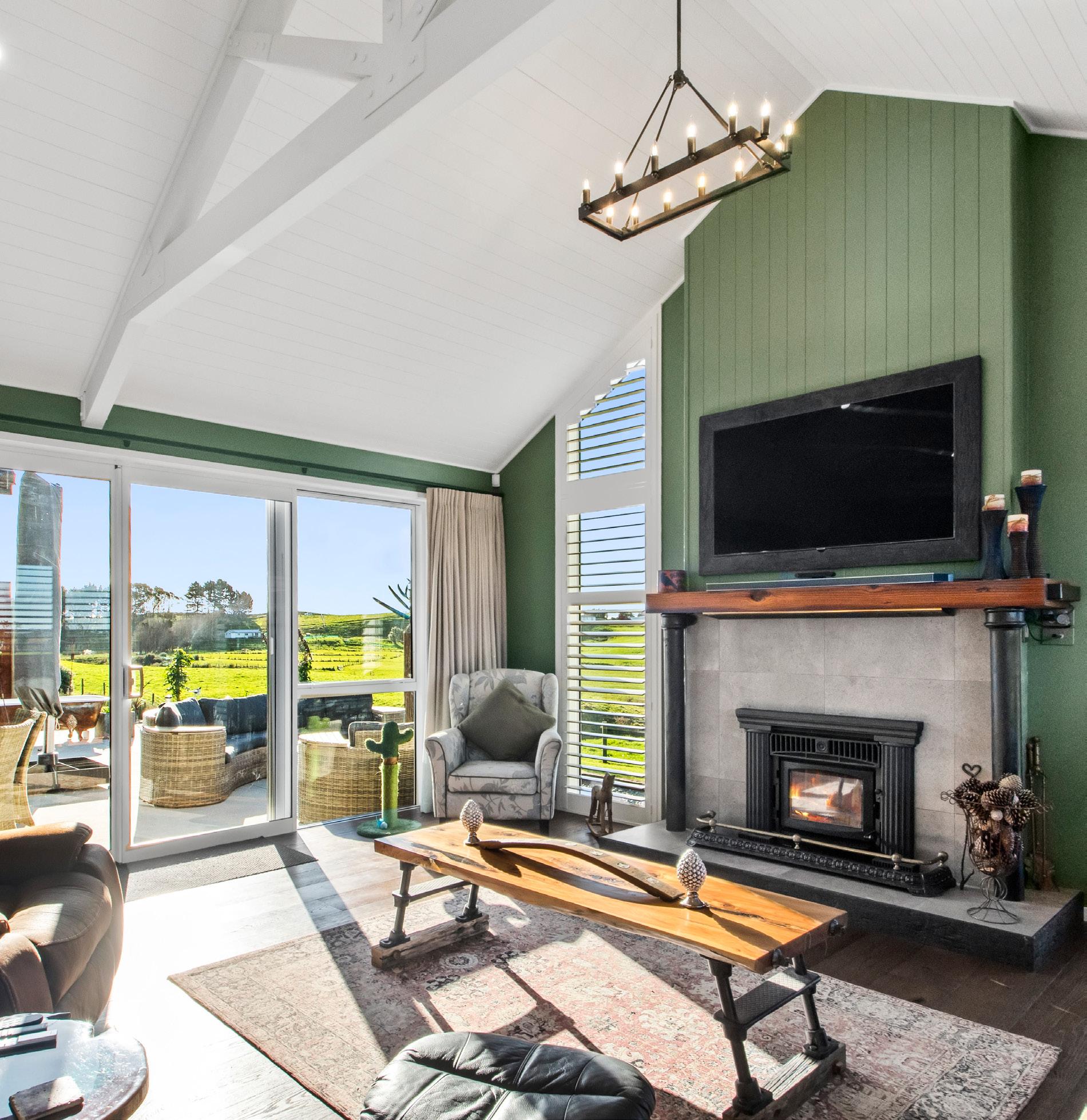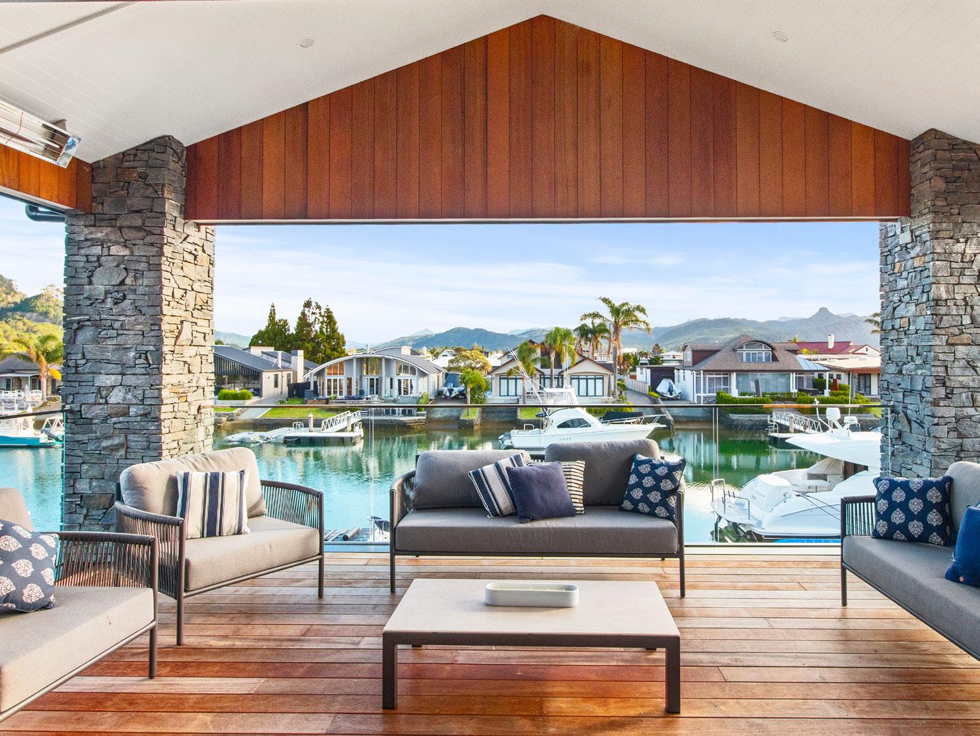 Multiple living zones, each equipped with a cosy fireplace, provide the space for intimate gatherings and supersized shindigs. The enormous kitchen-dining area leads out through huge sliding glass doors onto a deck, with louvres allowing year-round use. Automatic interior