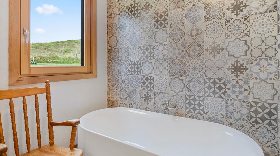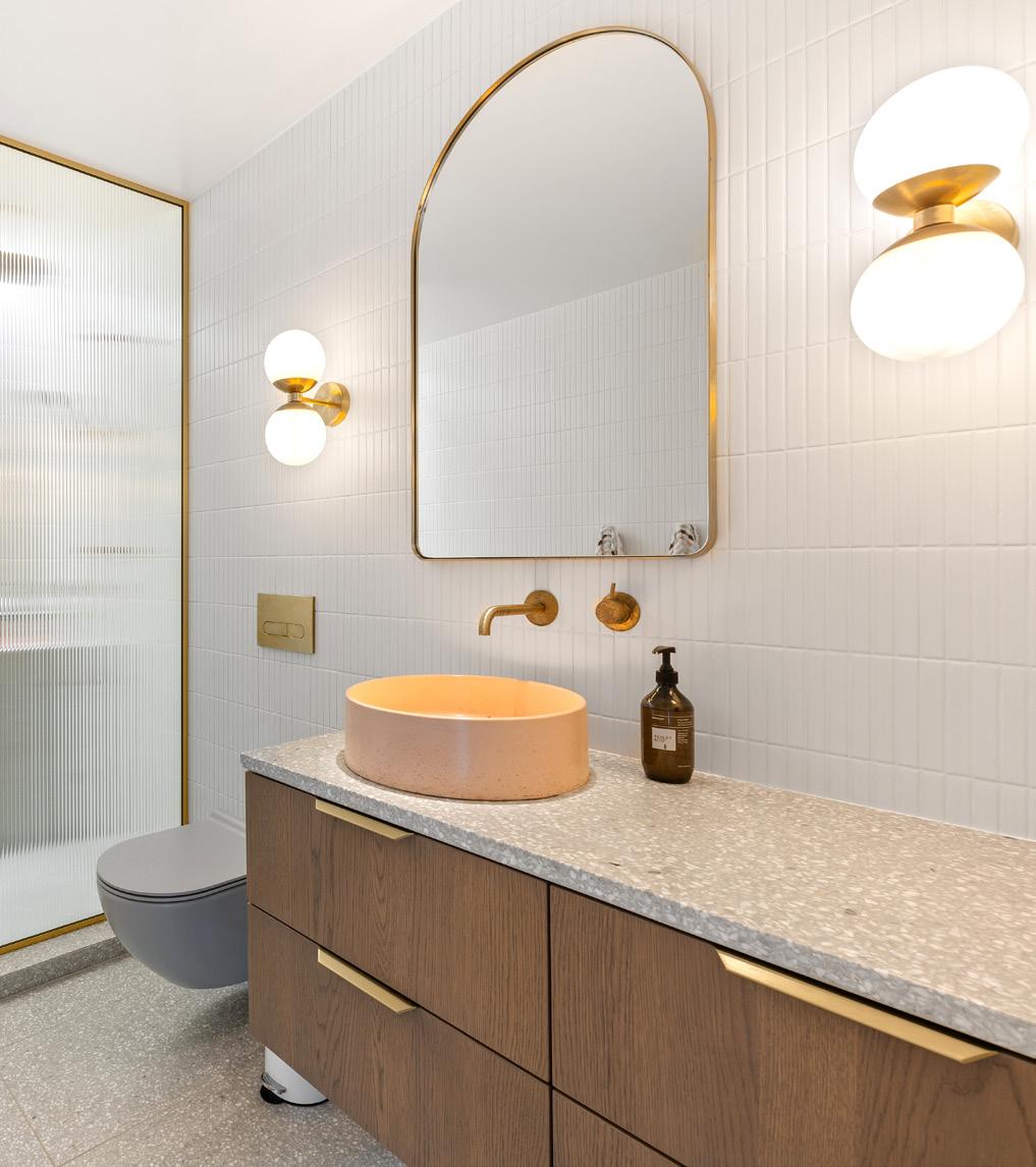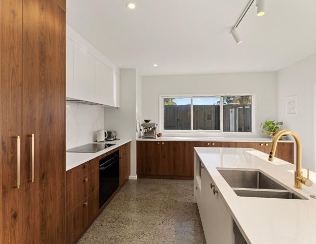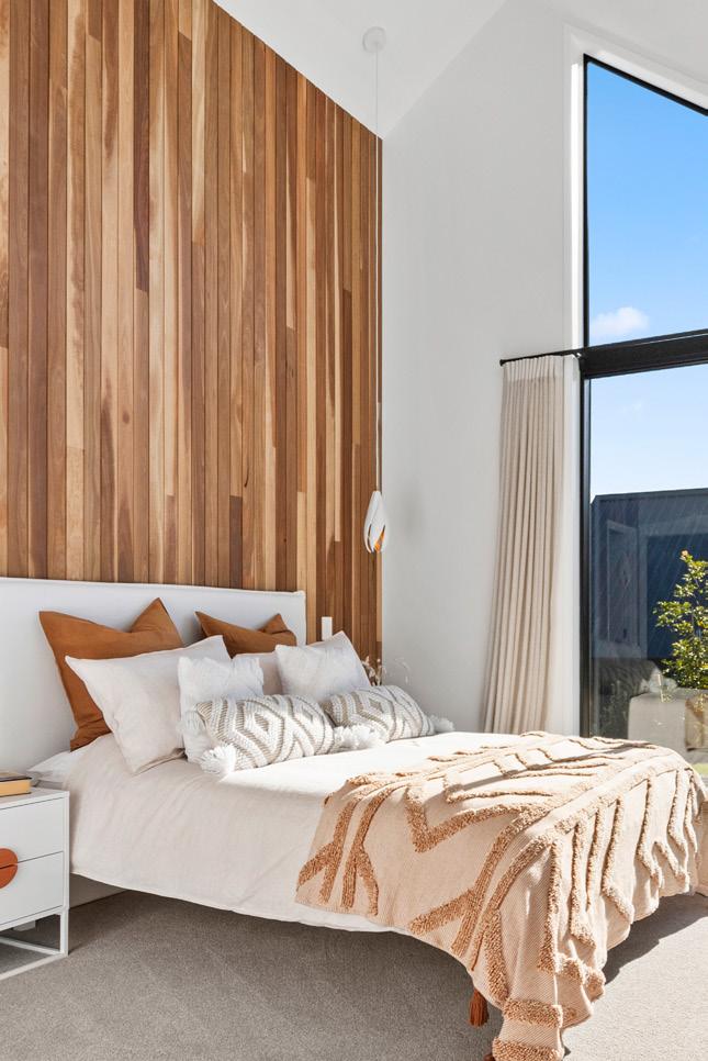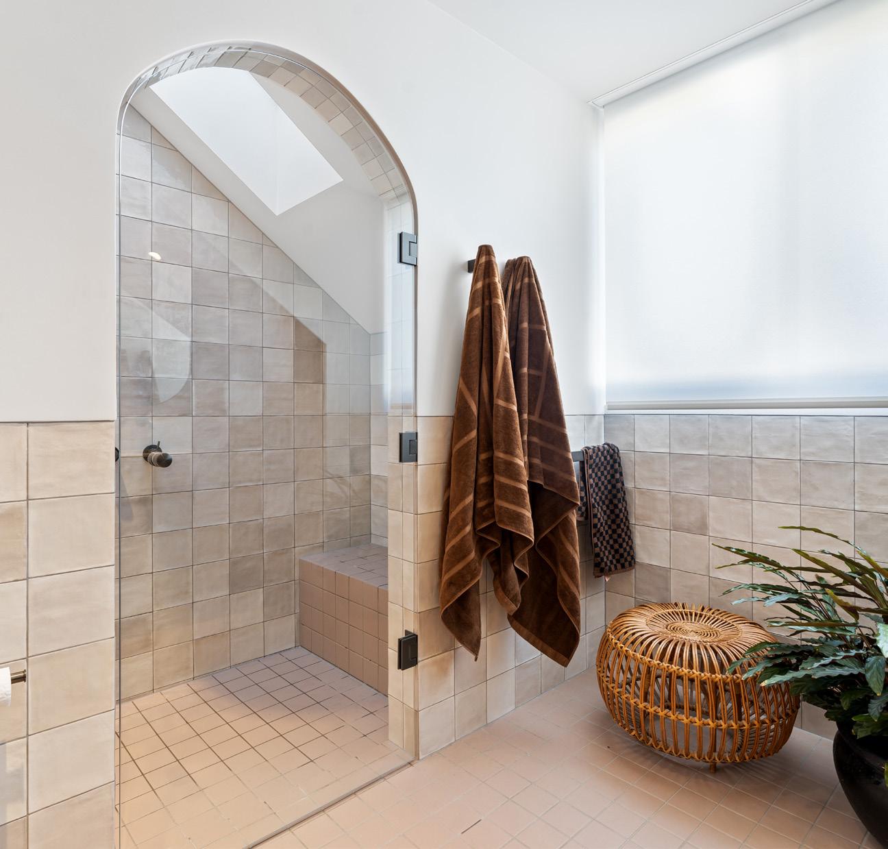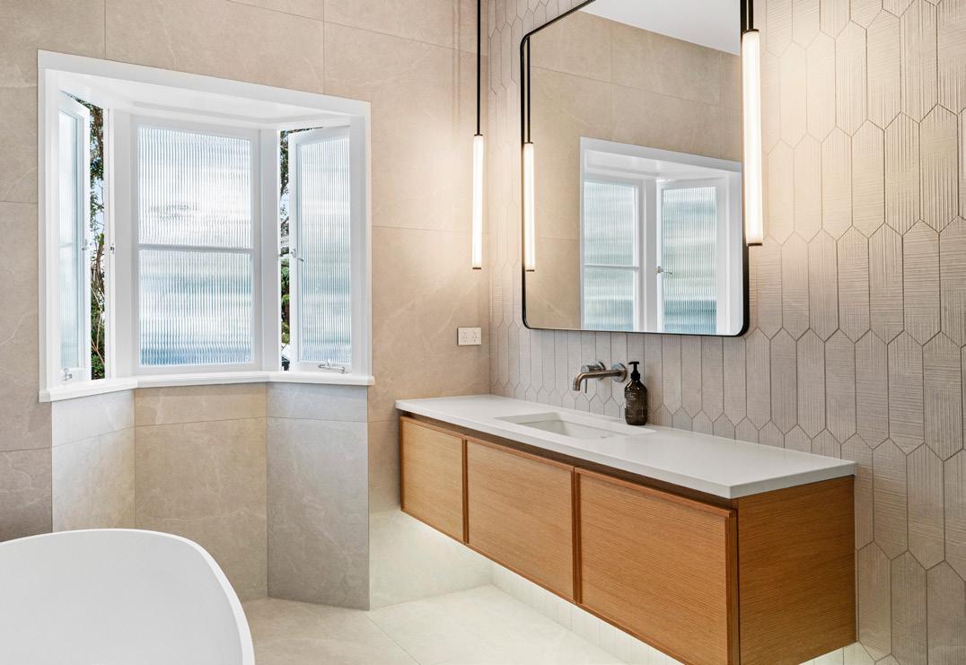 The work also included converting the former lounge into a main bedroom, creating a new laundry and producing two new bathrooms, both tiled delights. The main bathroom, with standalone bath, has a feature wall with striking golden tiles while the ensuite returns to the theme of timber, with the addition of rippled khaki tiles.