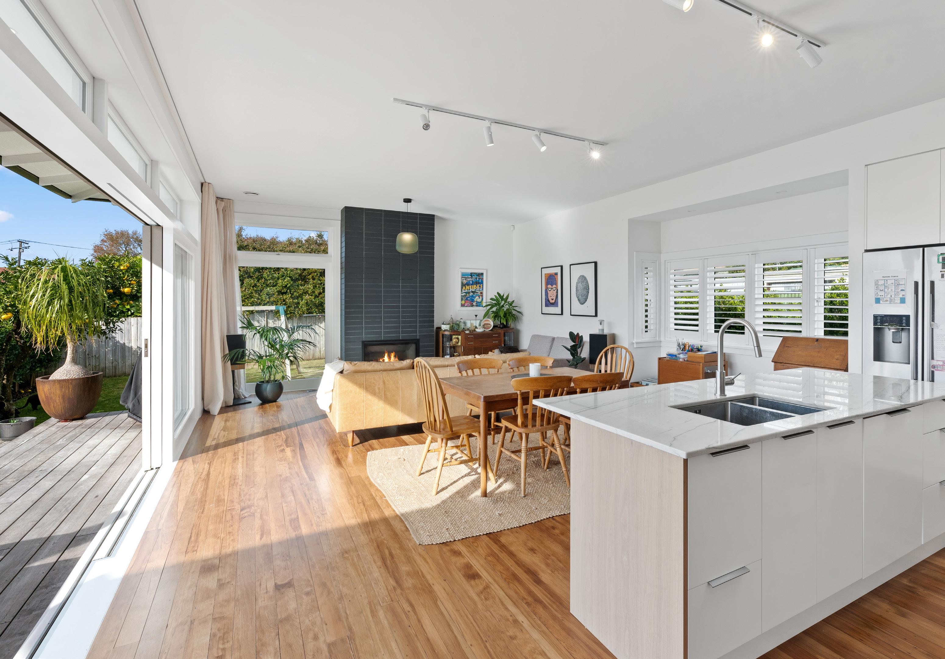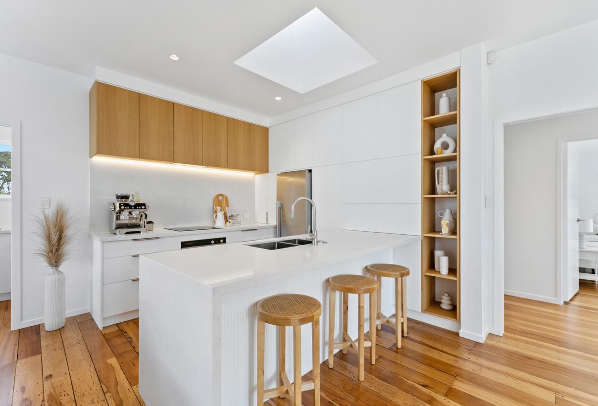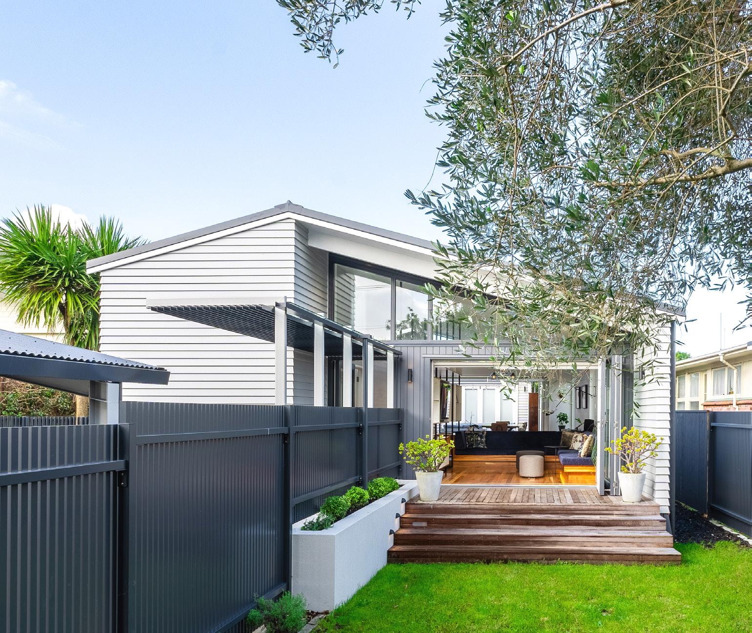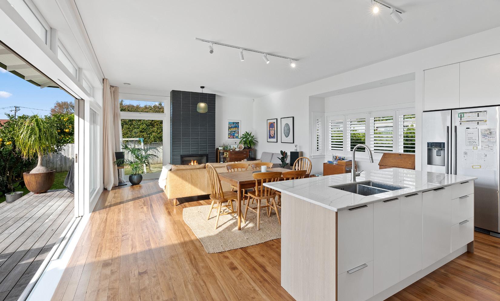 garage. A flush garage door matches the white timber exterior. Inside, the original house now contains three bedrooms, a study, bathroom and lounge, while the new build at the rear has a very modern feel.