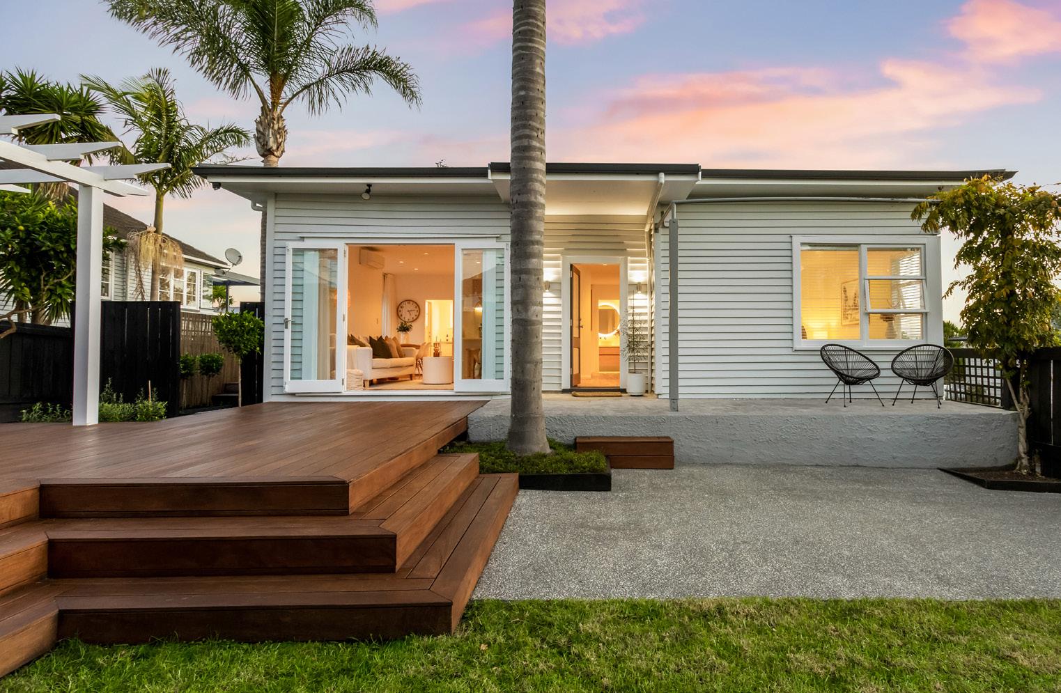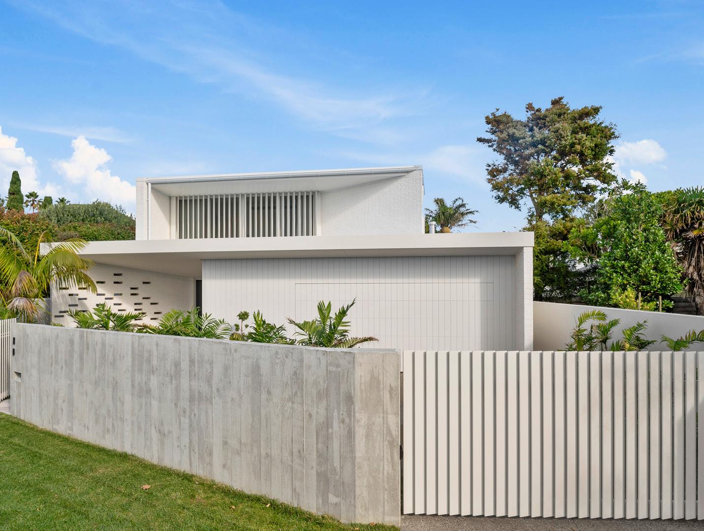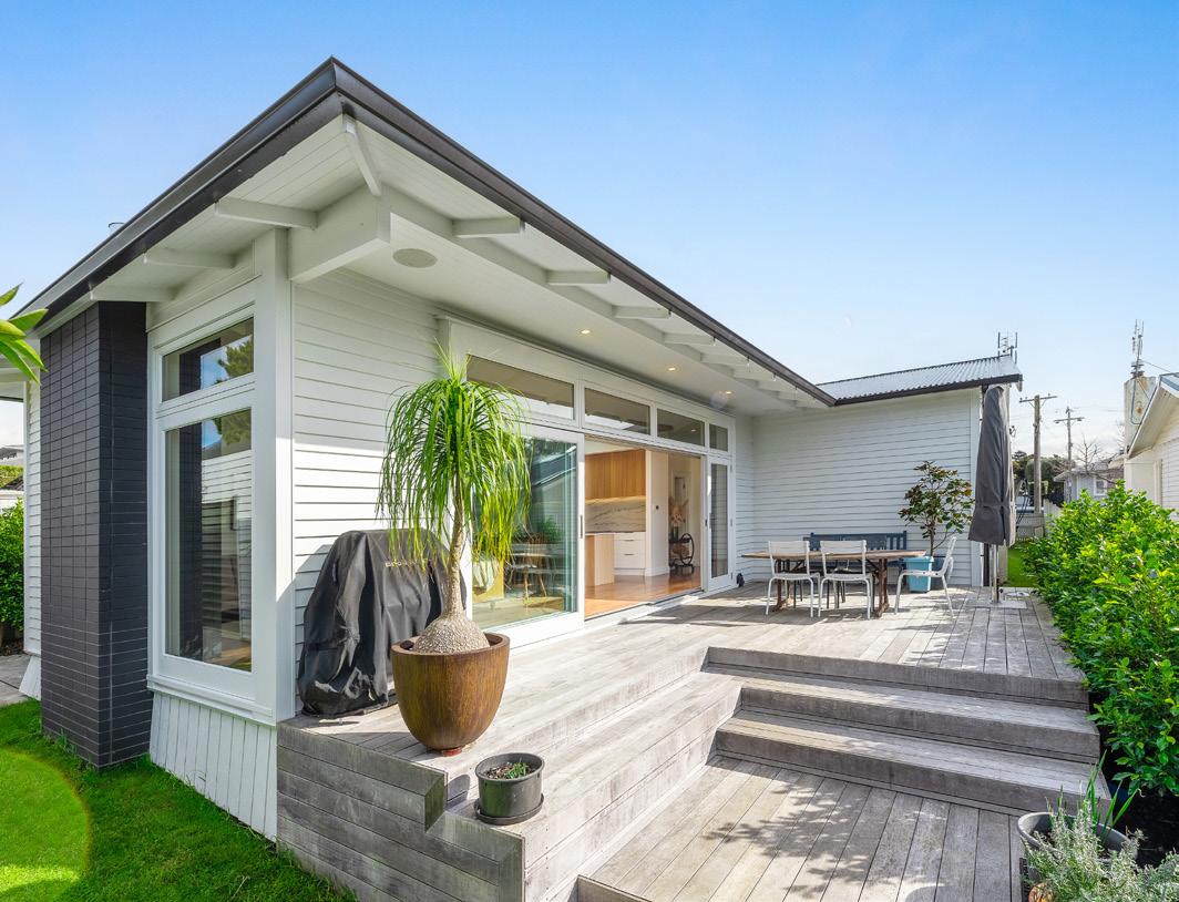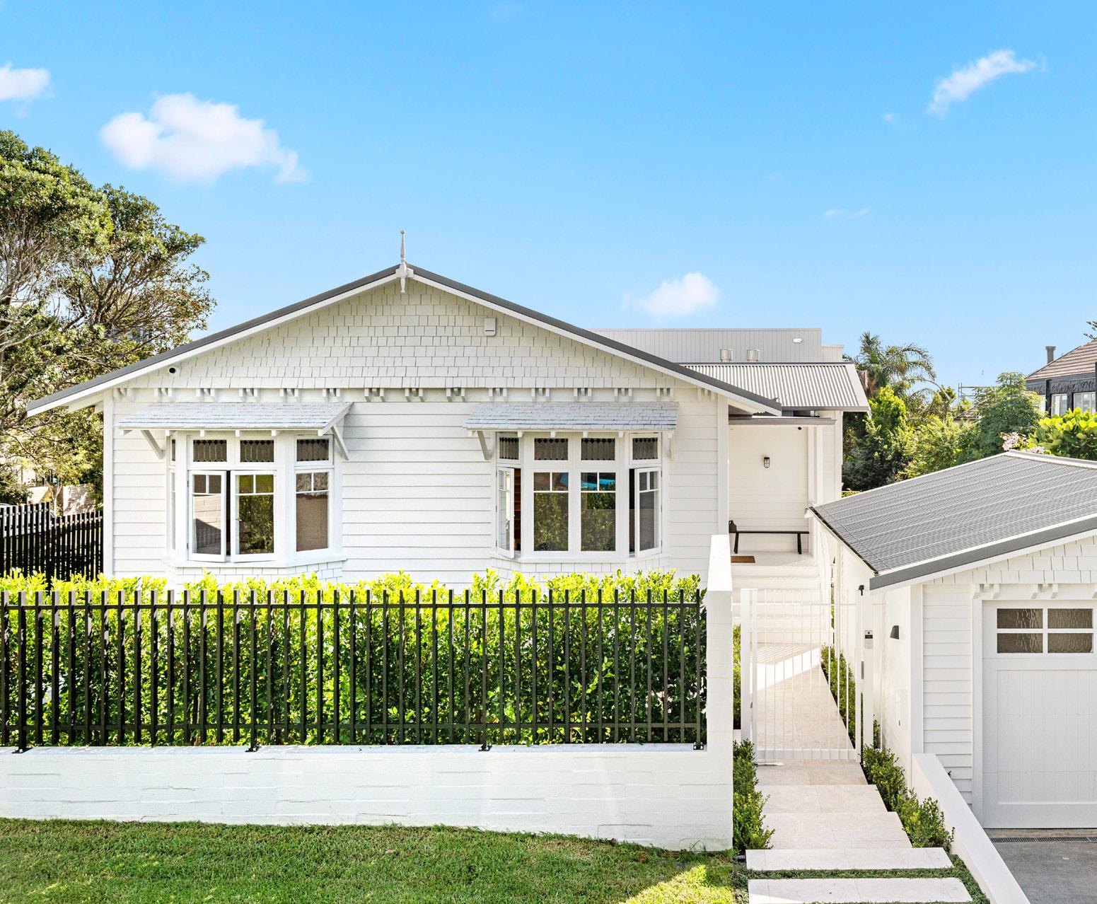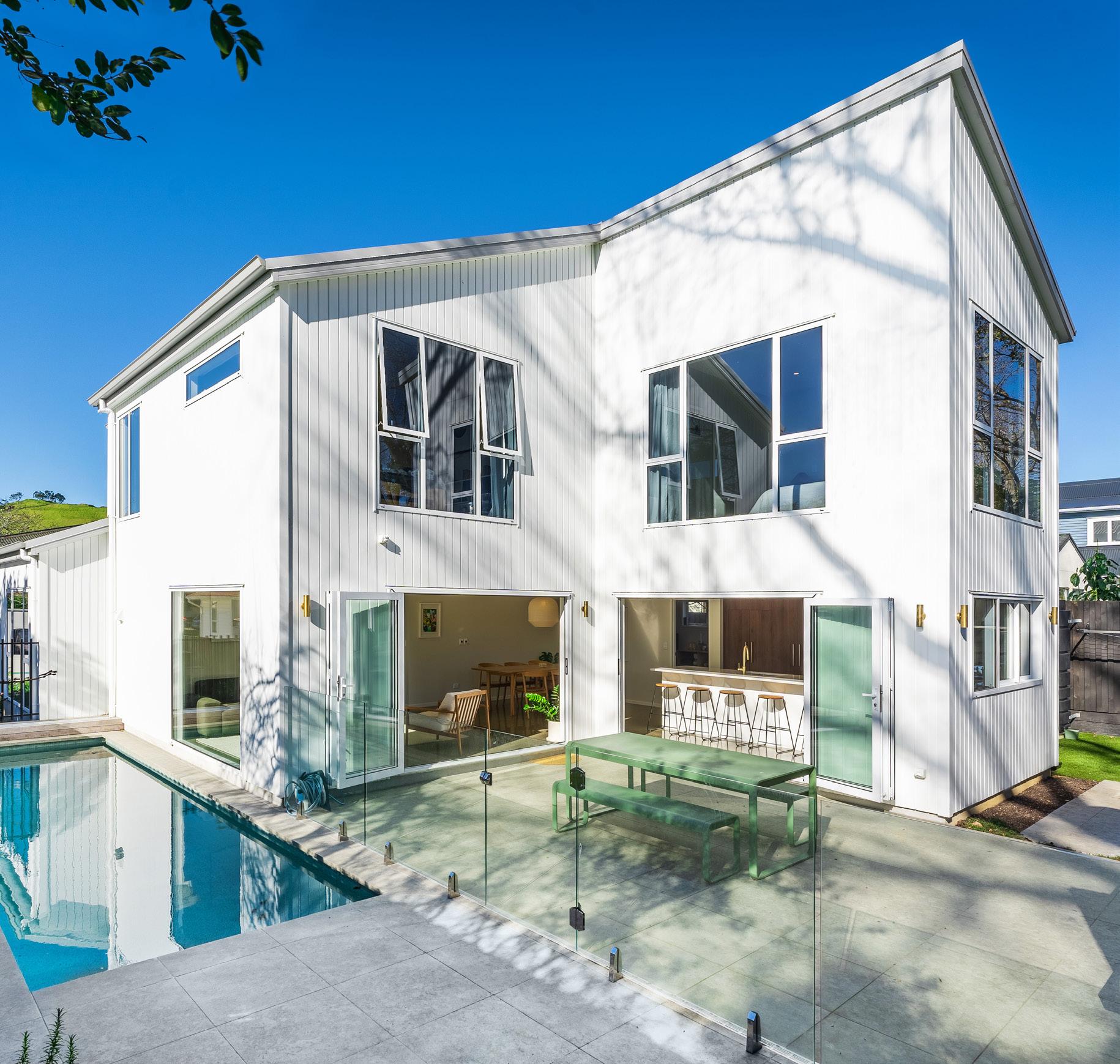 garage. A flush garage door matches the white timber exterior. Inside, the original house now contains three bedrooms, a study, bathroom and lounge, while the new build at the rear has a very modern feel.