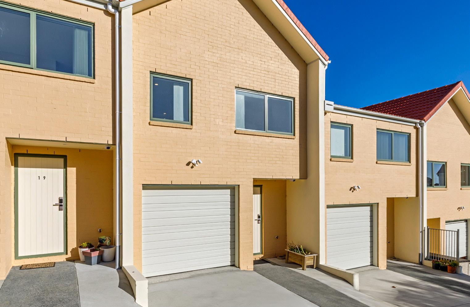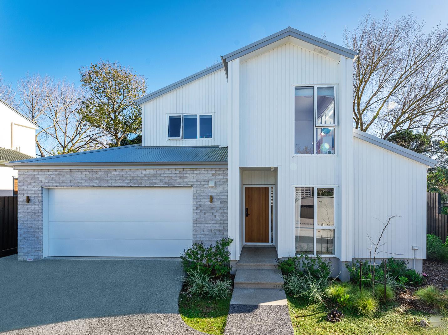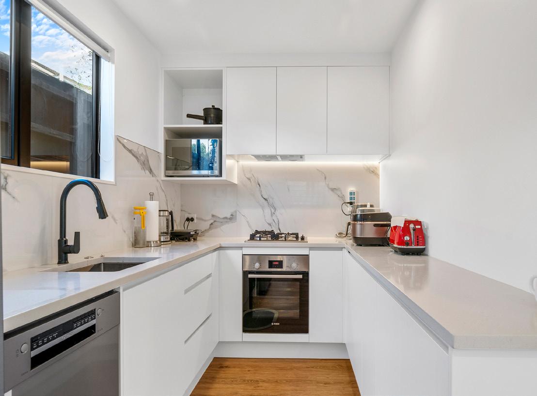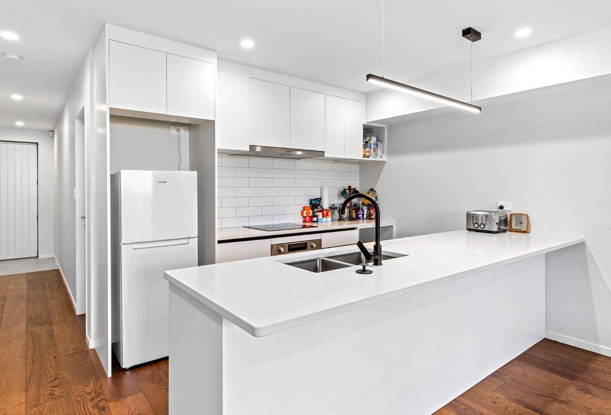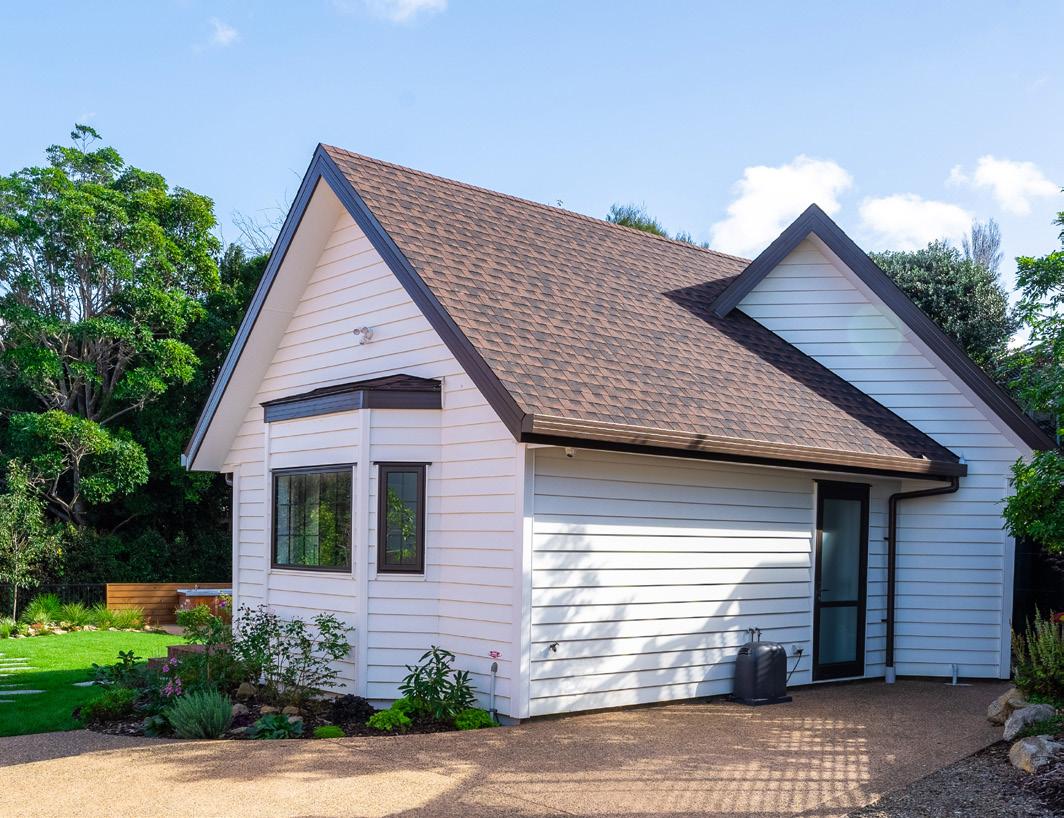 garage. A flush garage door matches the white timber exterior. Inside, the original house now contains three bedrooms, a study, bathroom and lounge, while the new build at the rear has a very modern feel.