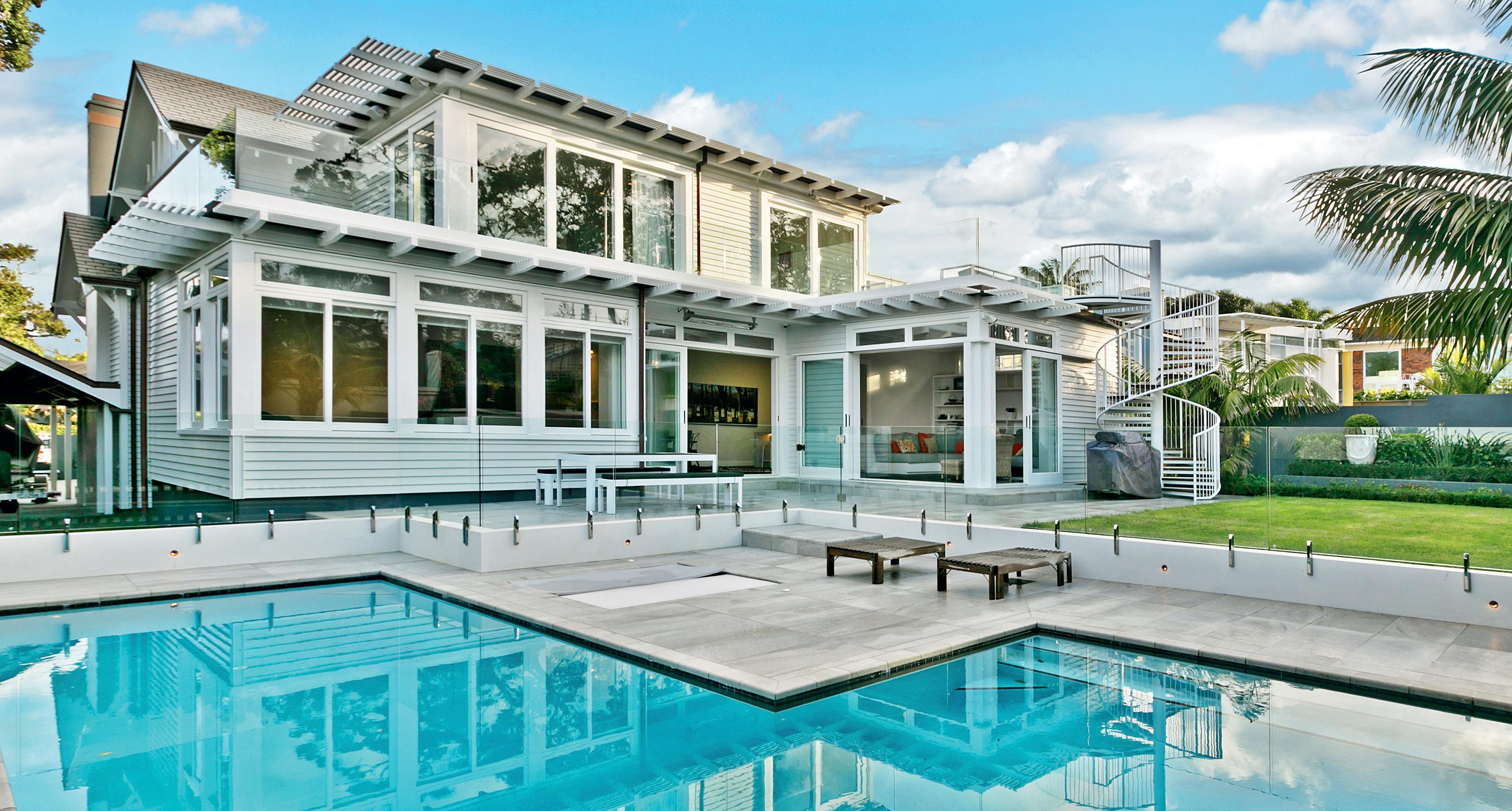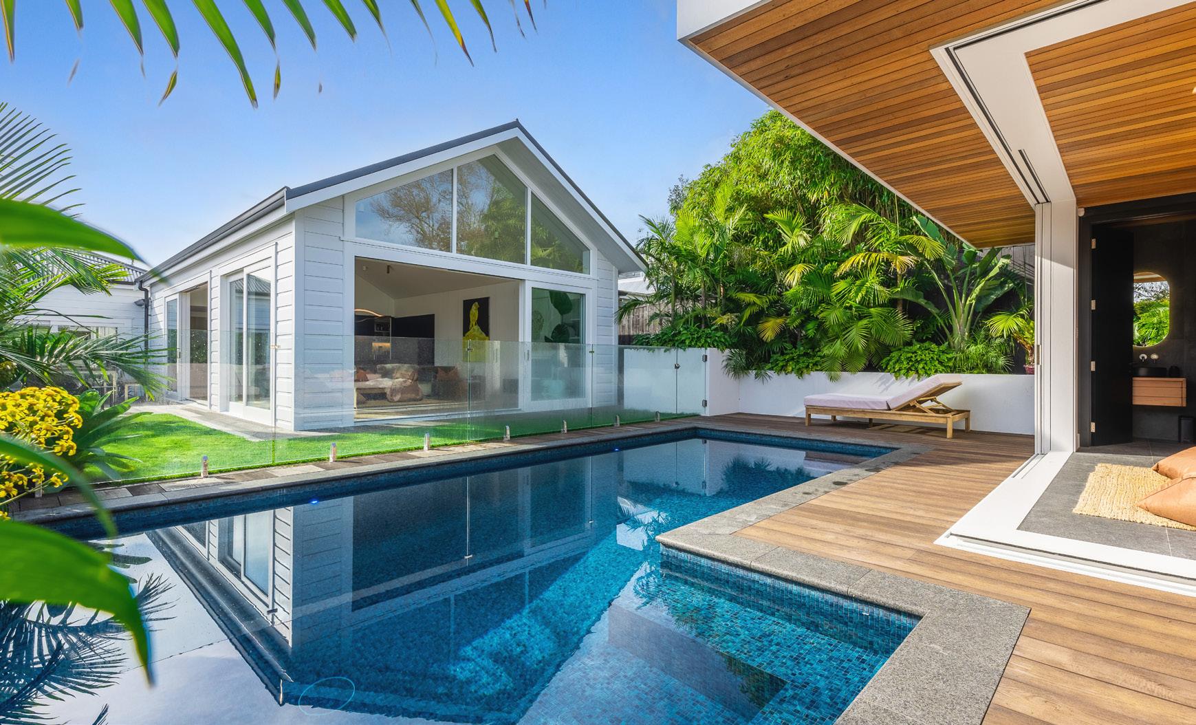 Arrive at this East Auckland property and you could be forgiven for thinking you’re in an exclusive tropical resort. It’s an oasis in the suburbs, a place where lush and luxury live together under palm trees and beside a swimming pool and tennis court.