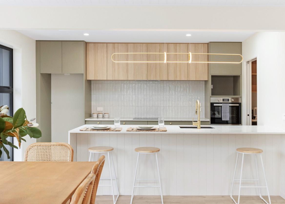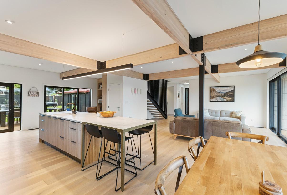 The open-plan downstairs level is inviting with timber ceiling beams, blonde flooring and kitchen cabinetry offset by industrial black steel columns. Sea-green finger tiles on the splashback keep the space fresh. Hurdles aside, the results of this build are clear: ultra-liveable spaces that feel like a permanent holiday. For more of this house go to houseoftheyear.co.nz