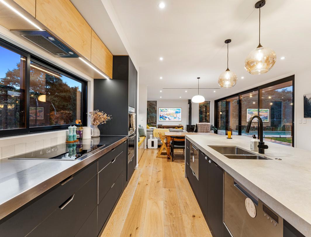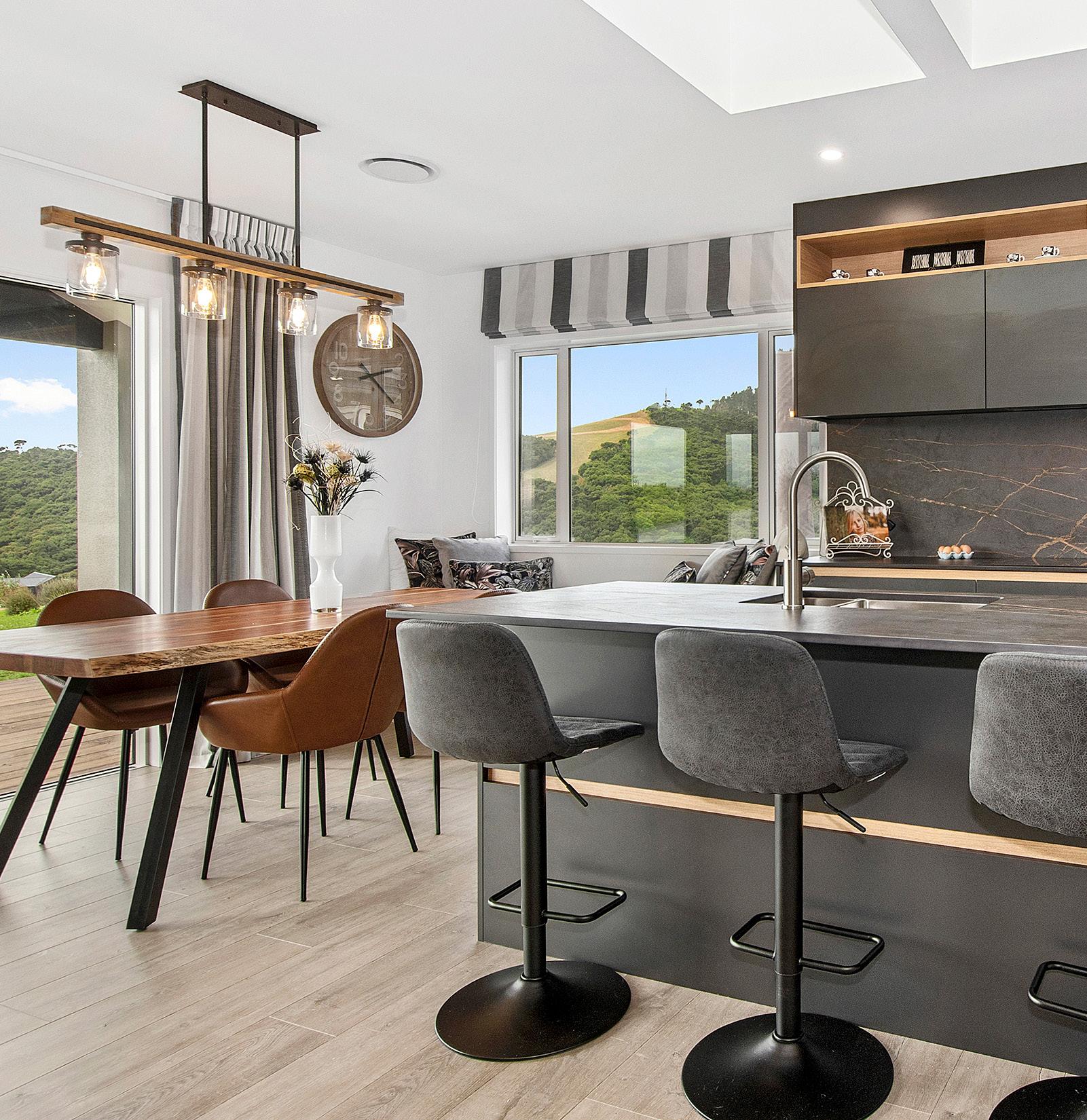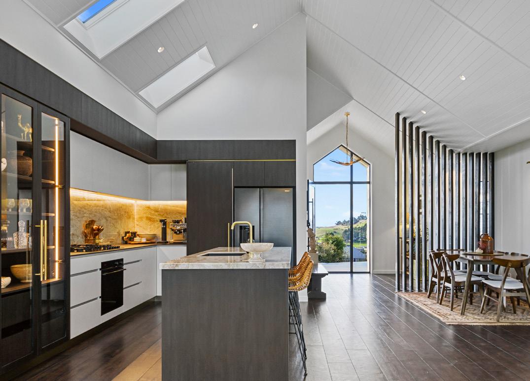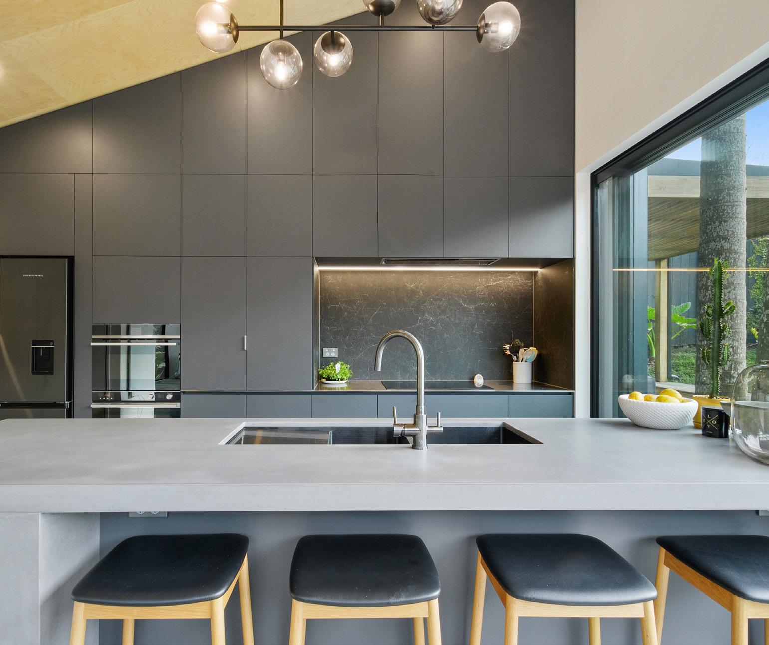 Take the short flight of stairs down to the kitchen and living area, built using recycled brick and kauri from the original home, but with a modern twist. The brick floor pairs well with the dark aesthetic of the kitchen, and the