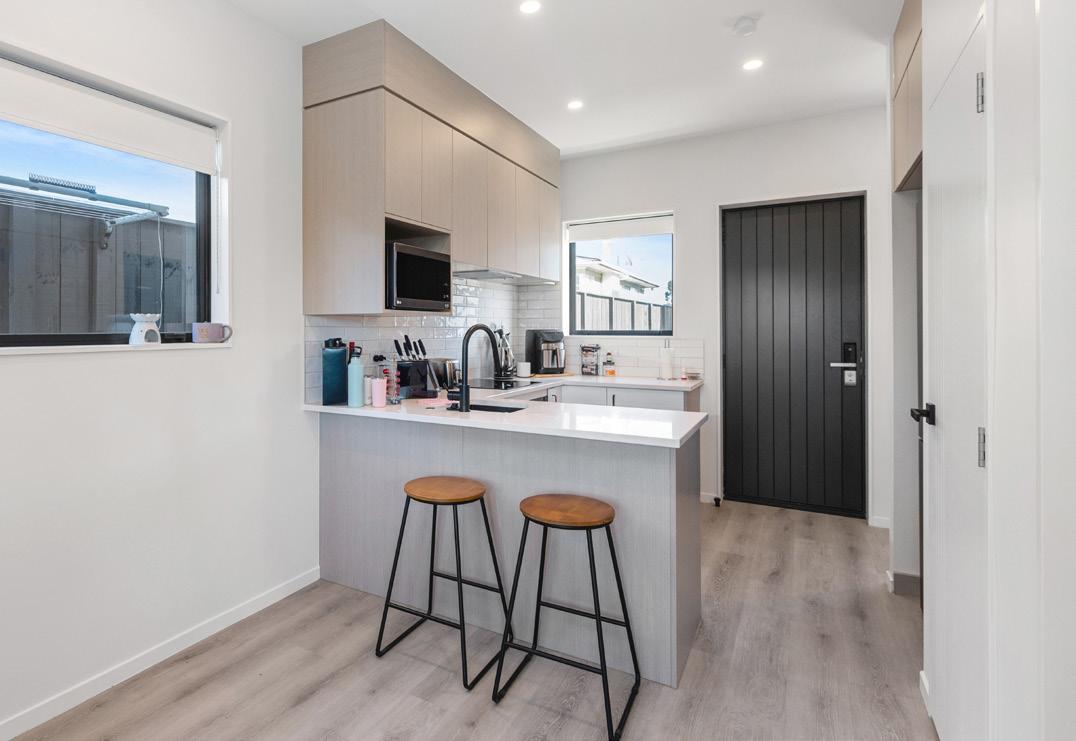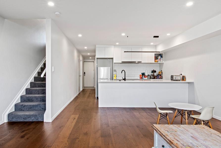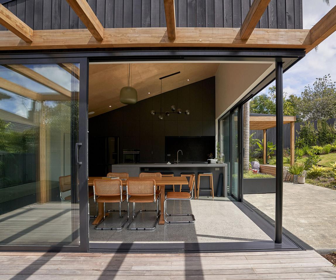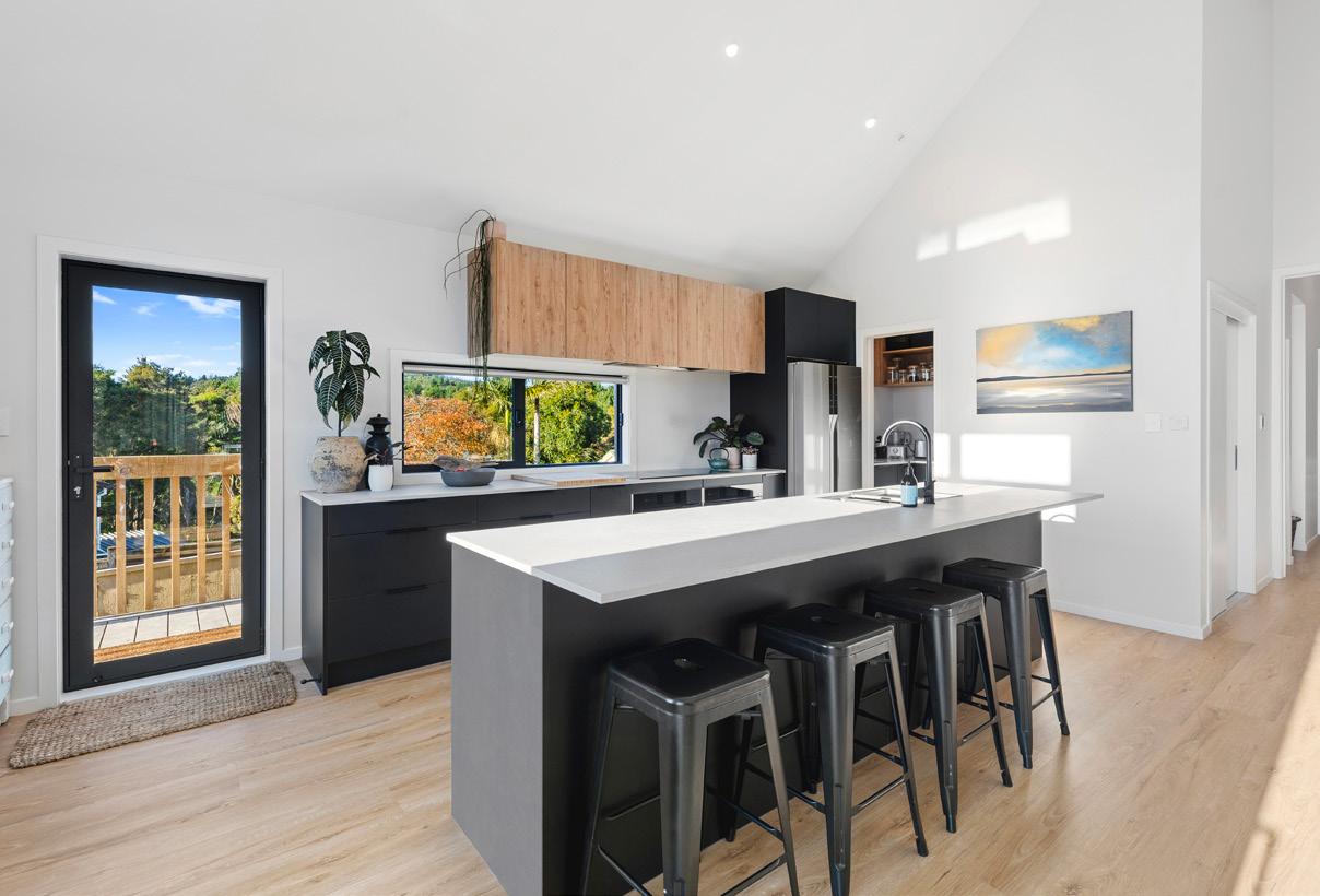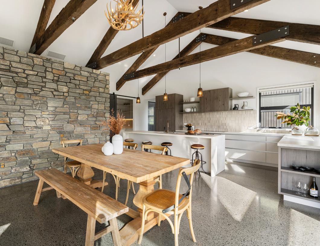 Take the short flight of stairs down to the kitchen and living area, built using recycled brick and kauri from the original home, but with a modern twist. The brick floor pairs well with the dark aesthetic of the kitchen, and the