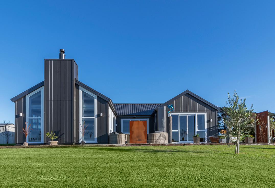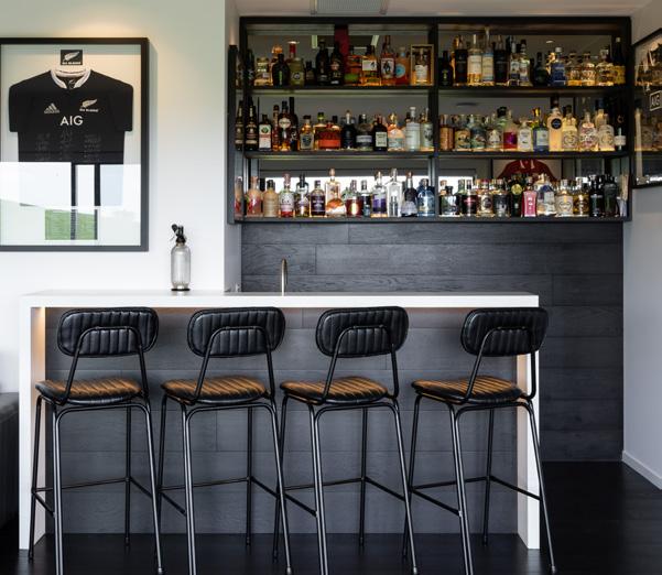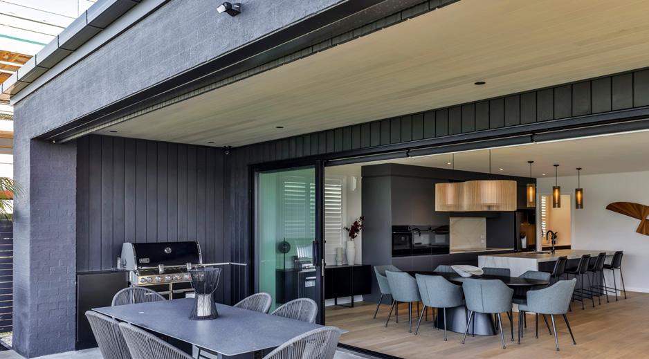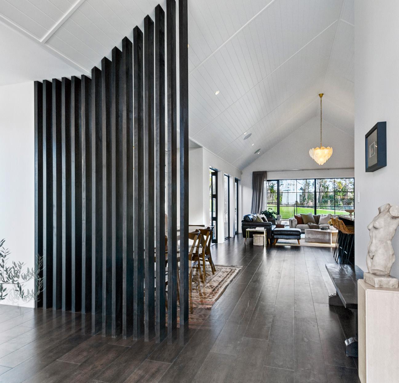 From the entry, your eyes follow the long hallway to the Balinese-style oasis out the back. On the way through the house you’ll notice myriad features, including shiplap weatherboards on the almost-five-metre-high gable ceiling, negative detailing between the ceiling and walls, secret doors hiding a mini bar, and a bespoke kitchen with scullery. The kitchen, lounge and dining space slide into decking with a wood-fired barbecue. This complex project has been rewarding — for the builders and owners alike. For more of this house go to houseoftheyear.co.nz