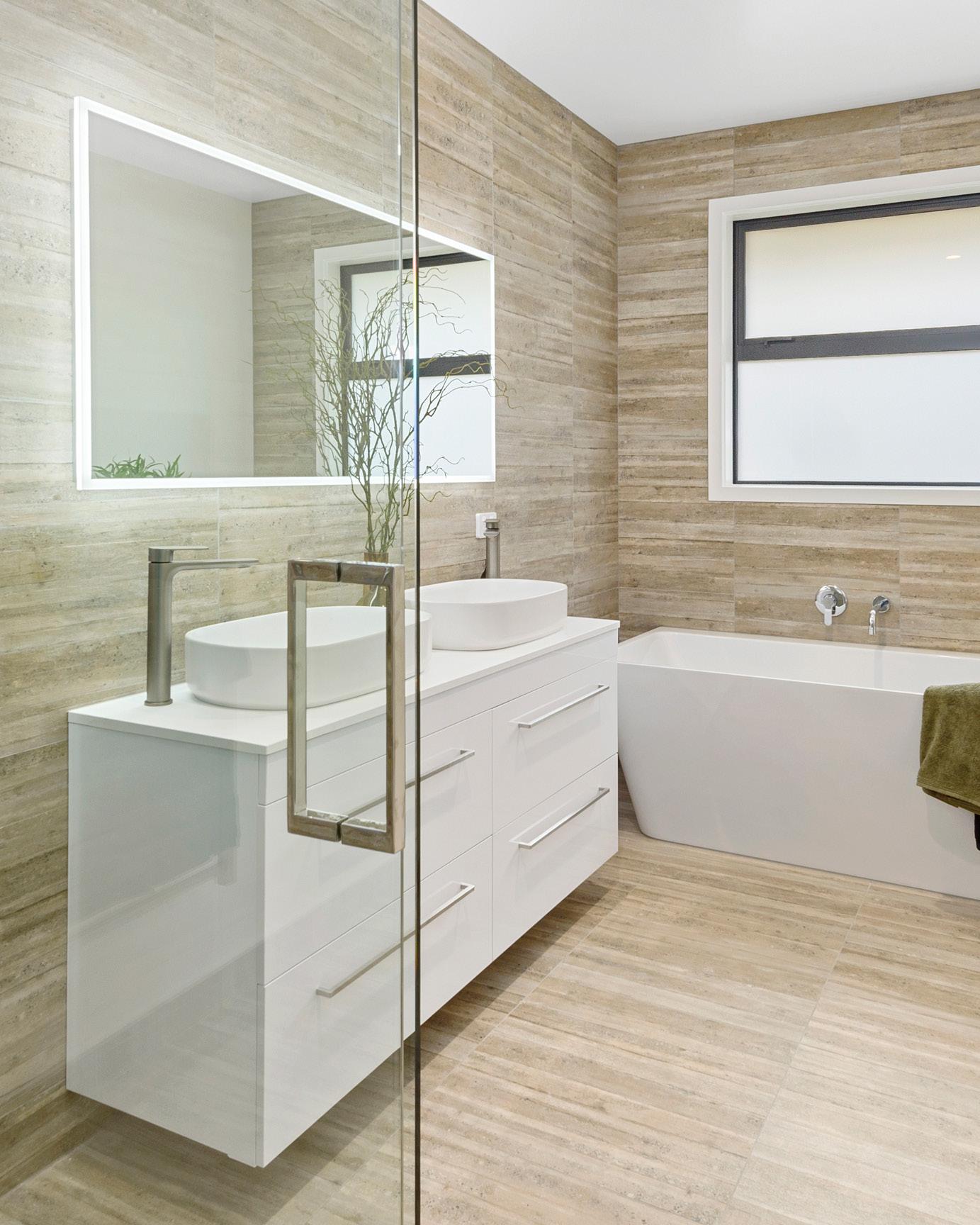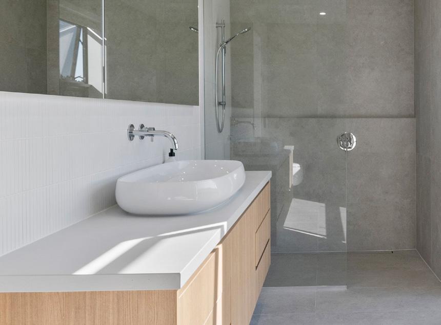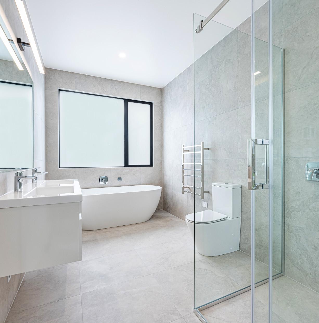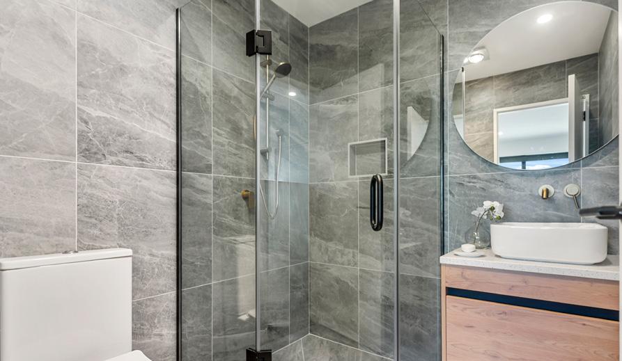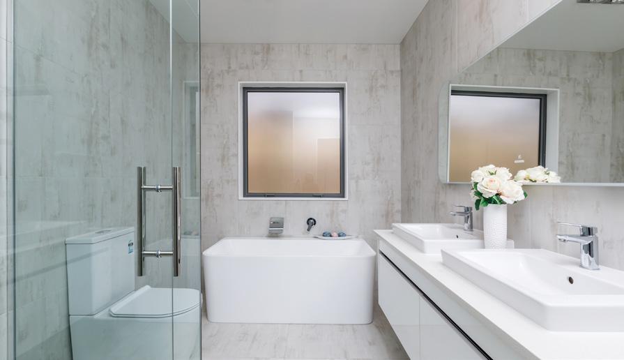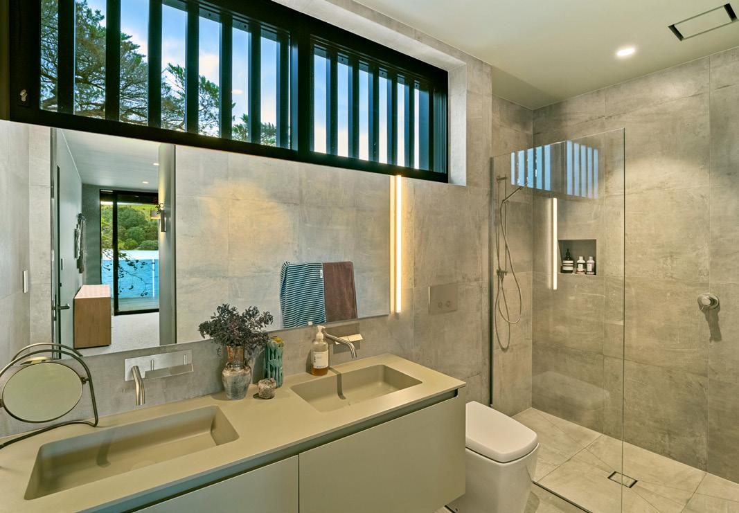 Materials define bathrooms, especially those in houses where no expense has been spared on luxury elements. The bathrooms in this Palm Springs-style house constructed by Kane Build Group on Auckland’s North Shore illustrate the point. The bathrooms speak the language of style, grace and understated luxe. In the main-bedroom ensuite, the restrained opulence has been dialled up a notch with a solid stone double vanity and standalone bath. For more of this house go to page 26.
