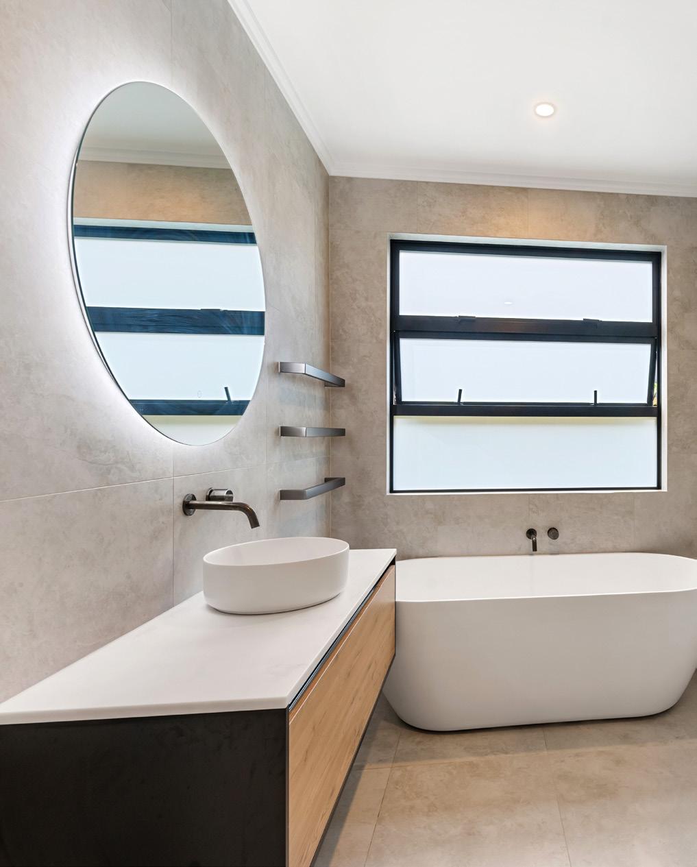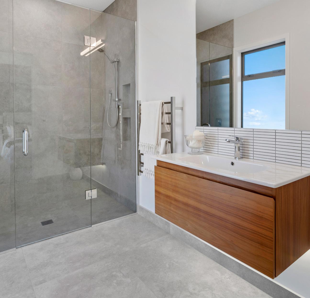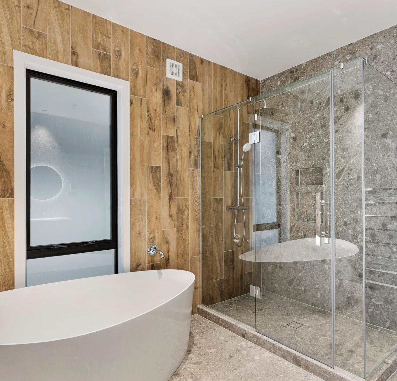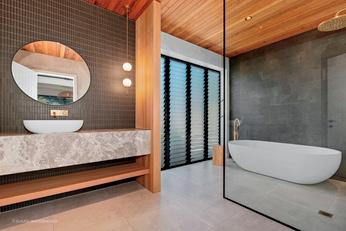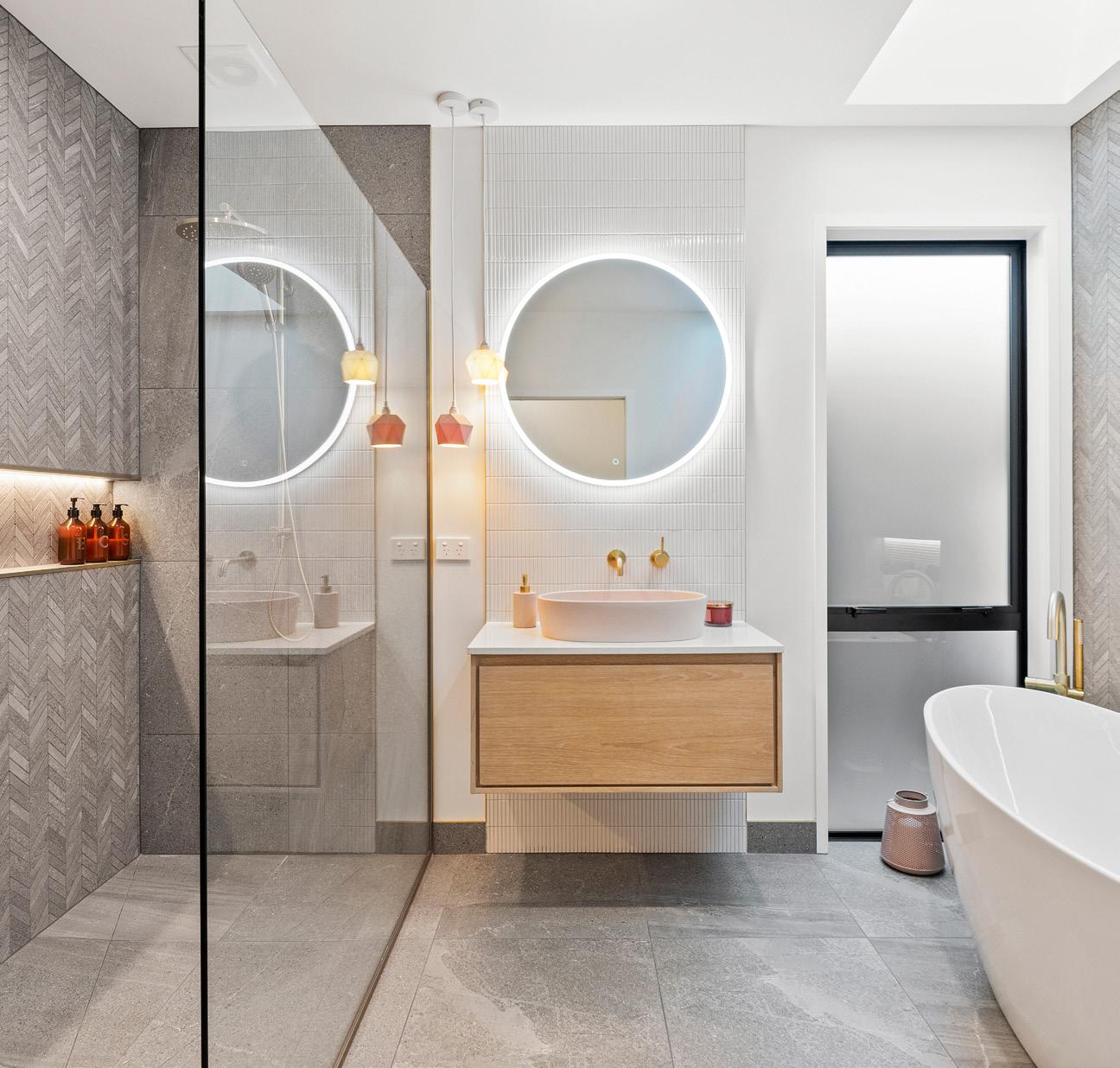 Materials define bathrooms, especially those in houses where no expense has been spared on luxury elements. The bathrooms in this Palm Springs-style house constructed by Kane Build Group on Auckland’s North Shore illustrate the point. The bathrooms speak the language of style, grace and understated luxe. In the main-bedroom ensuite, the restrained opulence has been dialled up a notch with a solid stone double vanity and standalone bath. For more of this house go to page 26.