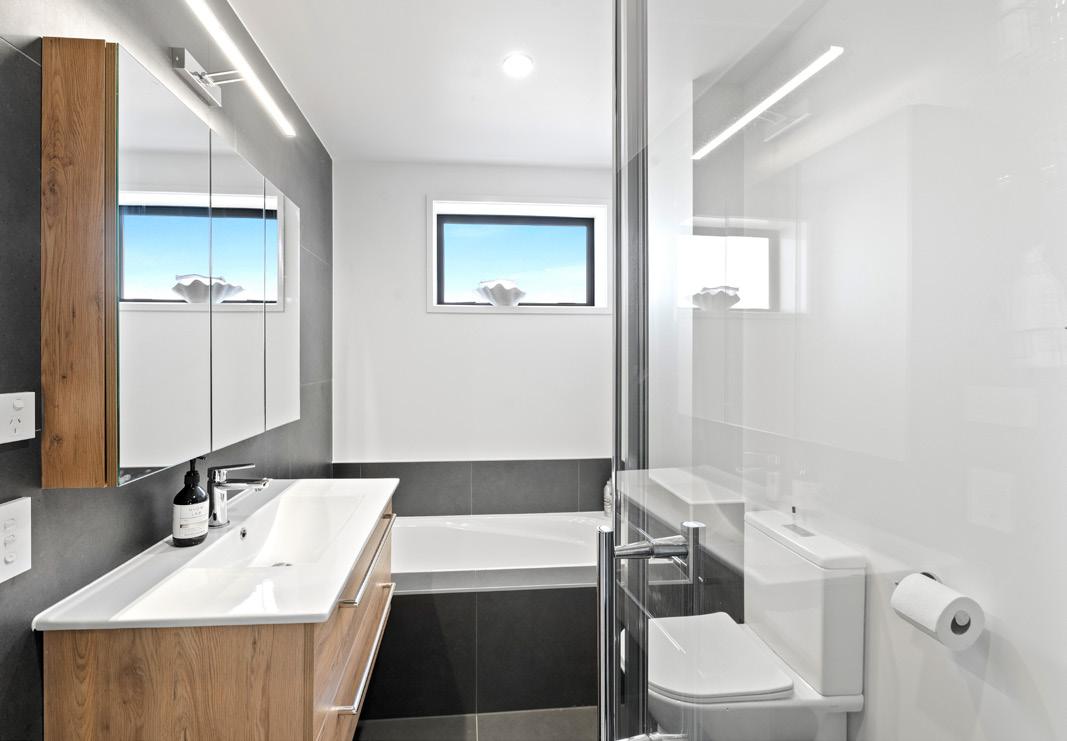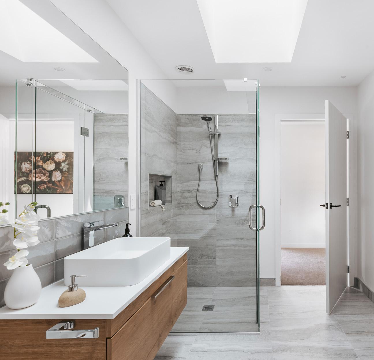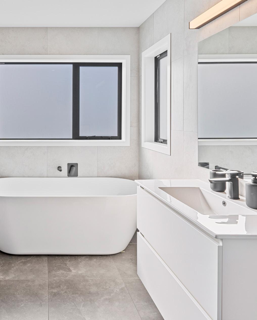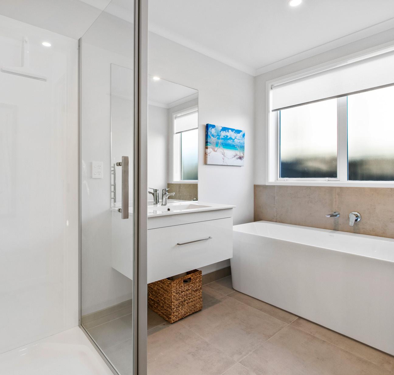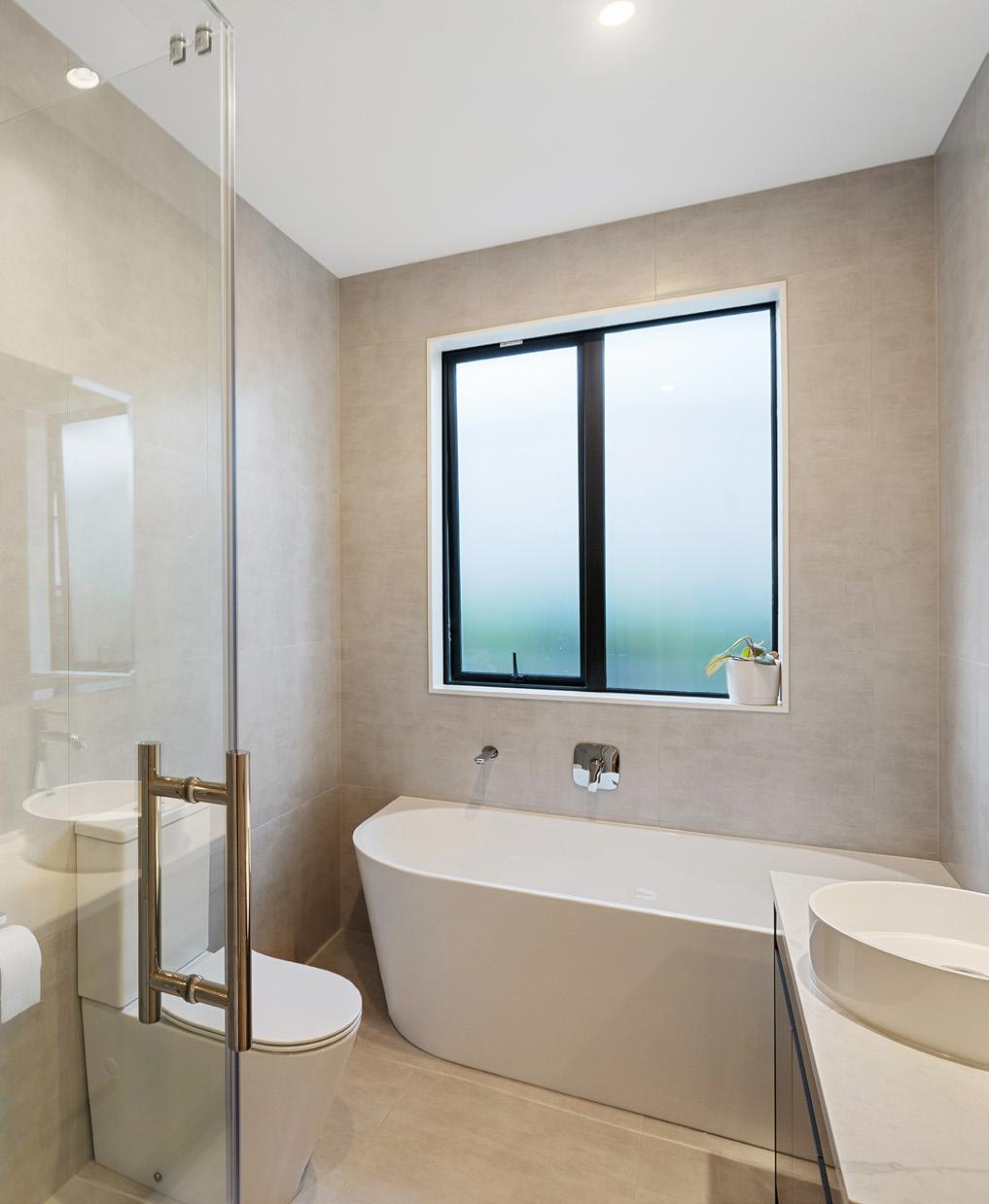 Materials define bathrooms, especially those in houses where no expense has been spared on luxury elements. The bathrooms in this Palm Springs-style house constructed by Kane Build Group on Auckland’s North Shore illustrate the point. The bathrooms speak the language of style, grace and understated luxe. In the main-bedroom ensuite, the restrained opulence has been dialled up a notch with a solid stone double vanity and standalone bath. For more of this house go to page 26.