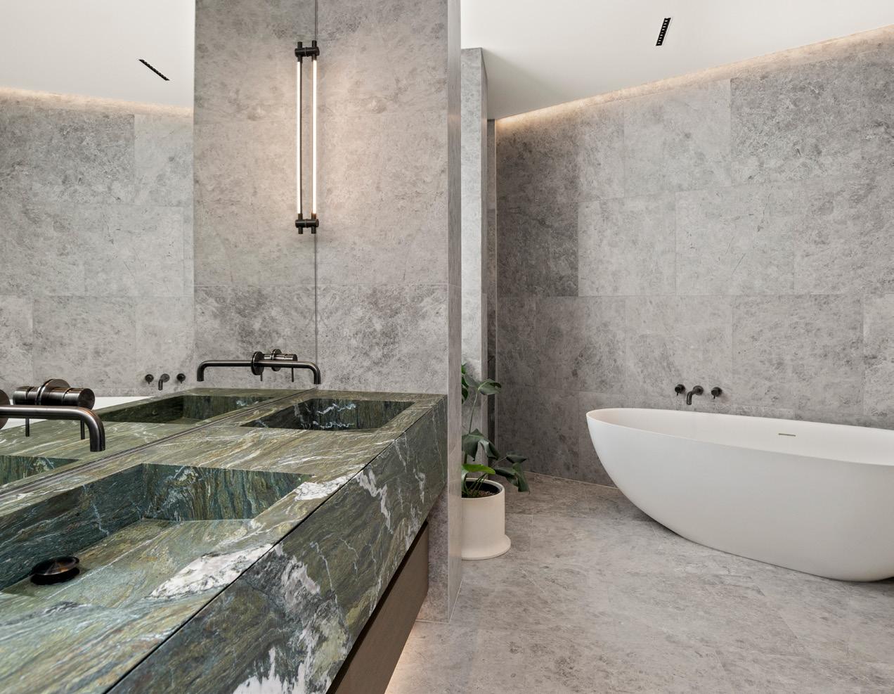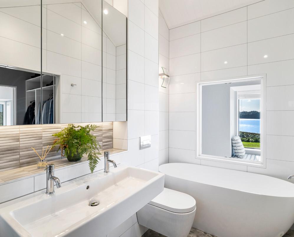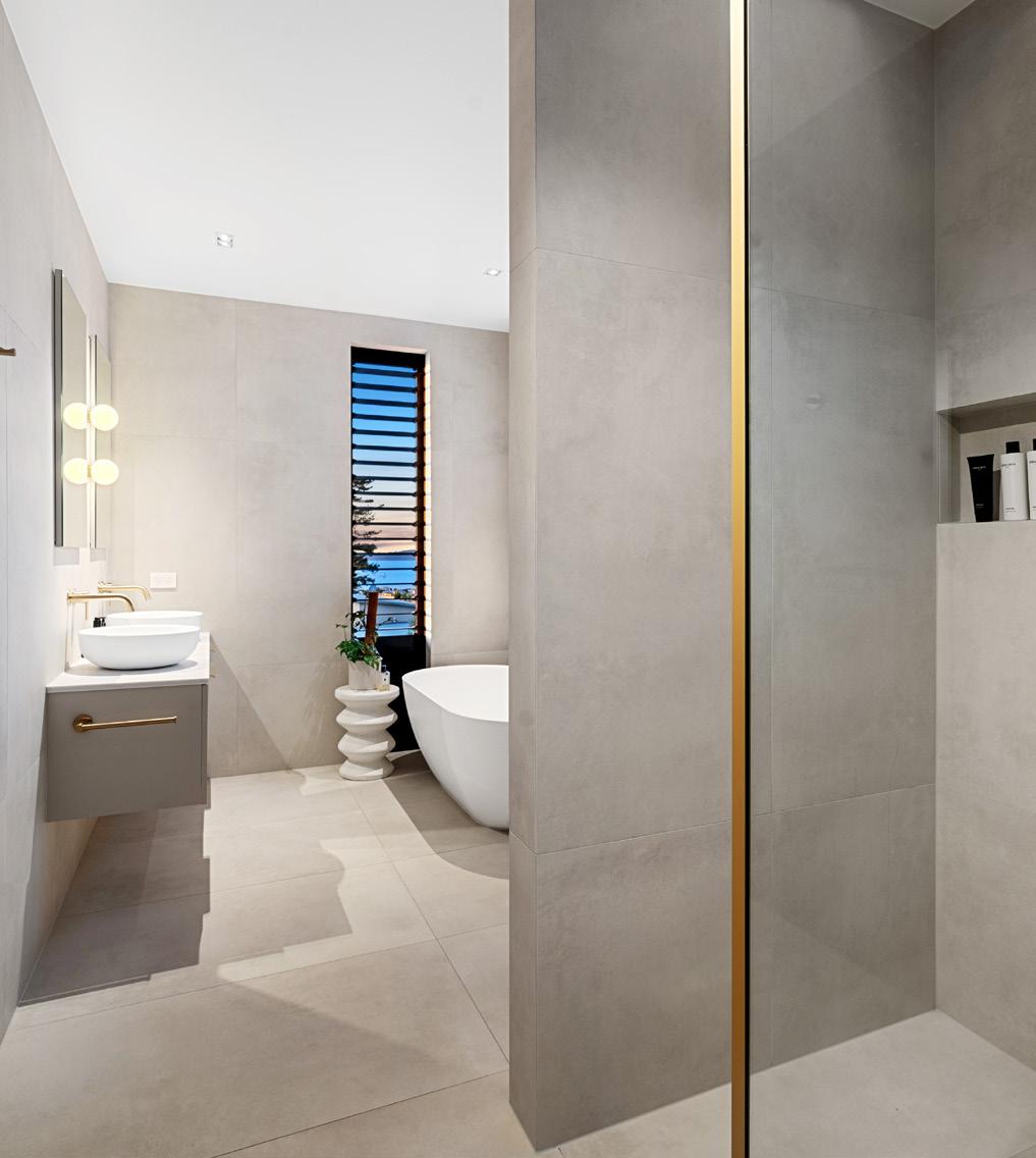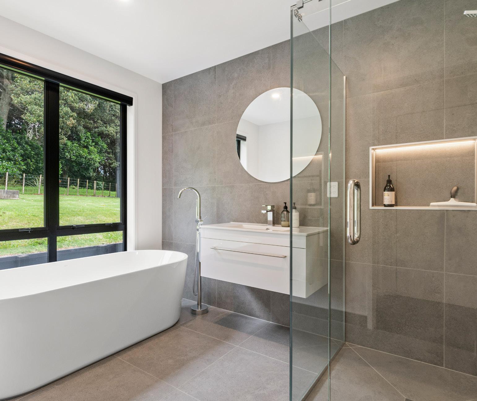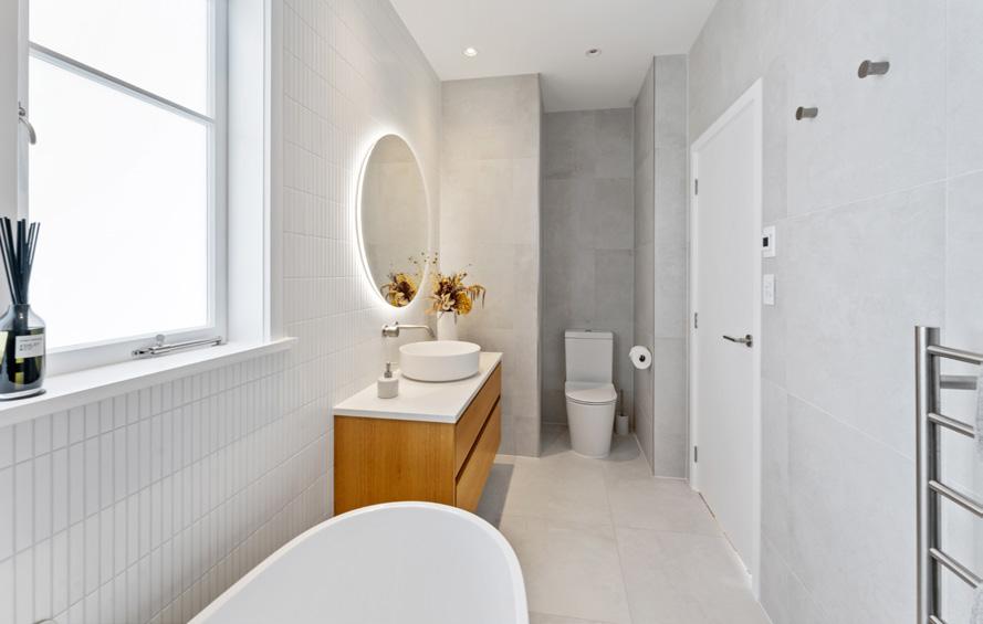 Materials define bathrooms, especially those in houses where no expense has been spared on luxury elements. The bathrooms in this Palm Springs-style house constructed by Kane Build Group on Auckland’s North Shore illustrate the point. The bathrooms speak the language of style, grace and understated luxe. In the main-bedroom ensuite, the restrained opulence has been dialled up a notch with a solid stone double vanity and standalone bath. For more of this house go to page 26.