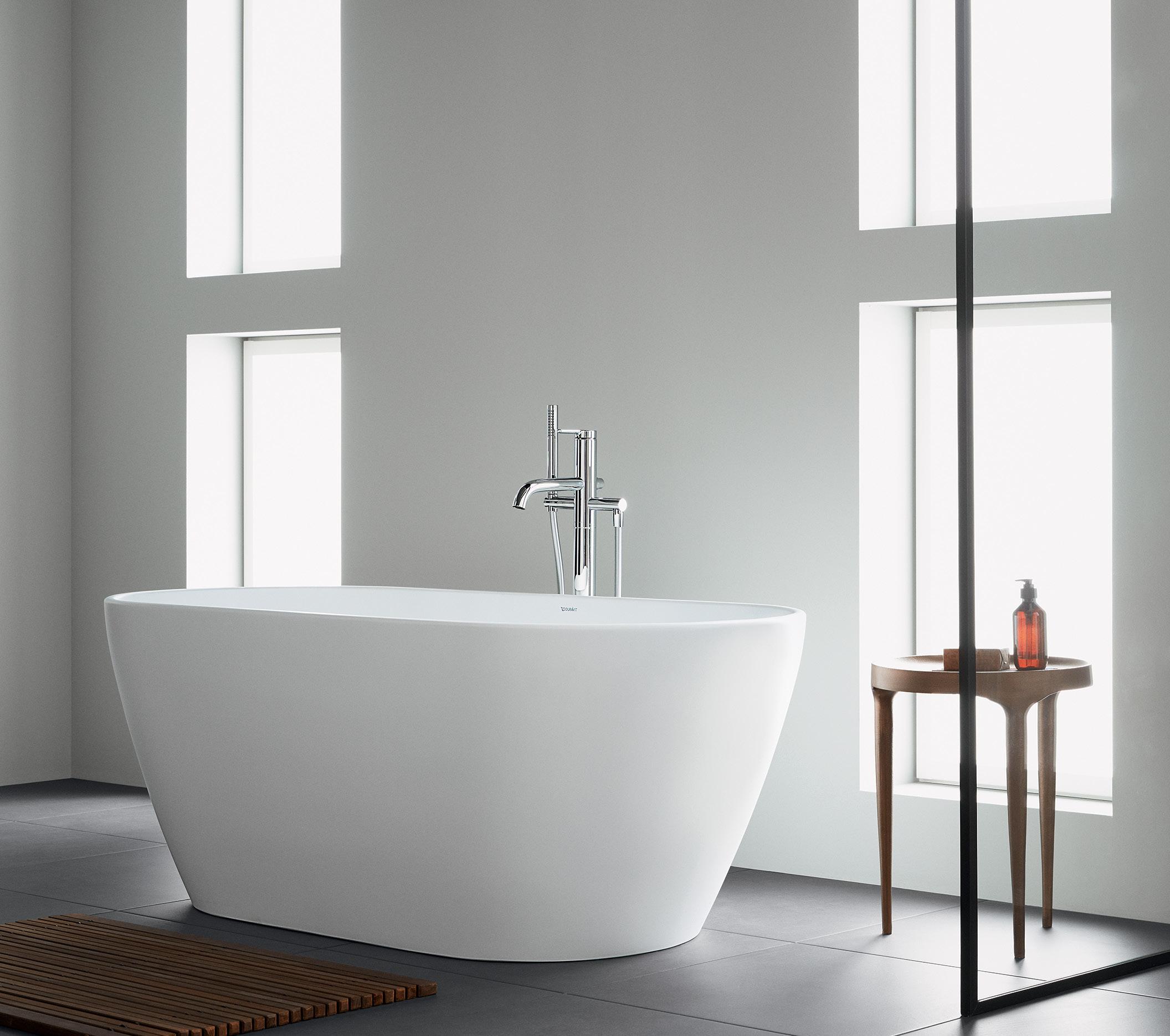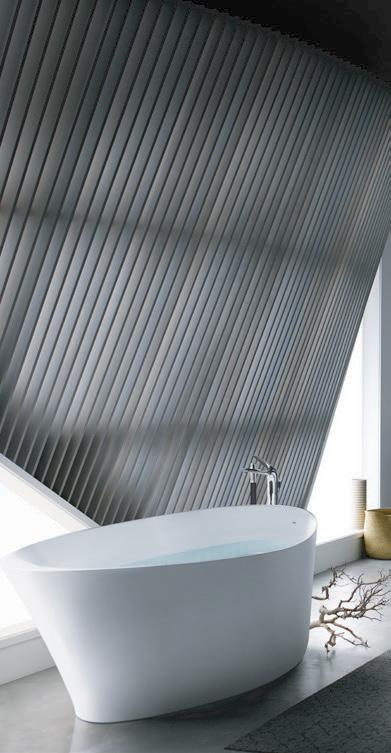 The elegantly angular D-Neo freestanding bathtub, $7764, from Plumbing World, not only makes a design statement but it also has a velvety texture that makes bathing feel luxurious.