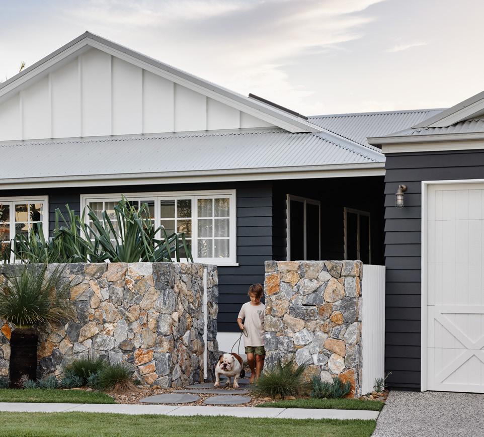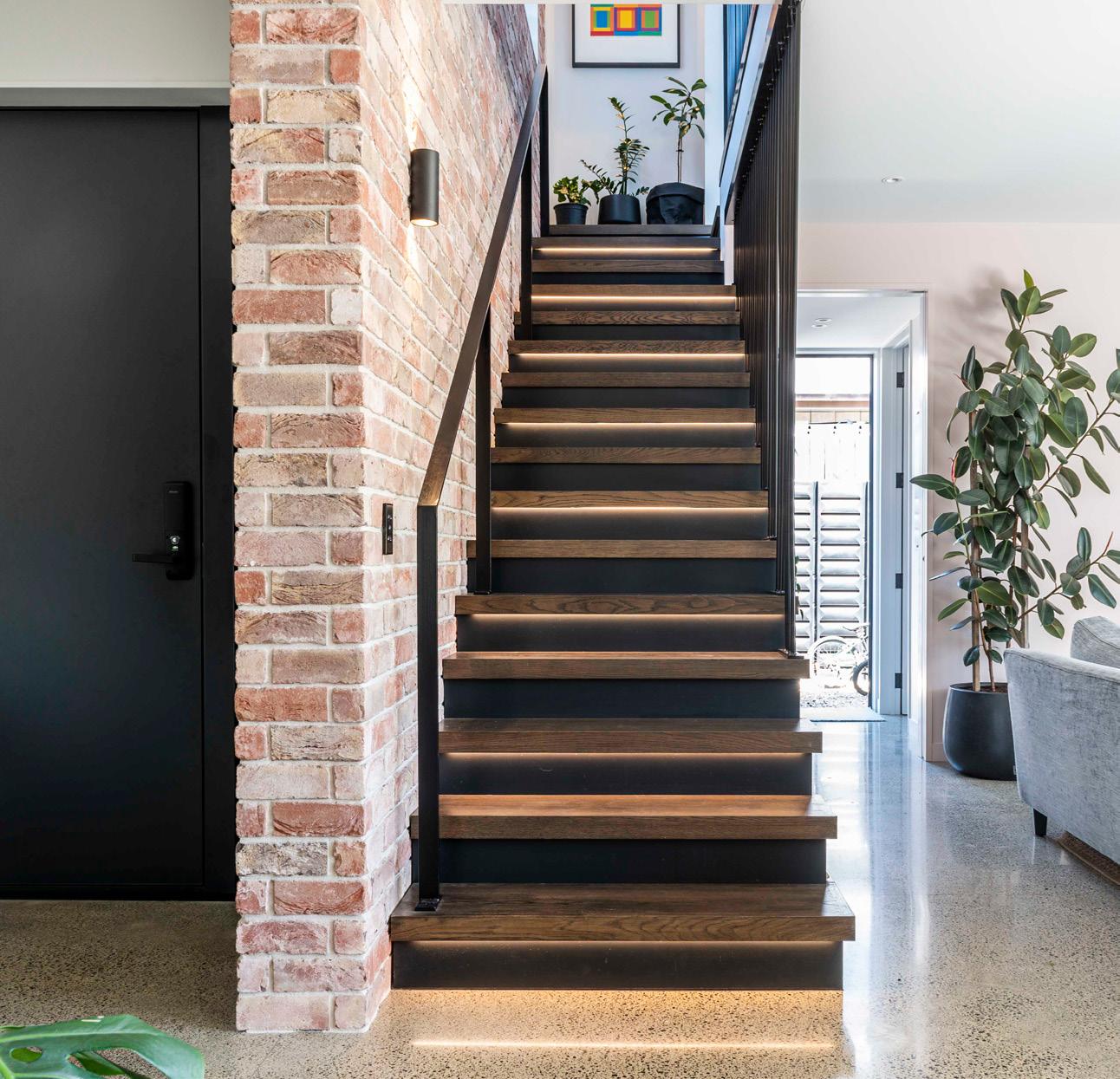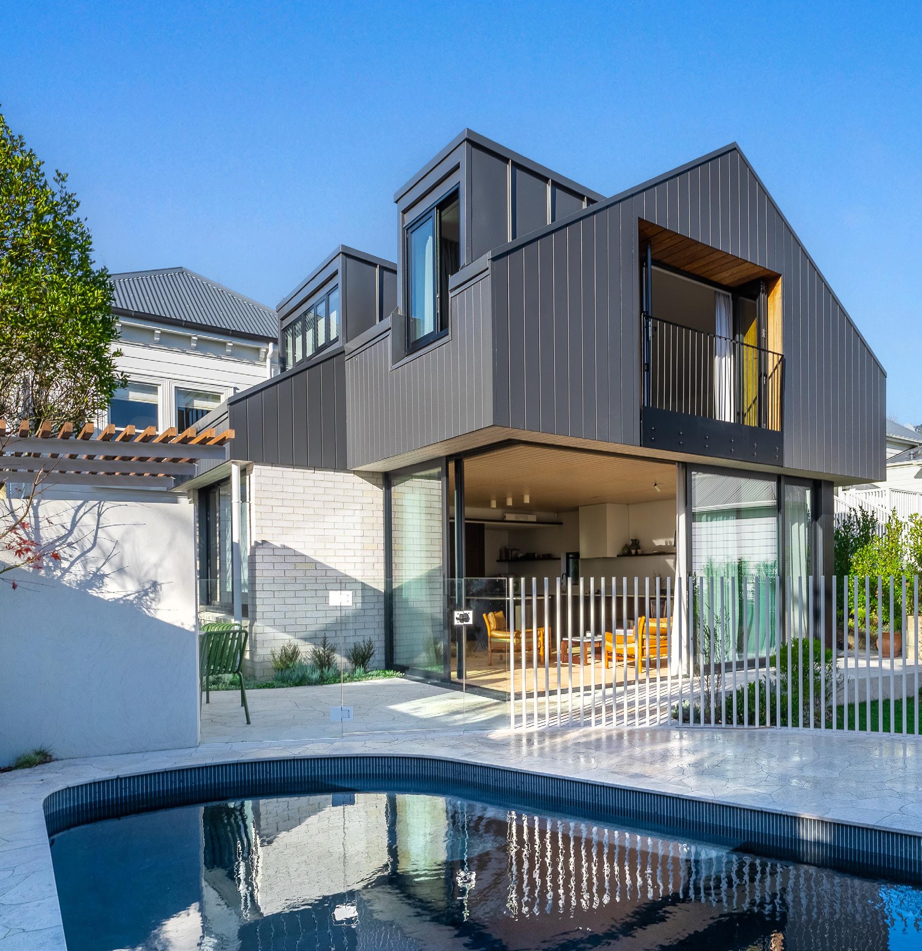 The exterior keeps to the heritage feel, with traditional timber weatherboards, small stepped gable details and stairs to the garden made from salvaged bricks.